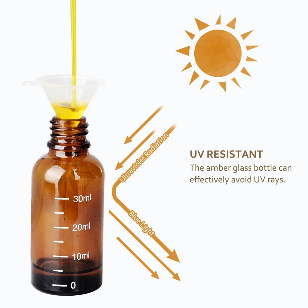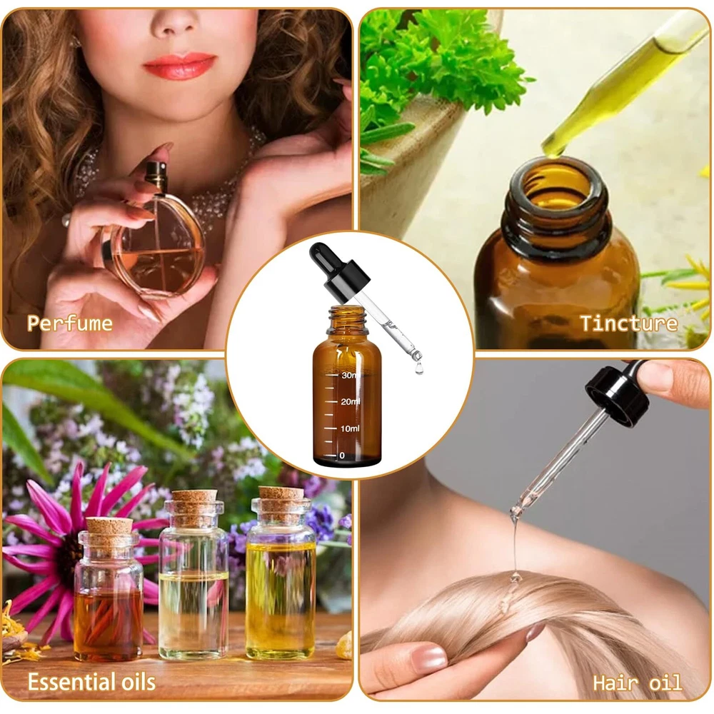 Includes: 4 pack 1oz (30ml)degree scale glass eye dropper bottles + 4pcs Dust Cap + 1 pack small funnels + 4pcs labels. High Quality Material :These oil dropper bottles are Made of thickened glass,thick plastic lids and corrosion-resistant silicone tops. UV RESISTANT:The amber glass bottle can effectively avoid UV rays, and ensure that essential oils and perfume are protected from UV rays damage and rapid evaporation. Widely used: Great for DIY essential oils, colognes ,cosmetics, perfume oils, tincture, beard oil, lab , hair oil or other liquids. Compact and convenient: These perfume sample bottles are small and easy to carry and store, making them ideal for travel.