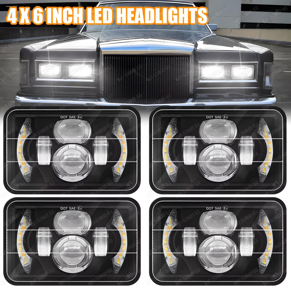 Package included: 2PCS 4x6 inch Led High Beam 2PCS 4x6 inch Led Low Beam 4PCS H4 plug adapters Description: Power: 60W/High Beam, 45W/Low Beam Lumen: 6000LM@High Beam 4800LM@Low Beam Voltage: DC 9-32V Color Temperature: 6000K~6500K Headlight Type: High beam + low beam Size: 6.7(length) x 4.25 (width)x 3.07 inch(depth) Lifespan: 80,000 hours Waterproof Grade: IP 67 Material: Aluminum Alloy + PC Lens Certification:DOT, SAE,E/emark Quantity Of Headlight : 2x High Beam LED Headlights + 2x Low Beam LED Headlights Fitment: Fit For Lincoln Town Car 1981-1989 Fit for Kenworth T800 T400 T600 W900B W900L Classic 120/132 HK Classic Fit for Feightliner FLD 120 112 Fit for Peterbilt 379 378 357 Fit for Ford Mustang 1979 - 1986 Fit for Ford Probe 1993 - 1997 Fit for Chevy Camaro Iroc-Z 1982 - 1992 Fit for Chevy Silverado V10 1987 Fit for Buick Electra 1975 - 1990 Fit for Buick LeSabre 1976 - 1986 Fit for Buick Regal 1982 - 1987 Fit for Buick Riviera 1975 - 1985 Fit for Cadillac Eldorado 1975 - 1985