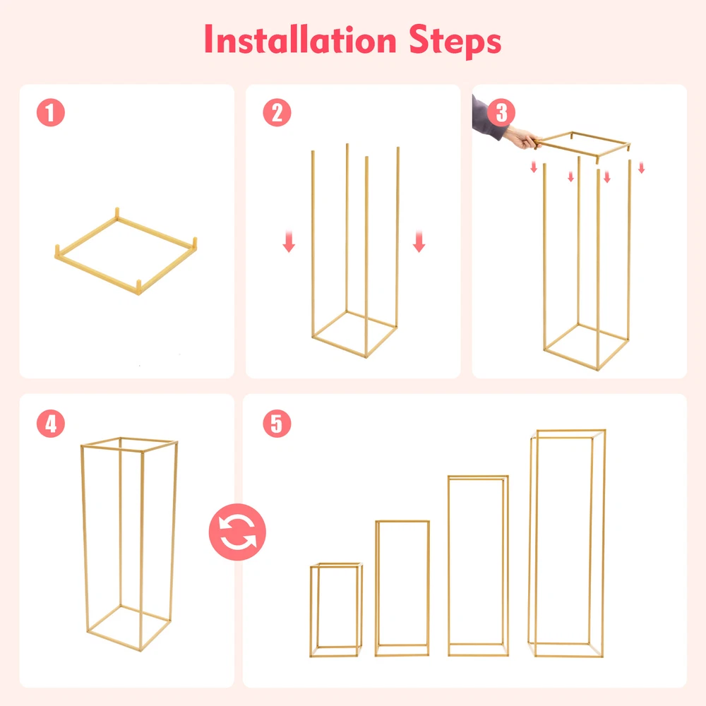 Description When facing parties, banquets, anniversaries, and other occasions, do you often worry about decoration? This flower stand set would be a good idea! It ideally combines simplicity, luxury, and charm. The sparkling gold creates a romantic atmosphere that immediately attracts attention and sets your event apart! Elegant design meets the requirements of various styles and activities, making your activities more unique, elegant, and attractive. Package Included 4*Flower Stands 1*Hammer 1*English Installation Diagram All Accessories for Assembly 4Pcs Gold Metal Flower Stand Flower Holder Display Shelf For Wedding Party Decor Description When facing parties, banquets, anniversaries, and other occasions, do you often worry about decoration? This flower stand set would be a good idea! It ideally combines simplicity, luxury, and charm. The sparkling gold creates a romantic atmosphere that immediately attracts attention and sets your event apart! Elegant design meets the requirements of various styles and activities, making your activities more unique, elegant, and attractive. Key Features Decoration Assistant: Elegant and simple rectangles and gold allow you to easily match different colored props and themed activities. As an accessory and display stand, it will easily create an elegant and romantic atmosphere! Different Sizes: The four independent flower stands have different sizes, creating a strong sense of hierarchy when placed together. They are separate, so you can decorate them with DIY bouquets according to your preferences to present a unique beauty. 4-piece Set: A size-strewn set of 4 pieces can meet your needs, allowing you to complete various decoration tasks for parties, banquets, and ceremonies in one consumption! DIY Fun: The hollow design provides more space to showcase your imagination and creativity. You don't have to follow the rules and only place flowers on the top, but decorate it comprehensively with flowers, green plants, balloons, decorative lights, etc. (not included), making it a unique background. Selected Material: This product is made of sturdy and durable steel, using high-temperature baking technology, and is equipped with thickened materials (1mm) and thickened pipes (10mm), which are not easily aged or deformed after long-term use. Stable Display: The rectangular structure provides greater stability, and the large base allows it to carry up to 22 pounds(each PC) of exquisite flowers or other decorations, ensuring the smooth progress of your important activities. Wonderful Gift: It is an ideal gift for friends because it is not only useful, but also an excellent decoration for weddings, birthdays, dates, Valentine's Day, Mother's Day, Christmas, and more. Easy to Store & Move: The design of easy assembly and disassembly allows you to store it without taking up too much space when not in use. The hollow-out design keeps its weight at 1.54~2.87 lbs (each PC), making it easy to move. Details Small Connectors: The more exquisite and compa ct connectors ensure smoother lines and a more elegant appearance when connecting the flower stands, making them even more stunning. Smooth Surface: The edges are smooth and free of burrs , protecting your hands from scratches and improving usage safety. Application They are ideal for decorating weddings, birthday parties, anniversaries, living rooms, bedrooms, offices, restaurants, reception tables, churches, school opening ceremonies, candy buffets, dessert tables, bachelor parties, store openings, baby showers, graduation parties, and other special events. How to Install Use the triangular connectors to install the upper and lower frames. Align the four long rods with the holes in the bottom frame and firmly insert them. Align the top frame with the four long rods and firmly insert them. Installation is completed. Specifications Material: Steel, Plastic Color: Gold Shape: Rectangle Style: Modern Surface Treatment: High-temperature Baking Paint Mounting Type: Desktop Placement, Freestanding Assembly Required: Yes Number of Items: 4 Each Maximum Bearing Capacity: 10kg/22lbs Gross Weight: 4.5kg/9.92lbs Net Weight: 4.1kg/9lbs Wall Thickness : 1mm Tube Diameter: 10mm/0.39in Product Size: 21*21*40cm/8.26*8.26*15.74in; 24*24*60cm/9.44*9.44*23.62in; 27*27*80cm/10.62*10.62*31.5in; 30*30*100cm/11.81*11.81*39.4in Package Size: 101*11*7cm/39.76*4.33*2.76in Package Included 4*Flower Stands 1*Hammer 1*English Installation Diagram All Accessories for Assembly Notes Please note that no decorations are included in the package. Please allow the slight color difference caused by the shooting light and 1-3cm error due to manual measurement, and make sure you do not mind before you order. Payment Delivery details Terms of sales About us Contact us Payment We accept ebay payment 。 Fees such as import duties, taxes are not included in the item price or shipping costs. These charges are the buyer's responsibility. Delivery details Shipping: 2-9 working days to: USA Terms of sales We maintain high standards of excellence and strive for hundred percent customer satisfaction. Feedback is very important to us. We hope that you contact us immediately before you give neutral or negative feedback, so that we can address your concerns. It is impossible to address issues if we do not know about them! About us Your satis faction is our ultimate goal. We work hard to earn your trust and future business. Our certified technicians have tested each item before shipping. The unit comes with 1 year limited warranty on all manufacturing defects. a) If you receive a defective item, you may return it or ask for a discount. Please contact us within 14 days after you receive the package. b) What you returned must be intact and in its original packaging as re? u. Customer is responsible for shipping costs of the returned item. c) We will cover the cost of shipping back t with the shipping rate indicated in the registration page. We will send you a new unit or ref