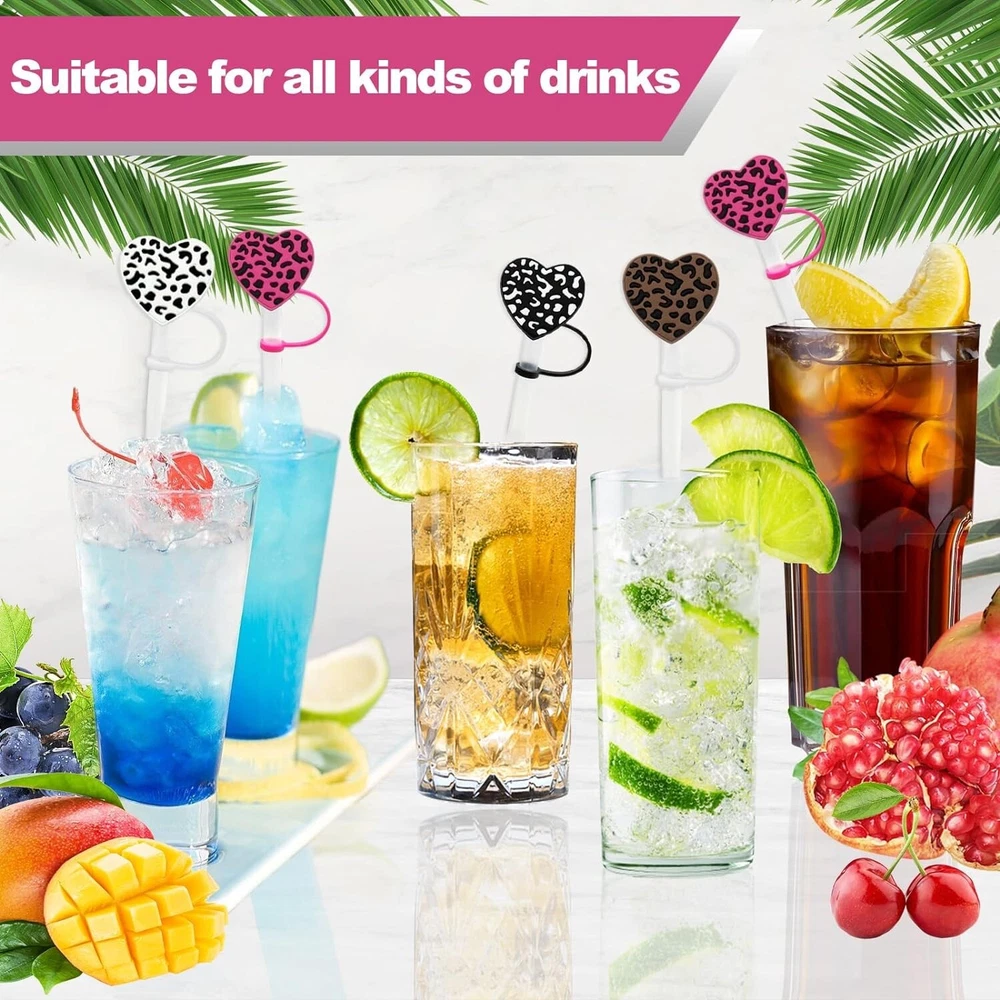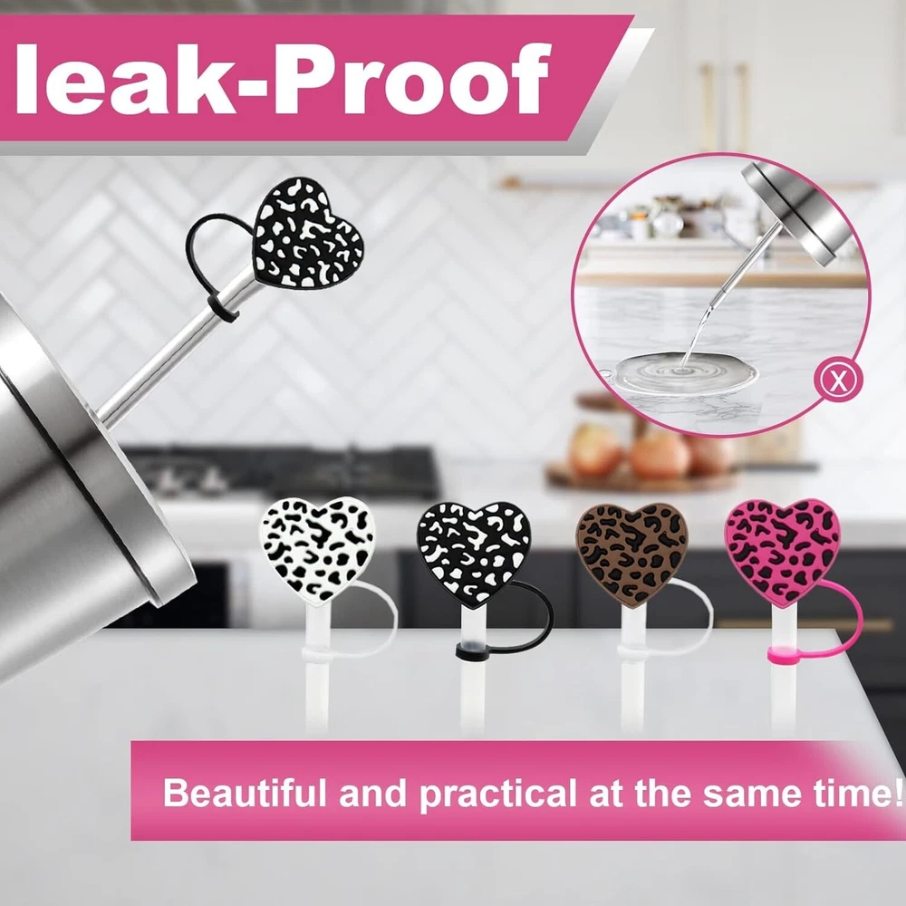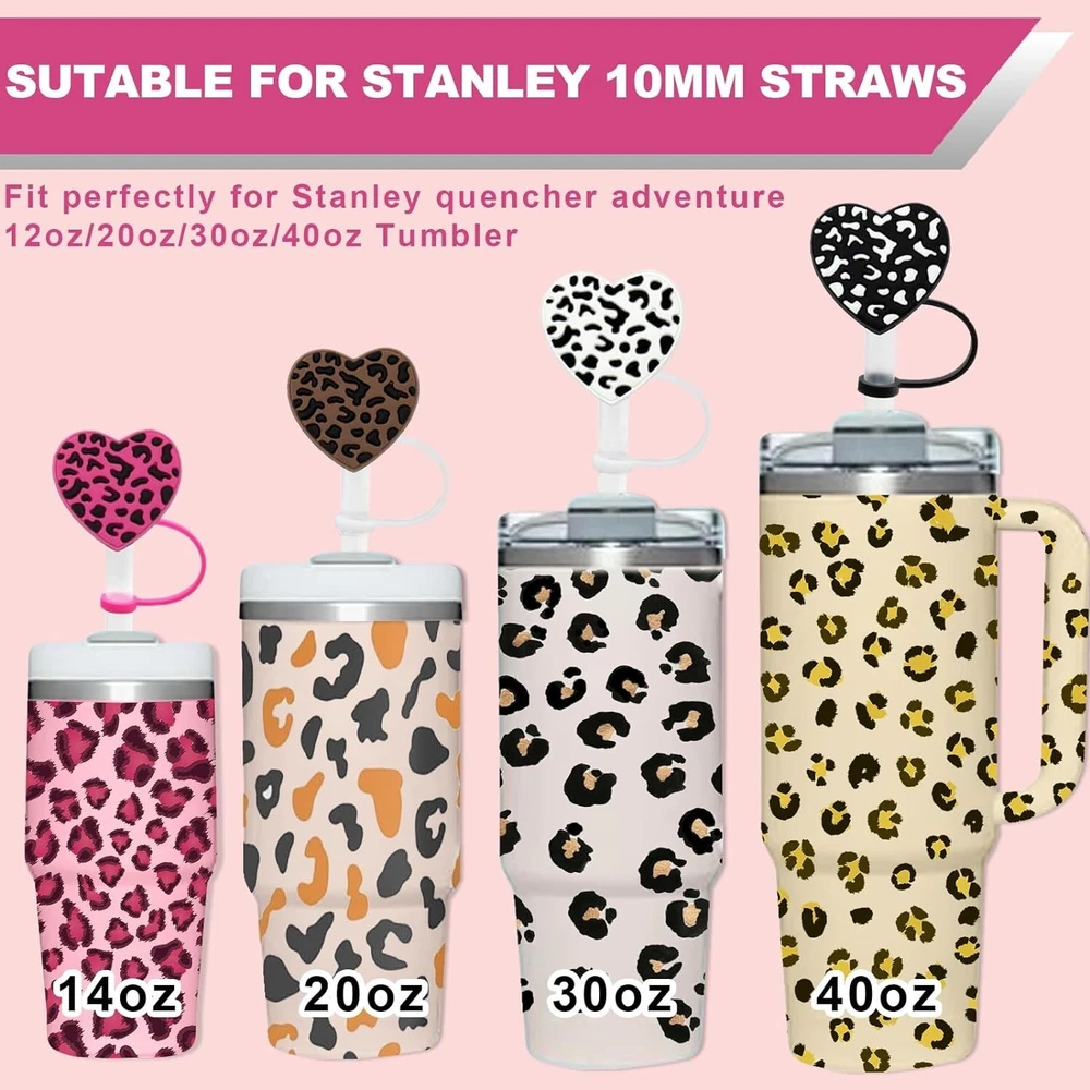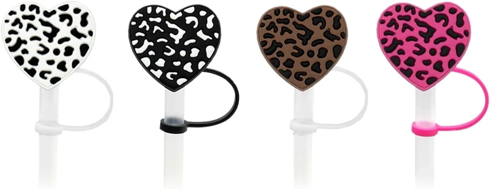 4Pcs Straw Cover for 40oz & 30oz Tumbler, 10mm Leopard Straw Covers Reusable Straw Tips, Straw Toppers for 40oz Cups Accessories β¨ π - - 10mm leopard Straw Covers: leopard straw cover is compatible with all type diameter includes 20oz, 30oz, 40oz Tumbler, cups etc. it's right size straw accessories of your Tumbler. please note that package only includes straw covers, straw is not included. β¨ π - - Protect Your Drinks: The straw cap prevent dust, pet's hair,mosquitoes entering your cups. prevent your pet from licking your straws. when you bring your cup outside, the straw topper seal your straw perfectly,It prevents drinks from spilling during moving, especially suitable for outdoor activities. β¨ π - - Safety Material: The heart leopard design straw covers are made of food grade silicon, which is no-toxic, no smell, cold and heat resistant, safe for long-term use. it's reusable and dishwasher washable. β¨ π - - Easy to Use: The silicon straw tips consist of the bottom part of the retaining ring and the top part of the cap stopper and connected by silicone thread in the middle . Bottom part can be directly fixed on the straw, when you drink, pull the top part out, when you're not drink, put the top cap back. β¨ π - - Cute Gifts: The straw cover set includes 4 pcs heart leopard deign straw toppers. they are creative decorations for your straw cup. Suitable for all kinds of parties like straws party and wonderful gifts for friends and family. Upgrade your straw game with the 10mm Straw Cover Set and enjoy both style and functionality. Order now and make a statement with your Tumbler!