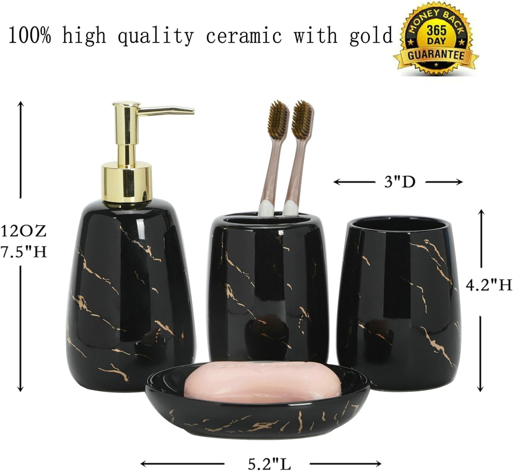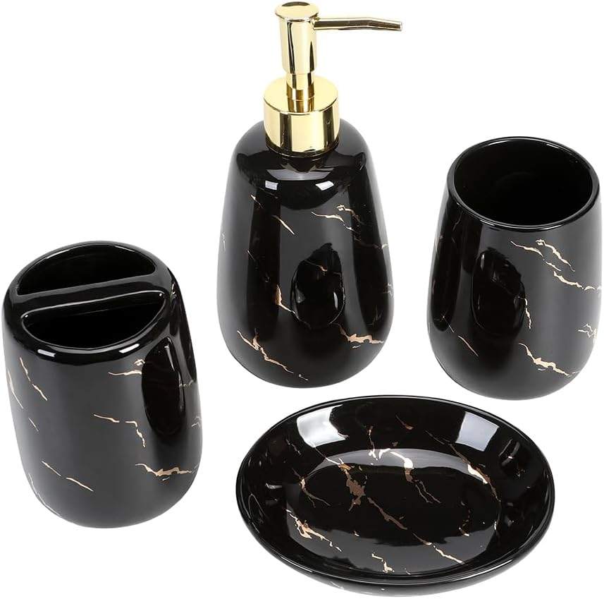 100% Ceramic Complete Bathroom Accessories Set -- 4 pieces bathroom soap dispenser set includes a dispenser pump, a toothbrush holder, a tumbler, a dish. Perfect for storing your toiletries and keep your bathroom counter fully organized neatly. Classic Design -- Unique marble look design. Outfit your new bathroom or upgrade your current bathroom accessories set with its exquisite design, giving your bathroom a touch of elegant style. Premium Materials -- All pieces of bathroom sink set made of high-quality ceramic, perfect for daily uses, simply rinse and wipe with a soft cloth. Ideal for Gift -- This set is a wonderful housewarming present. Perfectly gift for your friend, family, business partner. The 4 piece kit is both useful and will beautify the home - the best choice! 100% Customer Service -- We are committed to presenting the best quality materials and satisfaction services to our customers. If you have any issue with the contemporary bathroom accessories set, and Fully refund or Free replace. We are small family business, all our products desinged and produced by ourself. We have our own brand. We are trying to make our products in best quality with best price for customers. Please feel free to if there is any requirements. Thank you for your support on our small business. God bless you and your family.
