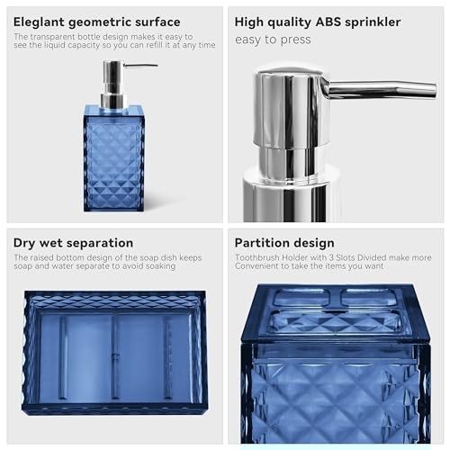 Return Policy Fast Delivery Trusted seller Bathroom Accessory Set, 4 PCS Blue Bathroom Accessories Sets, Soap Dispenser and Toothbrush Holder Set, Soap Dish and Mouthwash Cup, Boho Bathroom Decor, Bathroom Sets Accessories Product Description Plastic Diamond Pattern Design: Diamond represents luxury and shining. Our 4pcs bathroom accessory sets adopt diamond pattern design, which can not only enhance the aesthetic value of the bathroom suit, but also add more flash points to your bathroom. You have several color options, the bathroom accessory set is suitable for various bathroom themes Sturdy And Safe Material: Our bathroom set accessories are made of premium plastic, easy to clean, sturdy, and durable, making your bathroom out of the ordinary Bathroom Soap Dispenser And Toothbrush Holder Set: The soap dispenser pump is easy to press, will not leak, is sturdy and durable, and has a long service life. Great for liquid hand soap, dish soap, lotion, shampoo, body wash, hand sanitizer and more. Our toothbrush holders fit most sizes of electric toothbrushes, toothbrushes, toothpaste tubes and razors. The thickened plastic material ensures it's shatterproof, can withstand drops well 4 PCS Bathroom Accessory Set: Includes 1 x soap dispenser, 1 x toothbrush holder, 1 x soap dish and 1 x mouthwash cup. Our modern bathroom accessories set keeps the bathroom organized and has a minimalist design that perfectly complements your bathroom decoration Ideal Decoration For Bathroom: Classic blue color and silver cover form a very simple decorative element that harmonizes with most styles, adding a more modern or fashionable touch to your home Giftable: Functional and beautiful design makes these 4 pieces of bathroom accessories set a great gift for a housewarming, wedding, birthday, Mother‘s Day, Thanksgiving Day, Christmas, and also for mom, sister, colleague, and friends Shipping Returns Payment Shipping Shipping is FREE to all addresses other than APO/PO boxes in the lower 48 states. All our stock ships from US-based warehouses. Shipped via USPS or UPS (depending on location and package weight) Unless stated otherwise, all orders will ship within 24-72 hours of your payment being processed. Check our feedback to see the great reviews of FAST shipping we offer. Returns Seller does not accept returns Payment We currently accept payment via eBay managed payments only. Once payment is cleared, we will dispatch your shipment within 1-3 business days. Please refer to the "Shipping" tab for more information regarding shipping speed to your destination.