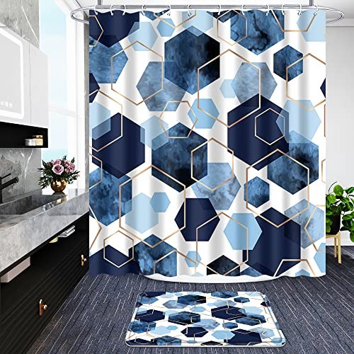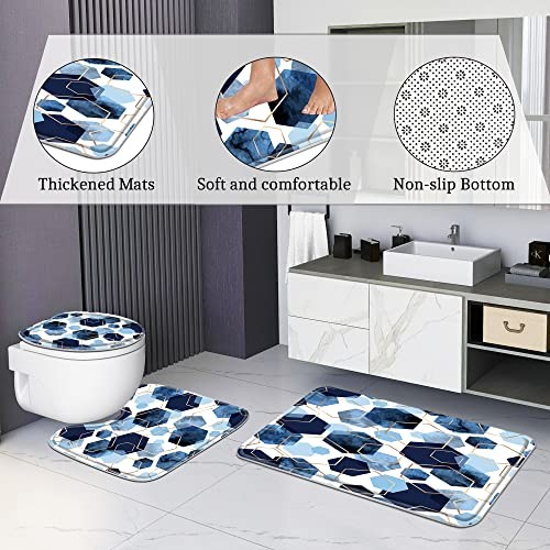 4-Piece Blue Marble Bathroom Set with Shower Curtain and Rugs