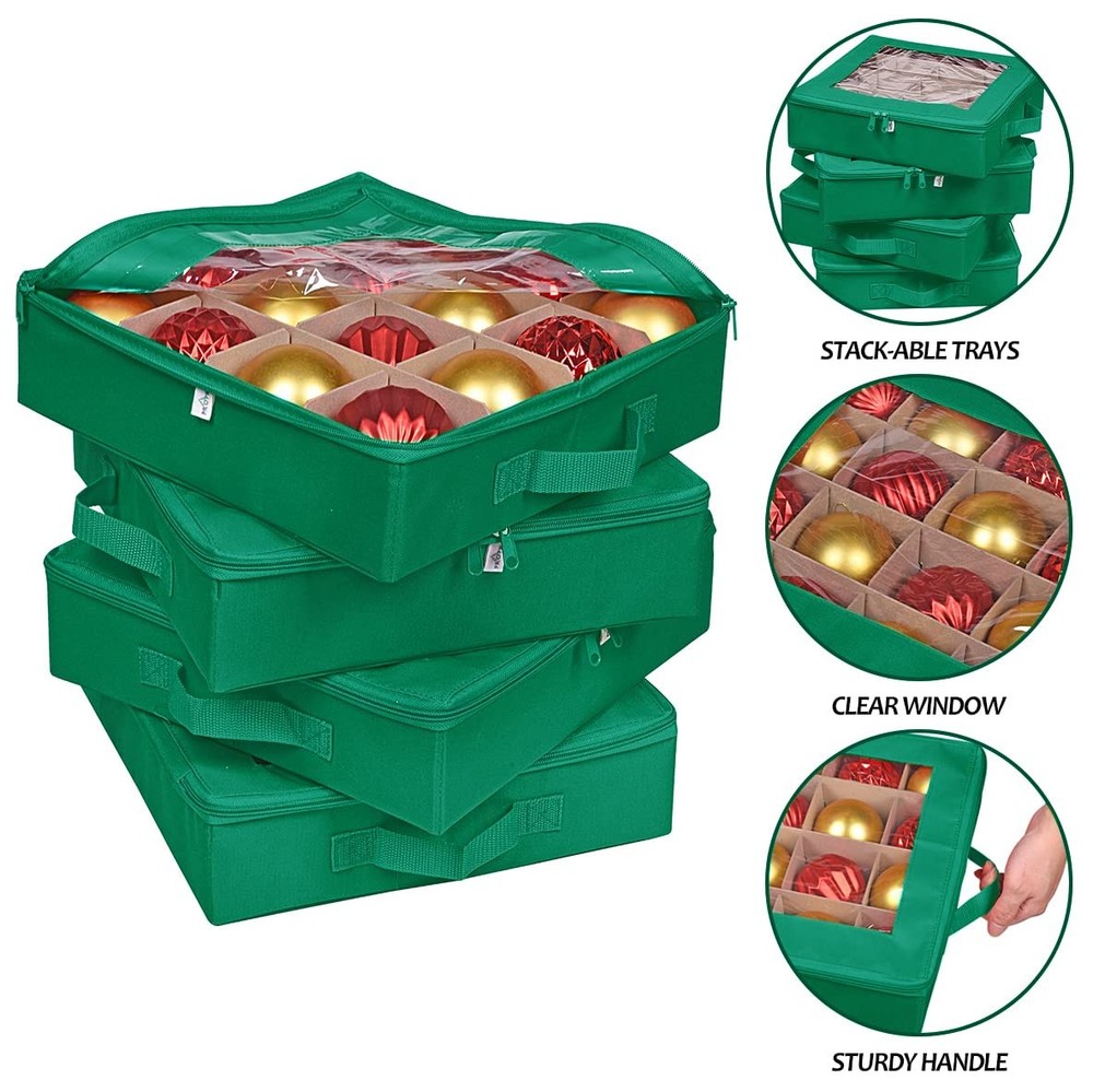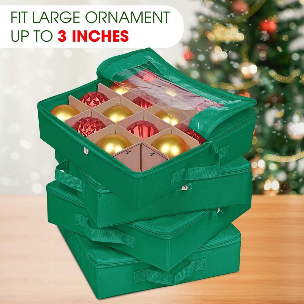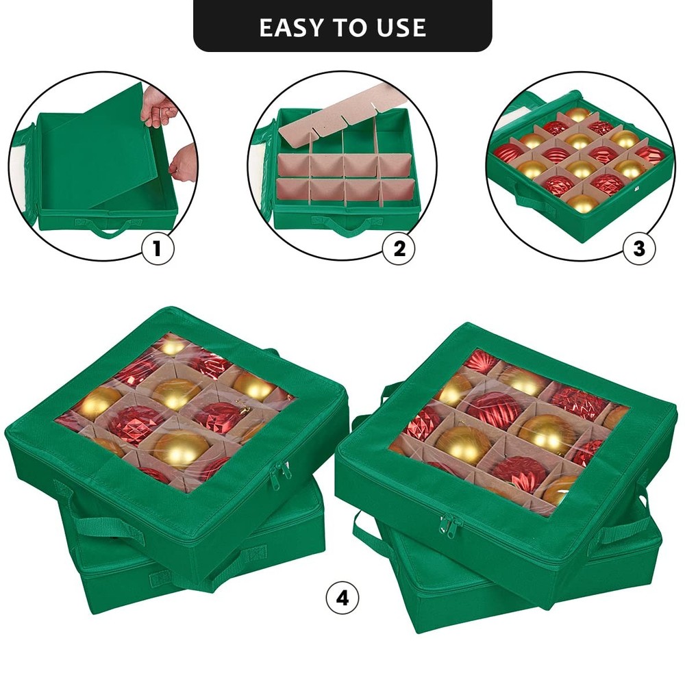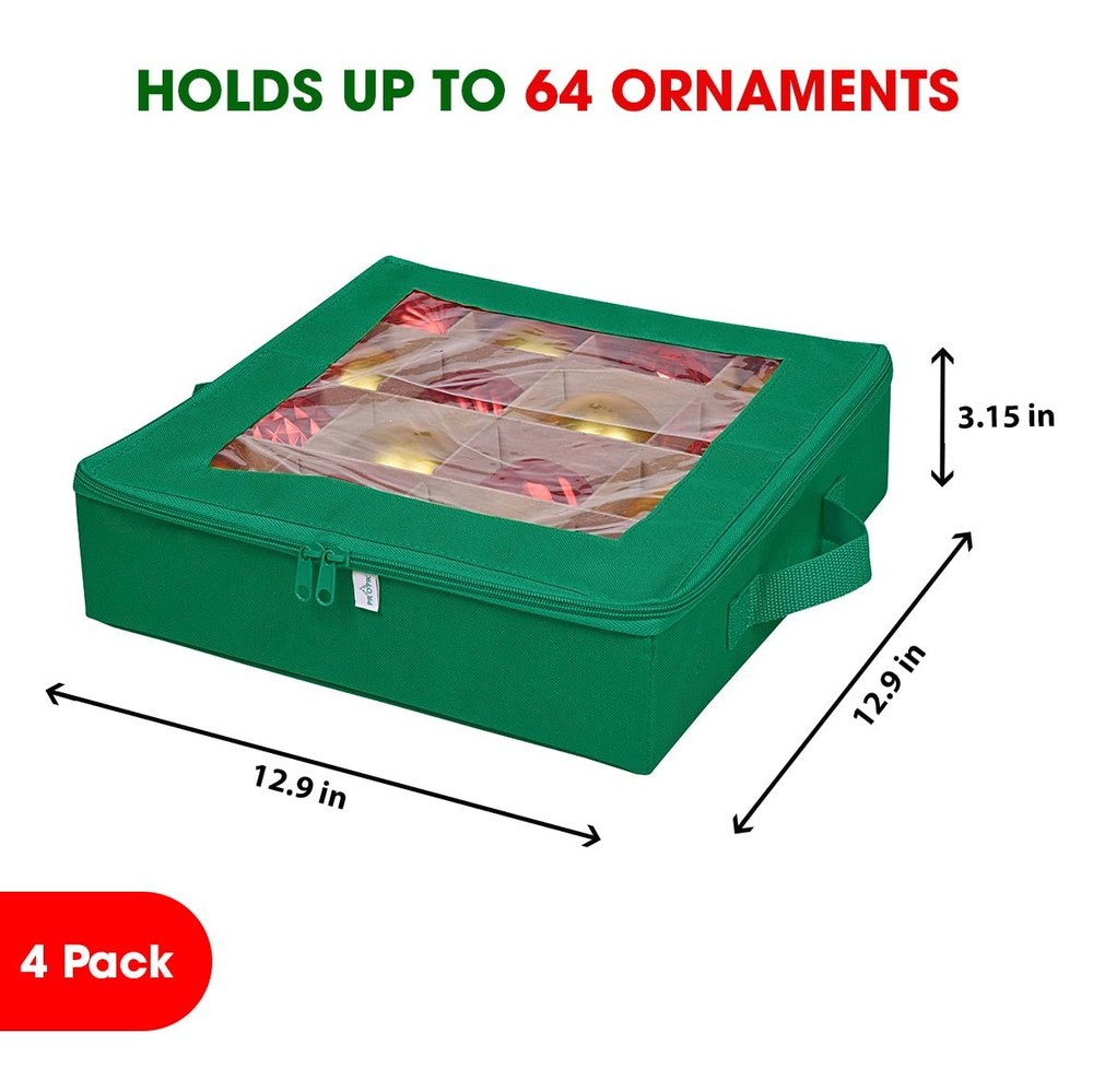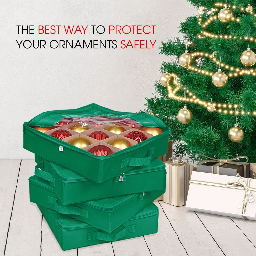Christmas Ornament Storage Box with Dividers, which is made to store, protect and organize your collection! Whether it's homemade ornaments and classic bulbs or sentimental figurines, nothing compares to decorating the Christmas tree. There's no doubt that ornaments are some of our most treasured possessions, whether they're sentimental pieces handed down from generations or created by hand. Since ornaments are typically displayed only during the holiday season, storing them during the rest of the year is important. Therefore, you will need a Christmas ornament box of such high quality that will keep your ornaments neatly organized and protected at all times. Each of these ornament boxes for storage is well-designed with a strong, protective exterior that protects the contents inside. To keep things even neater, they feature individual cardboard compartments! WHY CHOOSE US? Superior quality boxes Expertly crafted Features finest quality material Pack of 4 Individual Ornaments Boxes Stores up to 64 ornaments An elegant design Features cardboard dividers Brings comfort and style Safe, smooth and sturdy Durable and long- lasting Protects them from bumps, scratches, and dents Features a transparent top Makes it easy to identify the content inside Secure zipper closure Prevents dust and dirt Sturdy handles on either side Easy to carry and store Guaranteed Satisfaction A thing of joy to have and to behold, PACKAGE INCLUDES 4 X Christmas Ornaments Storage Boxes DIMENSIONS – 12.9-inch L X 12.9-inch W X 3.1-inch H So, what are you waiting for? ADD this Christmas Ornament Box Storage to your basket and get ready to protect your pride in style! 😊 ORNAMENTS SAFEKEEPING - Enjoy comfort, add style, eliminate clutter and organize your precious ornaments like a pro with our holiday ornament storage boxes, which feature an elegant design and sturdy cardboard dividers to help you hold, store and organize your ornaments in the most convenient yet fashionable manner! ★ SUPERIOR QUALITY – Meticulously constructed using only the finest quality material and featuring firm cardboard inserts, our Christmas ornament storage containers are safe, smooth, sturdy, compact and durable enough to ensure the wear and tear of everyday use for years to come! ⚡ GRIDED STORAGE TRAYS - Featuring sturdy cardboard dividers, the ornaments storage box protects your ornaments from bumps, scratches, and dents while keeping them neatly stored and ready to show off on special occasions. Our pack includes 4 trays, each holding 16 three-inch ornaments, so four trays can hold up to 64 ornaments! ★ QUICK AND CLEAR IDENTIFICATION - These ornament holder storage boxes come with a transparent top that makes it super easy and quick to identify what’s stored inside, so you'll always be on top of your collection. Moreover, the sturdy zipper closure ensures the utmost protection of your collection by keeping dust, dirt and insects out! ✓EASY TO CARRY - To help add to your convenience, we equipped our Christmas ornament organizer with skillfully stitched handles on both sides that make it easy for you to lift, drag, or carry them from one room to another or upstairs with minimal effort! The 4 individual trays are easy to store anywhere without taking up too much space!