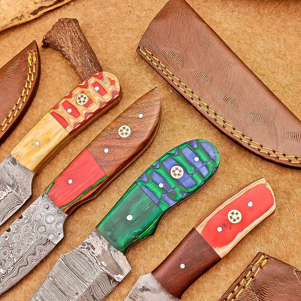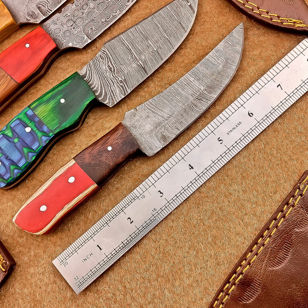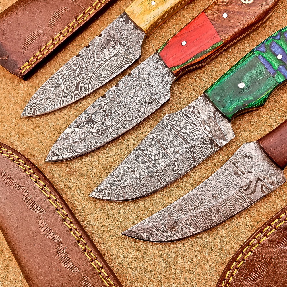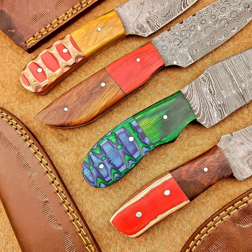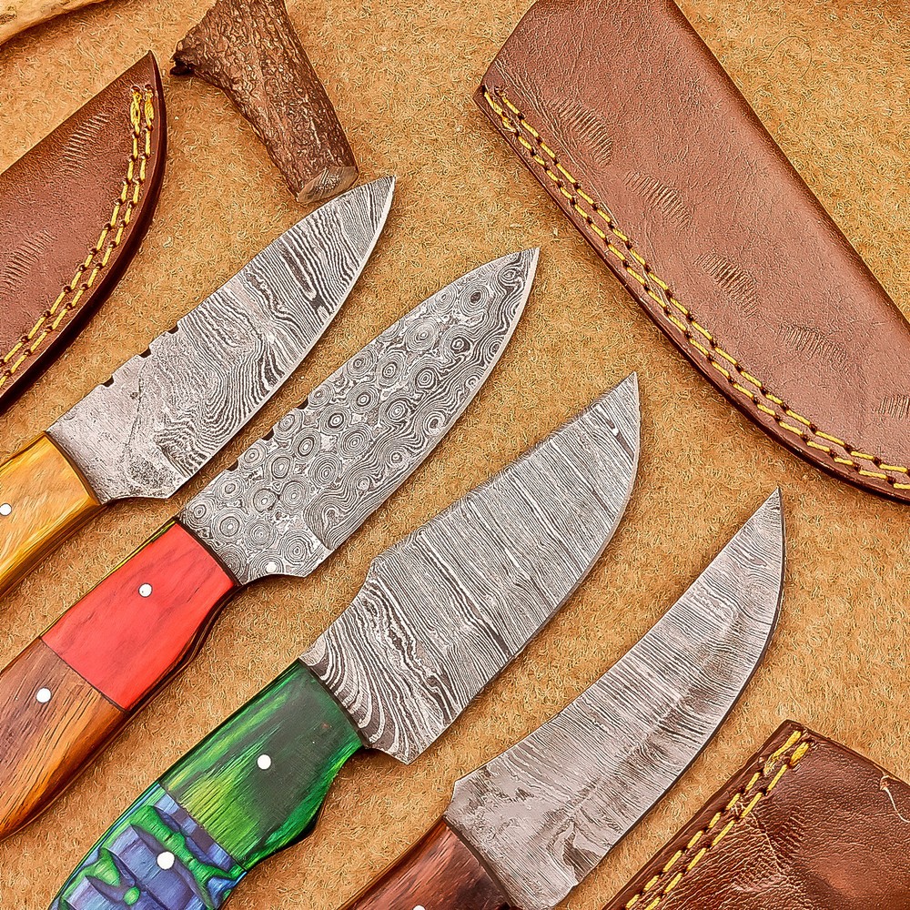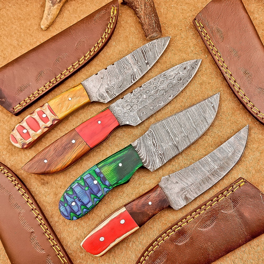 LOT OF 4 PCS! Handmade Damascus Hunting Knives , Skinner Knives Specifications: Overall Length: 8.0" Blade Thickness: ~4 mm Blade Material: Damascus Steel Handle Material: wood with brass pins mosaic pin Includes: Leather sheaths Blade Craftsmanship: Blades are made from 1095 & 15N20 High Carbon Tool Steel with over 256 layers and a hardness of 58-60 HRC for durability and sharpness. Spine of the blade tang has excellent fire work. Care Instructions: Sharpen with a Diamond Wet Stone at a 20-degree angle. Clean with soap and water, dry thoroughly, and apply gun oil. Store away from the sheath to prevent rust. Important Note for International Buyers: Please ensure that you are aware of your country’s import laws before placing an order. Any customs duties, taxes, or import restrictions are solely the buyer’s responsibility. We are not liable for any delays, confiscations, or charges imposed by your local customs authority. Shipping & Returns: Free shipping included. 14-day return policy applies. Contact Us: Message us anytime. We respond within 24 hours. Legal Disclaimer: By purchasing this item, you acknowledge that you are at least 18 years of age and legally permitted to purchase and possess knives in your locality. It is solely the buyer’s responsibility to ensure compliance with all applicable local, state, and federal laws regarding the ownership, use, and transportation of this item. This knife is intended strictly for lawful purposes such as culinary use, collection, or display. The seller accepts no responsibility or liability for any misuse, injury, damage, or legal issues arising from the use or resale of this product. By completing this transaction, the buyer agrees to all stated terms and conditions.