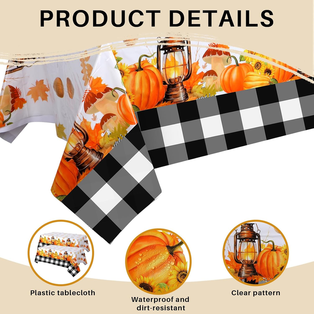 Store New Arrivals Add to Favorite View Feedback Contact 4 Pcs Fall Tablecloth 54 X 108 Inch Thanksgiving Autumn Harvest Pumpkin Maple Leaf Black Table Cover Rectangle Thanksgiving Tablecloth Washable Dining Table Cloth for Kitchen Description Item model number DOU--1282 Style Modern Number of Items 4 Pattern Plaid Country of Origin China Number of Sets 1 Theme Fall/Autumn Unit Count 1.0 Count Material Plastic, Polyethylene (PE) Corner Style Pleated Seasons Fall Item Package Quantity 4 Item Weight 15 ounces Special Feature Waterproof, Fall-Themed Pattern Color Orange Pumpkin Shape Rectangular Recommended Uses For Product Dining Table Product Dimensions 108"L x 54"W Product Care Instructions Machine Wash Size 108 x 54 inches Package Includes: this pack comes with 4 pieces of fall bulk plastic tablecloths; This means you have ample quantity for one large event, or have tablecloths at hand for multiple smaller gatherings Quality Material: fall tablecloth is made from durable PE plastic, which is long lasting and reliable and can withstand accidents and spills; The durability of the plastic allows you to focus more on the celebration, less on the cleanup Generous Size: with dimensions of about 108 x 54 inches/ 274 x 137 cm, Thanksgiving tablecloth is suitable for a majority of rectangle dining tables; It can comfortably accommodate your dishes, decorations, and more, while offering ample protection to your table setting Wide Application: not only ideal for Thanksgiving dinners, but this fall table covers are also versatile and practical enough to be applied for various occasions like parties, picnics, weddings, fall themed parties, family dinners, outdoors picnics, catering events, or other autumn celebration Vibrant Color and Festival Pattern: featuring a delightful combination of pumpkin, maple leaf and other elegant prints, Thanksgiving table cloths can add a festive touch to your dining area; The vibrant color and patterns make them visually appealing, ensuring your guests feel the holiday atmosphere from the moment they step into your home Product Description ABOUT US We offer the best prices around on high quality products. Our E-store includes media such as books, movies, music and games while offering electronics, toys, sporting apparel, clothing, tools, general home, garden items and more. SHIPPING We are always working hard to ensure your package arrives as soon as possible. Please understand that some factors like weather, high postal traffic, and the performance of shipping companies are outside of our control. We offer free shipping to the lower 48 states and ship within 2 business days of payment, usually sooner. We do not accept P.O. Boxes. Please provide a physical address. For shipping outside of the continental USA, we only use eBay's Global Shipping Program.The item is shipped to KY and then sent to the rest of the world. International customers are responsible for all duties and taxes. Continue to check out in order to calculate costs for shipping the item to your country. Messages regarding eBay's Global Shipping Program MUST be directed at eBay EXCLUSIVELY. RETURNS We offer a 30-Day Return Policy on items which you are not completely satisfied with. You have the option for a full-refund or an exchange of the item. No returns are available on items shipped outside of the USA. PAYMENT We accept PayPal. CONTACT US This page content is yet to come Please ad us to your favorite seller and visit again later Thank You CUSTOMER SATISFACTION We try our very best to make sure every customer is completely satisfied. If there's a problem, message us! We're happy to help. WE ACCEPT Copyright © 2021 AutoDS. | All Rights Reserved