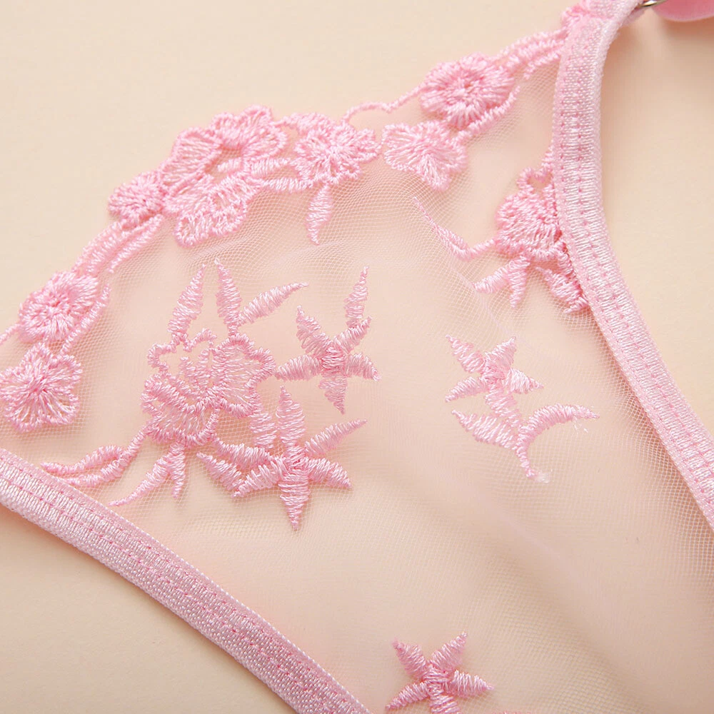 4-Piece Floral Lace Garter Bra & Thong Set - Sexy Push-Up Lingerie