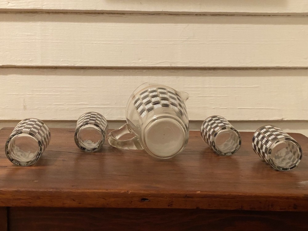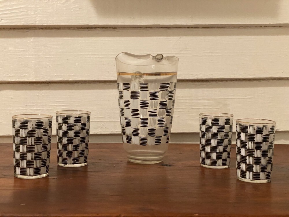 Set of four glass tumblers and a glass pitcher featuring a checkerboard design and gold trim. Good condition. Measurements: tumblers are 3 3/8” tall and 2 3/16” diameter; pitcher is 6 3/4” tall x 7” wide
