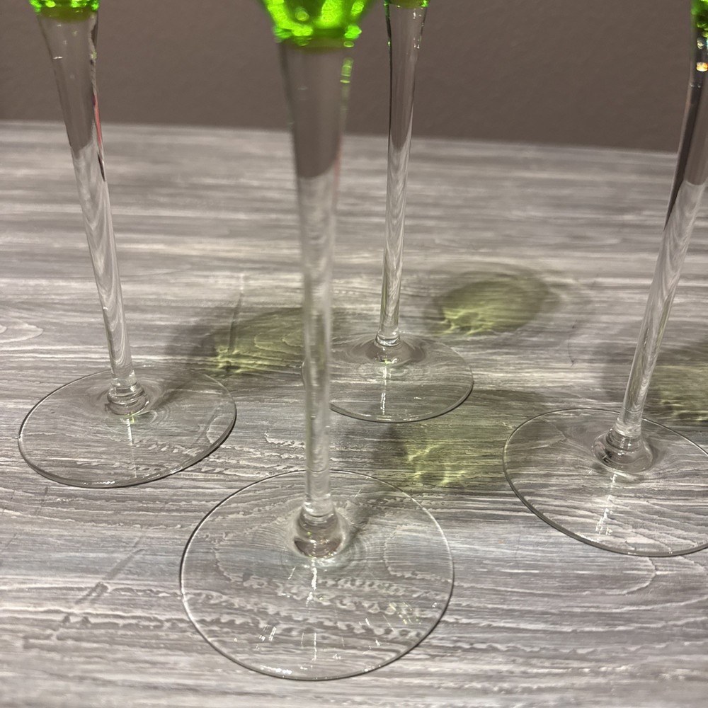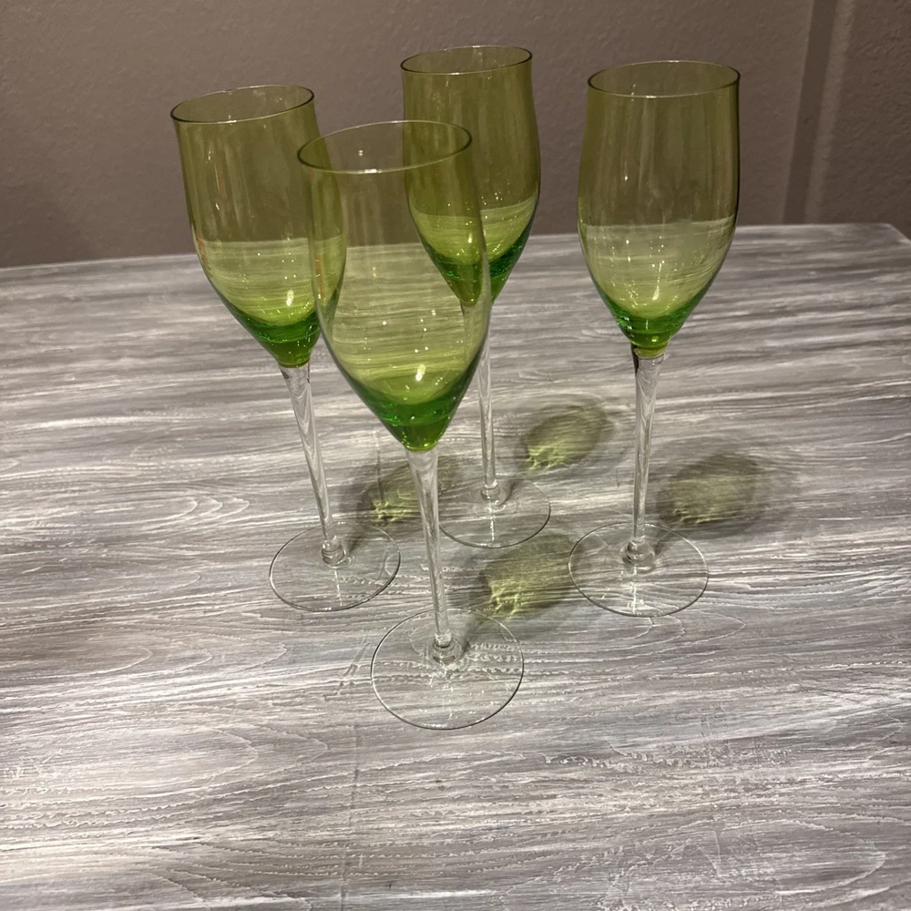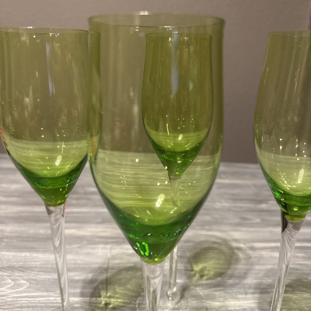 This set of 4 Champagne Fluted Green Glass Clear Faceted Stems stands at 10 inches tall, making them perfect for all occasions. The flutes are made of high-quality glass, with a beautiful green color and clear faceted stems. Ideal for adults, this set includes champagne flutes that are perfect for serving champagne or other sparkling drinks. The elegant design and vibrant color make these champagne flutes a great addition to any table setting or special event.