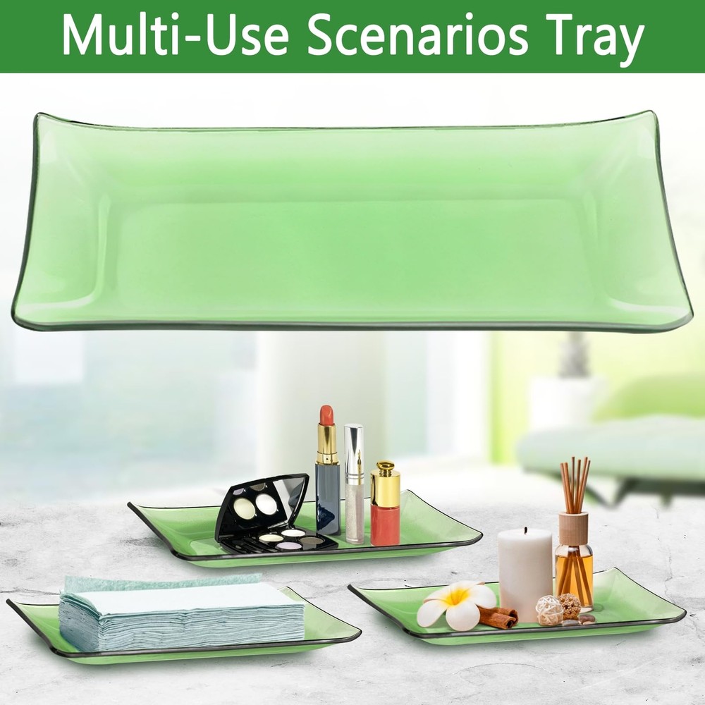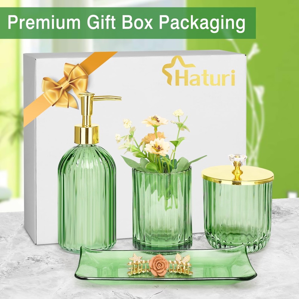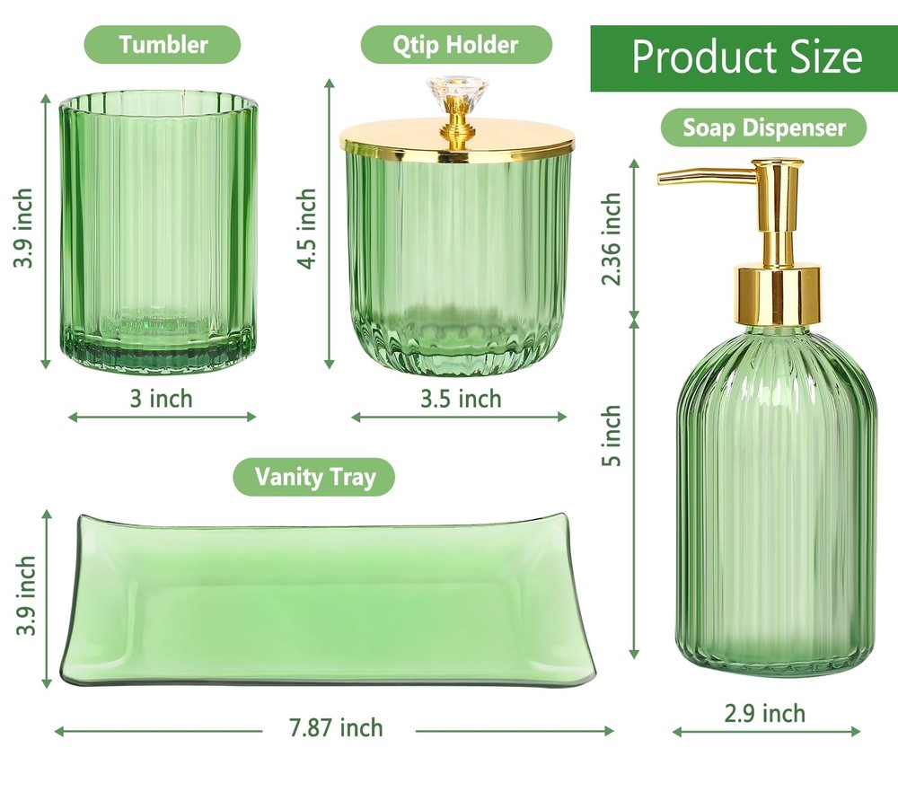 MULTIFUNCTION GREEN GLASS BATHROOM ACCESSORIES SET -- 4 pieces bathroom set includes a Lotion Soap Dispenser, a Vanity Tray, a Qtip Holder, and a Toothbrush Holder, Perfect for storing your toiletries or your cosmetics, the green tray can also hold your jewelry and keeping your bathroom counter fully organized and neatly DECORATIONS FOR HOME APARTMENT / BATHROOM -- The green glass bathroom set is ideal decoration fits various styles: bathroom decor, industrial style, western decor, modern style, contemporary decor, and country decor. Ideal bathroom accessories set for home decor, bathroom decor, and farmhouse decor. Great for the kitchen and bath, for countertop organize, vanity top, makeup table, and craft PREMIUM STURDY MATERIAL-- All pieces of bathroom accessory set are made of high-quality pressed heavy glass, with a nice weight, non-cheap plastic, and Easy to clean. Green cups are as clear as green crystals. High-quality stainless steel lid, gold plating process, beautiful and not rusty GREAT GIFTS IDEA -- A perfect gift for family, friends, and coworkers; perfect as a housewarming present, wedding gift, and perfect for remodelers looking to upgrade the bathroom in their home or apartment; bathroom essentials for a new home; guest bathroom decor 100% -- We are committed to presenting the best quality materials and satisfaction services to our customers. If you have any issue with the contemporary bathroom accessories set, please us, we will be happy to help you
