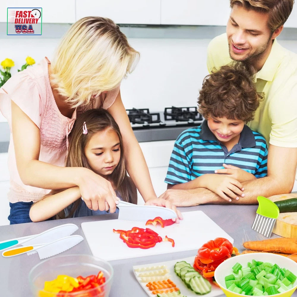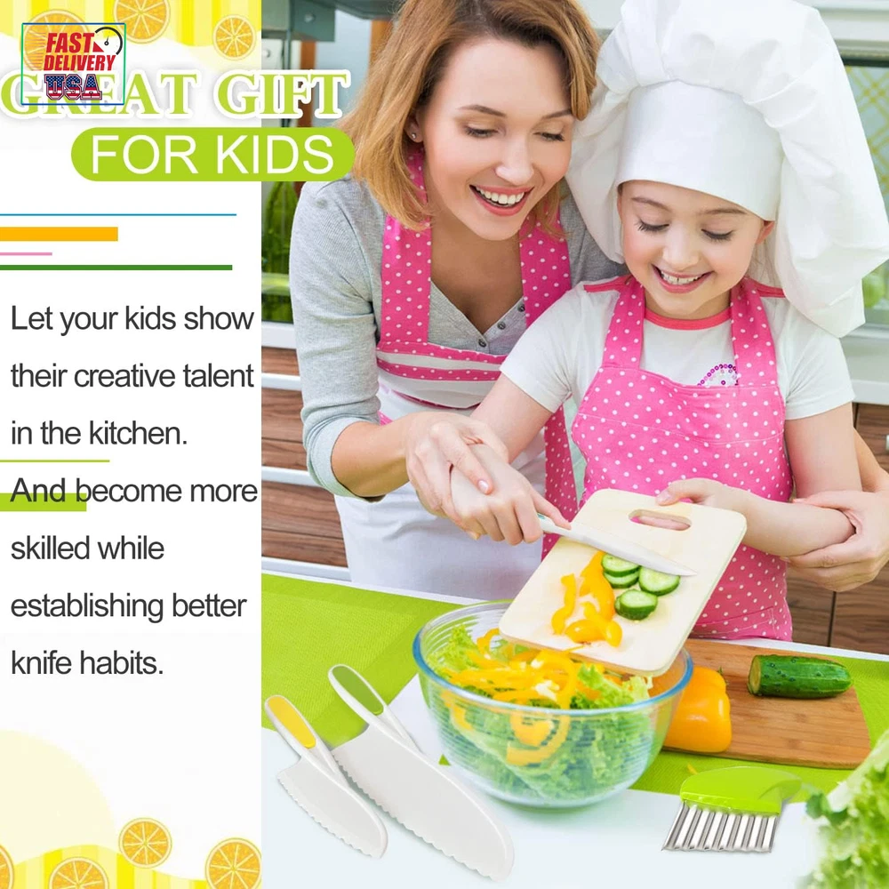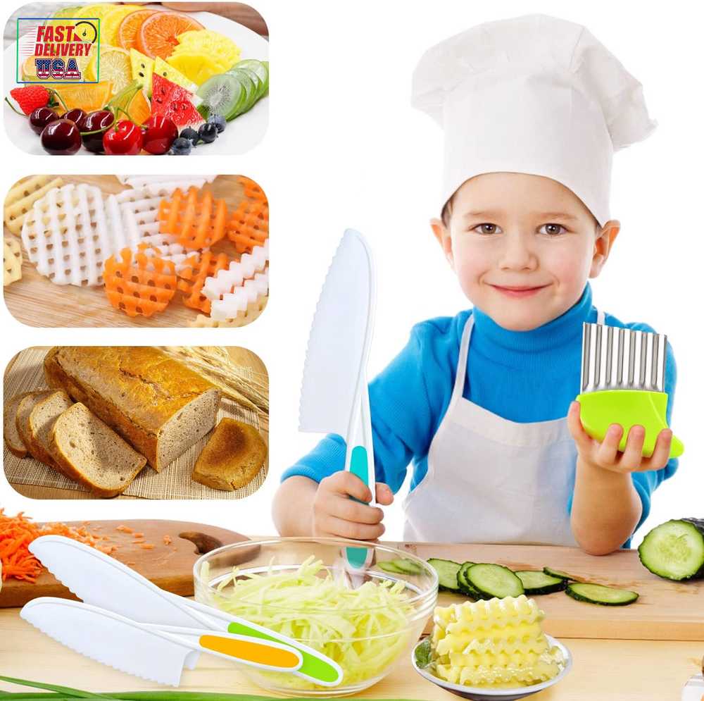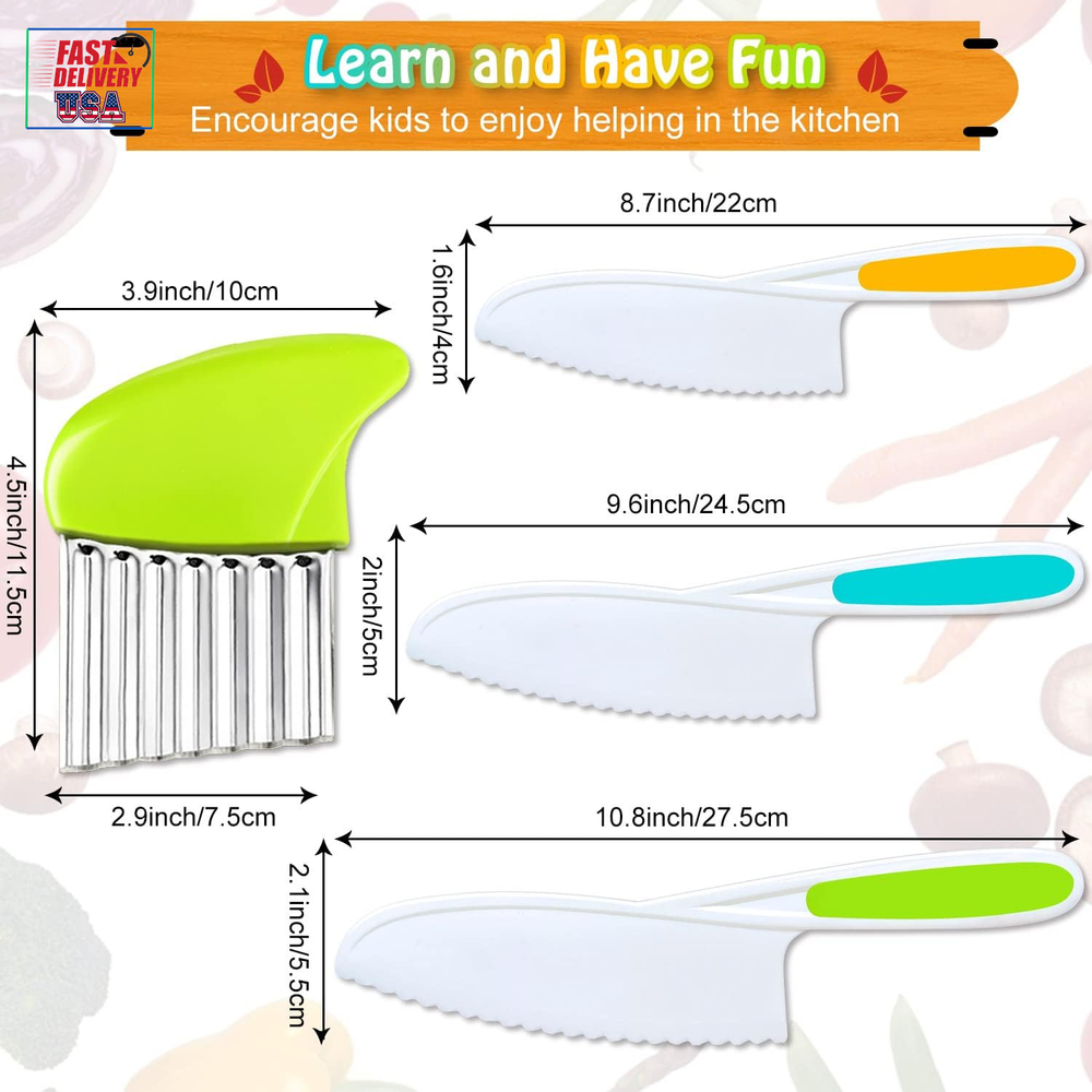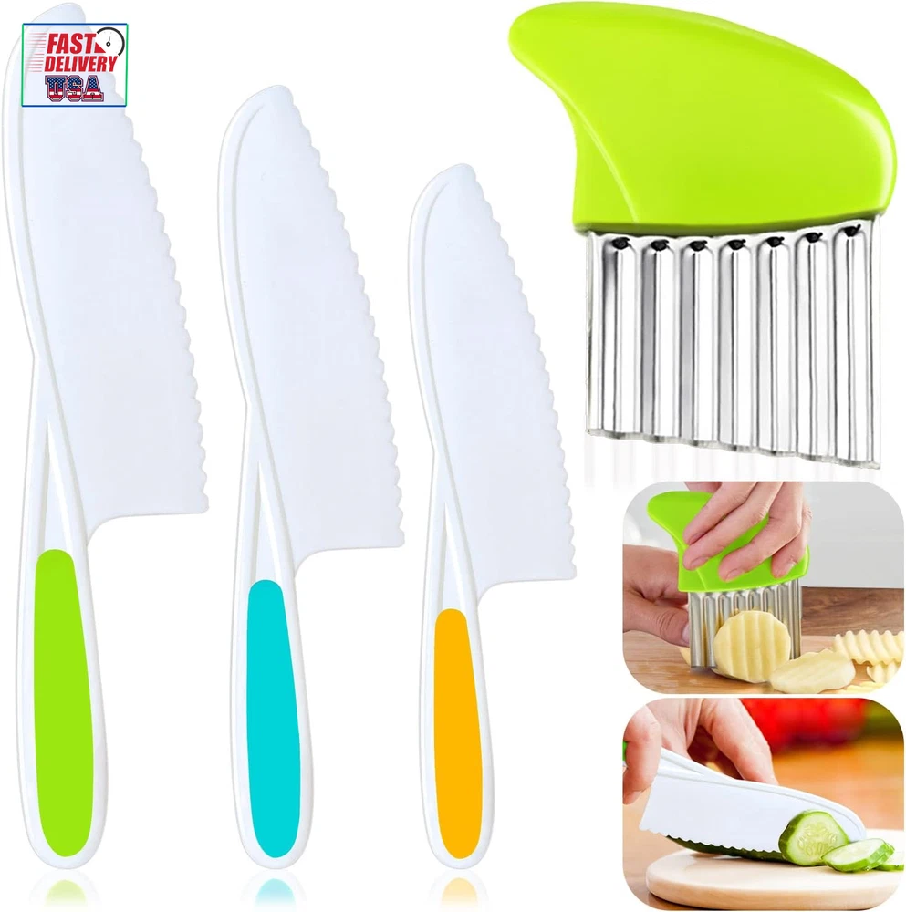 Store New Arrivals Add to Favorite View Feedback Contact 4 Pcs Kids Knife Set, Nylon Kitchen Knife with Crinkle Cutter, Serrated Edges Plastic Toddler Chef Knife for Real Cooking & Cutting Fruit Bread Description Blade Edge Serrated Color Multicolor Is Dishwasher Safe Yes Item Weight 5.6 ounces Handle Material Rubber, Plastic, Nylon Item Length 10.83 Inches Blade Length 0.1 Inches Blade Material Plastic 【Amazing and Fun Kids Chef‘s Knife】: The kids knife set includes 1 small, 1 medium, 1 large nylon toddler knife and 1 crinkle cutter, try this wavy cutter to make a wavy apple, banana or french fries. Let your kids show their creative talent in the kitchen. And enjoy seeing them become more skilled while establishing better knife habits 【Long-lasting Material】: These kid friendly knives are made of high quality nylon material, with serrated edges for precision cutting. The rubber handles ensure a firm grip. Not easy to break or deform, can give you a good using experience. Children ages 4+ can use them under adult supervision 【Versatile Kids Knife】: These plastic chef knives for kids can cut many types of fruit, bread, cake and more. Perfect salad knife or lettuce knife for your little chef. Hand them these kid safe knives and prepare a special family-cooked meal together 【Great Gift For Kids】: If you are searching for an efficient kids knife for real cooking, we’ve got you covered! Allow kids to join your kitchen and become independent chef! Finding a common interest with your kid and make memories together. It is the perfect gift idea for your kids on their birthdays or during holidays 【Satisfaction Guaranteed】: Your satisfaction is our priority. If there are any issues with your nylon knife set, please contact us and we will make it right. Good customer service, all your questions will be replied within 12hrs. Add the kids chef cutting knife and crinkle cutter to cart and build your kids confidence now! Product Description Let your kids show their creative talent in the kitchen. Enjoy seeing them become more skilled while establishing better knife habits! Is your kid eager to be creative in the kitchen? Do they always want to help in the kitchen? ✔Well, have a try with these 4-piece nylon knife set for kids, they can cut many types of foods, including lettuce, spinach, apple, banana, cucumbers, strawberry, cheese, cake and more! ✔Let your kids join you in your kitchen activities, preparing them to be independent and prepare a special family-cooked meal together. Kids' First Step Toward Kitchen Independence Ergonomic safe design: Our children kitchen knife set feature serrated cutting edges that cut effectively without being sharp to the touch. The rubber handle ensures a firm grip, which is carefully crafted for small hands, ensuring your child can safely cut food. Bright and fun toddler chef's knives: The kids cooking knife set includes 1 small, 1 medium, 1 large plastic children knife and 1 crinkle cutter, try this wavy cutter to make a wavy apple, banana or french fries. Also, each knife has a bright color, making the learning experience more interesting. Package Includes: 3 pieces kids safe kitchen knives 1 piece crinkle cutter TAORISH KIDS KNIFE SET Made from high quality plastic material, durable Serrated edges for precision cutting Compact, lightweight and easily carried Easy to use and easy to clean Parental supervision advised Wide Range of Occasions: These kids knives can be used in many occasions, such as birthday party, baby shower, parent-child activities, family gathering, anniversary and so on, adding charms to these occasions. Great Gift Idea: Our toddler knife set can cultivate children's hands-on ability, promote parent-child relationship, and inspire their confidence and creativity. It is the perfect gift idea for your kids on their birthdays or during holidays. ABOUT US We offer the best prices around on high quality products. Our E-store includes media such as books, movies, music and games while offering electronics, toys, sporting apparel, clothing, tools, general home, garden items and more. SHIPPING We are always working hard to ensure your package arrives as soon as possible. Please understand that some factors like weather, high postal traffic, and the performance of shipping companies are outside of our control. We offer free shipping to the lower 48 states and ship within 2 business days of payment, usually sooner. We do not accept P.O. Boxes. Please provide a physical address. For shipping outside of the continental USA, we only use eBay's Global Shipping Program.The item is shipped to KY and then sent to the rest of the world. International customers are responsible for all duties and taxes. Continue to check out in order to calculate costs for shipping the item to your country. Messages regarding eBay's Global Shipping Program MUST be directed at eBay EXCLUSIVELY. RETURNS We offer a 30-Day Return Policy on items which you are not completely satisfied with. You have the option for a full-refund or an exchange of the item. No returns are available on items shipped outside of the USA. PAYMENT We accept PayPal. CONTACT US This page content is yet to come Please ad us to your favorite seller and visit again later Thank You CUSTOMER SATISFACTION We try our very best to make sure every customer is completely satisfied. If there's a problem, message us! We're happy to help. WE ACCEPT Copyright © 2021 AutoDS. | All Rights Reserved