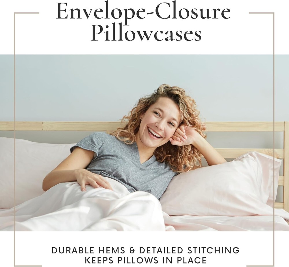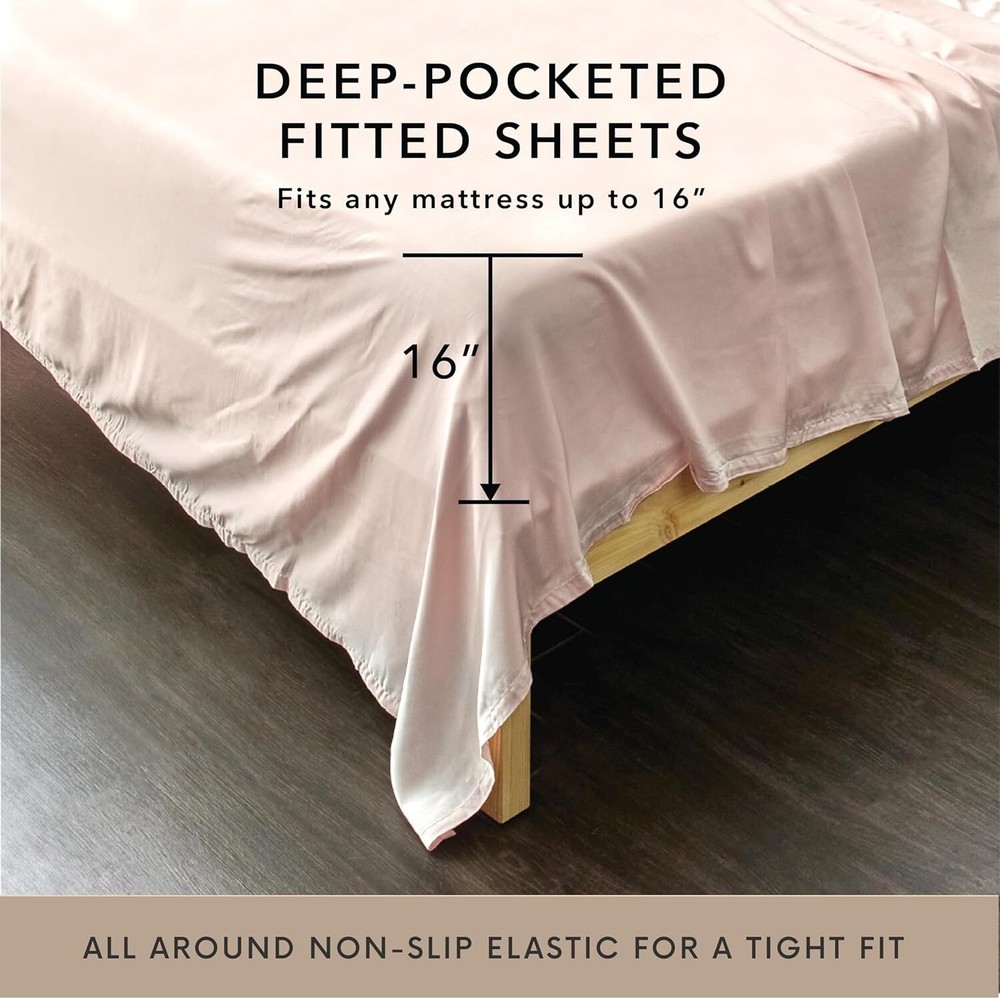 4 Piece King Size Sheet Set, 100% Viscose Made from Bamboo, Breathable, Ultra Soft Cooling Bed Sheets for Hot Sleepers, Beddings with Deep Pockets Fit 16" Mattress, Light Pink Dreamy Soft, Gift-Ready. Indulge in cozy luxury with our king size bamboo sheets set, made from 100% Viscose from Bamboo. Silky-soft and smoother than Egyptian cotton, they’re the perfect holiday gift for restful nights. Stay Cool All Night. Sleep cool with our king size cooling sheets sets, crafted with breathable, moisture-wicking fabric. Perfect for hot sleepers or anyone seeking all-night comfort. Complete California King Size Set. This King Size set includes 1 California King fitted sheet (72” x 84”), 1 flat sheet (108” x 106”), and 2 pillowcases (20” x 40”). Deep pockets and reinforced elastic ensure a snug fit on mattresses up to 16”. Effortless Care, Naturally Safe. Enjoy sheets that are as practical as they are luxurious. Our king size bamboo sheets are machine washable, fade-resistant, and OEKO-TEX certified for safety. Easy to maintain and eco-friendly! Veteran-Founded Promise. As a veteran-founded USA small business, we offer a 180-night satisfaction promise with unmatched customer support. Sleep soundly with your king size bamboo sheets set knowing we’ve got you covered.