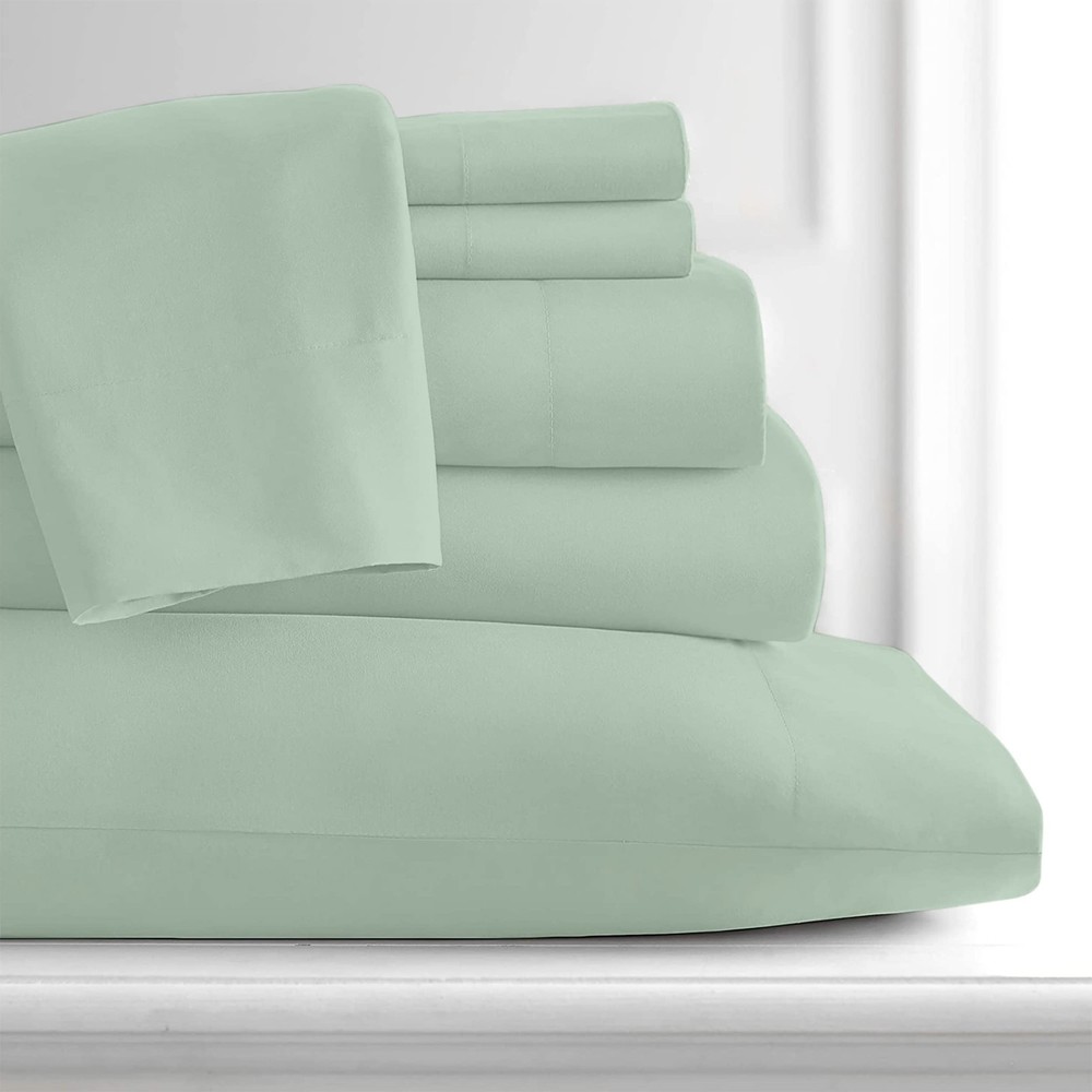 Every slumber will feel like a luxury escape with this (TM) Celadon 4-Piece Microfiber King Sheet Set adorning your mattress. The solid designer colors bring vibrant palette options to your bedroom decor, and the microfiber fabric is superior blended for an ultra-soft feel that cradles you in the bliss of a 5-star hotel experience. This unique material is strong, durable, and breathable, and the sheets are fade, stain, , and shrink resistant to retain their shape, so they always look and feel fresh and opulent. 4-piece king sheet set includes 78" x 80" x 14" fitted sheet (fits mattresses up to 16 inches deep), 108" x 102" flat sheet, and 20" x 40" king size pillowcases. Made of 100% microfiber. Machine washable in cold water and tumble dry quickly to save energy. LUXURY SLEEPING EXPERIENCE: sheets are made of microfiber that is superior blended for an ultra-soft feel that cradles you in comfort MICROFIBER FABRIC: strong, durable, breathable material is and shrink resistant to ensure sheets hold their shape DESIGNER COLORS: the palette options bring vibrance to your bedroom décor and the sheets are fade and stain resistant so they always look fresh and vivid 4-PIECE KING SHEET SET: includes 1 fitted sheet that fits mattresses up to 16 inches deep, 1 flat sheet, and 2 king size pillowcases EASY CARE: machine washable in cold water and tumble dry quickly to save energy