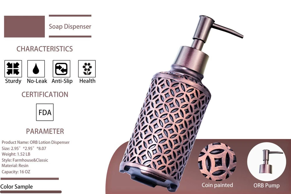Classical Oil Rubbered Brozen Style Easy to Clean,No color fades Great for kitchen and bathroom bath sink decor New High Resin Made,use with confidence. Accessories: Lotion Dispenser(2.95"*2.95"*8.07");Toothbrush Holder(4.25"*2.16"*3.77");Bath Tumbler(2.95"*2.95"*3.93);Soap Dish(5.43"*4.13"*1.37");All Accessories weight(3.2 pounds)