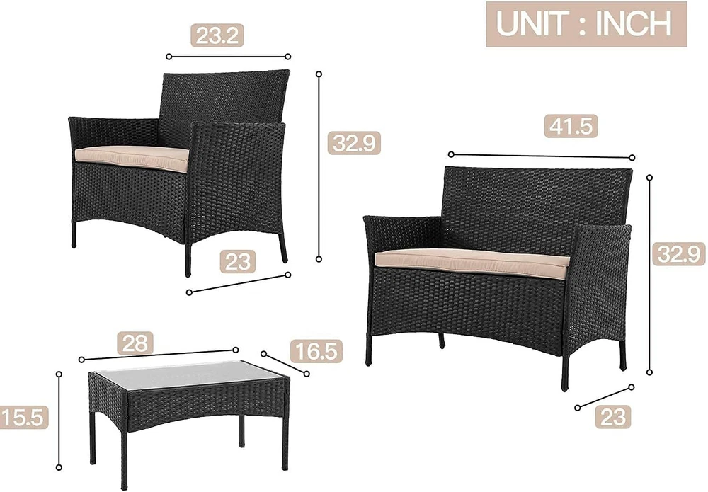 【EXCELLENT QUALITY】:The cushions of the patio furniture set use a high-density rebound sponge to give you a comfortable sitting feel.Patio Wicker Sofa Set Built As High Quality Metal Frame With Resilient PE Rattan, Black Synthetic Resin Wicker Outdoor Garden Conversation Set Designed For The Outdoors. 【EASY ASSEMBLY】: This Outdoor Furniture Set Comes With All Hardware & Necessary Tools. The Instruction, You Can Easily And Quickly Assemble The Patio Sofa Set. Outdoor Furniture Patio Wicker Rattan Sofa Garden Conversation Set. 【COFFEE TABLE】:The table in the patio furniture set is made of high-quality tempered glass for drinks, food and any beautiful decorations.The patio set is simple and stylish,it will be perfect for decorating your yard, poolside, balcony. 【MULTIPURPOSE FURNITURE SET】:The set is ideal to be placed in your balcony, patio, garden,poolside, backyard and other outdoor space in your house to create a private corner.Style and settings, convenient storage, save space. 【HIGH COST PERFORMANCE】:This patio set is designed to be modern and stylish with a low-maintenance feature. 4 sets of black rattan chairs can be used both indoors and outdoors, suitable for various large or small places.Outdoor Furniture Set Patio Wicker Furniture Set Patio Sofa Garden Conversation Set.