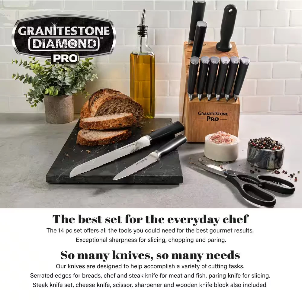 Fast Shipping On All Items 30 Days Money Guarantee Customer Support Excellent Service 100% Satisfaction Satisfaction Guaranteed 4-Piece Stainless Steel Premium Chef Knife Set With Black Handle Cookware Set Specification Blade Material Stainless Steel Cleaning Instructions Top Rack Dishwasher Safe Features Corrosion Resistant,Dishwasher Safe,Non-slip Handle Color Black Handle Material Stainless Steel Included Bread Knife,Cheese Knife,Chef's Knife,Knife Block,Paring Knife,Sharpening Steel,Steak Knife Kitchen Product Type Knife Set Knife Block Material Wood Knife Construction Stamped Knife Sharpener Compatibility Handheld Sharpeners Knife Style American Number of Pieces 14 Package Type Assorted Set Returnable 90-Day Manufacturer Warranty Limited 10 years (n/a) Item Description Ultra-sharp blades ensure precise cutting High-carbon stainless steel resists corrosion Dishwasher safe for easy cleaning GraniteStone Pro Nutriblade 14-Piece Kitchen Knife Set with Knife Block, Premium Kitchen Knives Set for Kitchen, Chef Knife Set with Block, Complete Knifes Set, Ultra Sharp Stainless-Steel Blades. GRANITESTONE PRO 14 PIECE SET- The all in one 14-piece + block set is made with Pro-grade high-Carbon Stainless-steel and feature handles of ABS material which will never splinter or corrode for ultimate comfort and durability perfect for professional or home chefs. ULTRA SHARP- The blades come extremely sharp straight from the box and are stamped from professional quality High-Carbon stainless steel, which is easy to resharpen, and corrosion resistant to power through any task. Granitestone pro 14-piece set- the all in one 14-piece plus block set is made with pro-grade high-carbon stainless-steel and feature handles of ABS material which will never splinter or corrode for ultimate comfort and durability perfect for professional or home chefs Ultra sharp- the blades come extremely sharp straight from the box and are stamped from professional quality high-carbon stainless steel, which is easy to resharpen, and corrosion resistant to power through any task Complete set- this set includes 1 chef knife, 1 serrated bread knife, 1 slicing hollow knife with non-stick notches, 1 cheese knife with non-stick notches, 1 paring knife, 1 utility knife, 6 steak knives, 1 kitchen shears, and 1 knife sharpener Durable and strong- stamped from rust proof and tarnish resistant high-carbon steel this complete set is strong enough to tackle all your kitchen tasks and will last a lifetime Dishwasher safe- these knives are dishwasher safe for effortless clean and care. simply throw them in the dishwasher after use About us We offer the best prices around on high quality products. Our E-store includes media such as books, movies, music and games while offering electronics, toys, sporting apparel, clothing, tools, general home, garden items and more. Shipping We are always working hard to ensure your package arrives as soon as possible. Please understand that some factors like weather, high postal traffic, and the performance of shipping companies are outside of our control. We offer free shipping to the lower 48 states and ship within 2-3 business days of payment, usually sooner. We do not accept P.O. Boxes. Please provide a physical address. For shipping outside of the continental USA, we only use eBay's Global Shipping Program.The item is shipped to KY and then sent to the rest of the world. International customers are responsible for all duties and taxes. Continue to check out to calculate costs for shipping the item to your country. Messages regarding eBay's Global Shipping Program MUST be directed at eBay EXCLUSIVELY. Returns We offer a 30-Day Return Policy on items in which you are not completely satisfied with. You have the option of a full-refund or an exchange of the item. No returns are available on items shipped outside of the USA Satisfaction We try over very best to make sure every customer is completely satisfied. If there's a problem, message us! We're happy to help. Payment Options Shop With Confidence