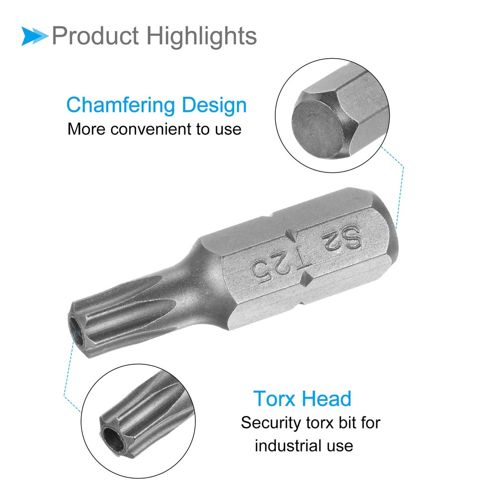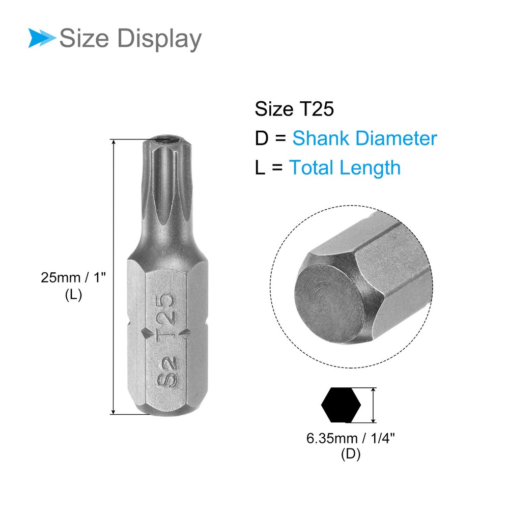 Document Attributes:* Shank Size: 1/4"* Total Length: 25mm / 1"* Bit Type: T25 * Material: S2 SteelWhat Is Included:* 4 Piece x Torx Screwdriver BitApplications & Features:--- Those bits fit for electric screwdrivers, hand screwdrivers, electric drills, air drills, air batches and 1/4" screwdriver sets.--- The torx screwdriver bits are made of S2 steel, which ensures high hardness, durability and wear resistance.--- These screwdriver bits are magnetic, which can firmly absorb the screw to prevent it from falling off.--- The star head bits are easy to install on the screwdriver handle with double ear on the sides of the bit shank.Useful Tips:--- Please apply appropriate force. Excessive force may cause the bit to slip, while insufficient force may not effectively tighten or remove the screw. 4pcs Torx Screwdriver Bits 1/4" Hex Shank 25mm T25 Magnetic Screwdrivers Bit Attributes: * Shank Size: 1/4" * Total Length: 25mm / 1" * Bit Type: T25 * Material: S2 Steel What Is Included: * 4 Piece x Torx Screwdriver Bit Applications & Features: --- Those bits fit for electric screwdrivers, hand screwdrivers, electric drills, air drills, air batches and 1/4" screwdriver sets. --- The torx screwdriver bits are made of S2 steel, which ensures high hardness, durability and wear resistance. --- These screwdriver bits are magnetic, which can firmly absorb the screw to prevent it from falling off. --- The star head bits are easy to install on the screwdriver handle with double ear on the sides of the bit shank. Useful Tips: --- Please apply appropriate force. Excessive force may cause the bit to slip, while insufficient force may not effectively tighten or remove the screw. Hot Item Payment 1.We accept eBay payment . 2.Payment must be received within 7 business days of auction closing. Shipping 1.We ship to your eBay or Paypal address. Please make sure your eBay and Paypal address is correct before you pay. 2.Items will be shipped within 1-3 business day when we received payment. 3.Delivery time depends on destination and other factors. Description Policy 4pcs Torx Screwdriver Bits 1/4" Hex Shank 25mm T25 Magnetic Screwdrivers Bit Attributes: * Shank Size: 1/4" * Total Length: 25mm / 1" * Bit Type: T25 * Material: S2 Steel What Is Included: * 4 Piece x Torx Screwdriver Bit Applications & Features: --- Those bits fit for electric screwdrivers, hand screwdrivers, electric drills, air drills, air batches and 1/4" screwdriver sets. --- The torx screwdriver bits are made of S2 steel, which ensures high hardness, durability and wear resistance. --- These screwdriver bits are magnetic, which can firmly absorb the screw to prevent it from falling off. --- The star head bits are easy to install on the screwdriver handle with double ear on the sides of the bit shank. Useful Tips: --- Please apply appropriate force. Excessive force may cause the bit to slip, while insufficient force may not effectively tighten or remove the screw. Hot Item Payment 1.We accept eBay payment . 2.Payment must be received within 7 business days of auction closing. Shipping 1.We ship to your eBay or Paypal address. Please make sure your eBay and Paypal address is correct before you pay. 2.Items will be shipped within 1-3 business day when we received payment. 3.Delivery time depends on destination and other factors.