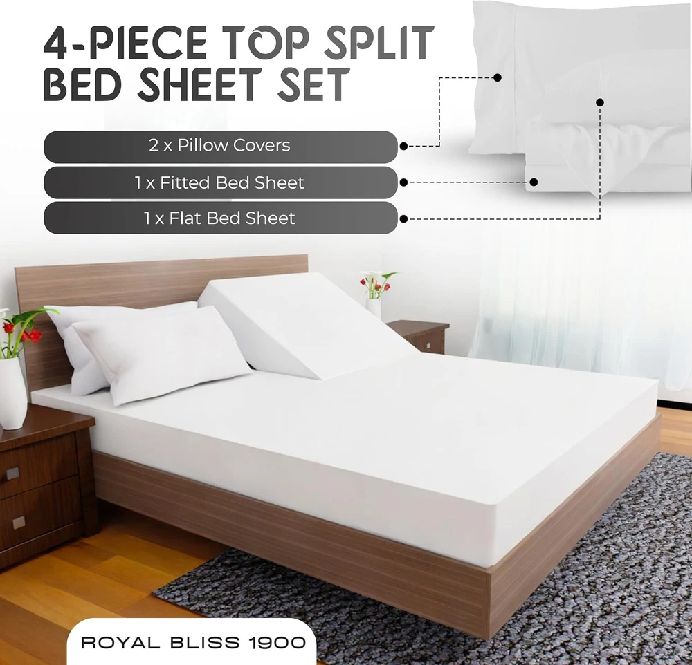 4-Piece Ultra-Soft King Split Head Mattress Sheet Set - Deep Pockets, White ‹ › ‹ › ‹ › ‹ › ‹ › ‹ › ‹ › ‹ › ‹ › 4-Piece Ultra-Soft King Split Head Mattress Sheet Set -Deep Pockets, White Features: Made from proprietary hydro-brushed fabric for unparalleled softness, keeping you cozy in winter and cool in summer. Includes: - 1 King Flat Sheet (108" x 102") - 2 King Pillowcases (20" x 40") - 1 Split Head Flex King Fitted Sheet (80" x 78" x 16" Pocket) with all-around elastic. Extra deep pockets grip and fit mattresses of up to 16 inches. Elastic all-around for a secure fit that stays in place all night. Exceptional quality made with the finest microfiber yarn, free from harmful materials. Wrinkle-resistant and machine washable for easy care. Benefits: Indulge in the luxurious softness that enhances your sleeping experience. Breathable fabric allows for temperature regulation for year-round comfort. Designed to maintain its elegance and quality wash after wash. Perfect fit for split head king mattresses, ensuring a snug and secure fit for uninterrupted sleep. Available in a variety of colors to match any bedroom decor. Why Choose Our 4-Piece Ultra-Soft King Split Head Mattress Sheet Set? If you crave the royal treatment in your sleep space, indulge in our 4-Piece Ultra-Soft King Split Head Mattress Sheet Set. Lavishly crafted from ultra-soft, breathable fabric, these sheets bring a touch of sophistication to your bedroom while ensuring you enjoy restful nights filled with comfort and relaxation. With its wrinkle-resistant design and machine-washable convenience, maintaining your luxurious sleep experience has never been easier. Elevate your sleep sanctuary and embrace the exquisite comfort that awaits. Your royally soft night starts here! Shipping Free & Fast Shipping - We offer free shipping to most of the USA with a normal delivery time of 3-7 days. However, due to the current situation, additional delivery time (up to 3 weeks) may be required for some items. Alternative Carriers - We may use alternative carriers (e.g. USPS, FedEx, UPS, etc.) to ensure your package arrives safely and on time. Due to the use of multiple carriers, we are unable to provide a tracking number automatically. Handling Time - Orders are processed and shipped within 1-2 business days of receiving cleared payment. Shipping Restrictions - Shipping to Alaska, Hawaii, Puerto Rico, Guam, and other US territories may incur shipping charges or delivery restrictions. Please contact us before ordering, or your order can be refunded/cancelled. State Restrictions - There may be restrictions based on your state of purchase. For example, certain items may not be shipped to California due to state regulations. Contact for Tracking Updates - If you require tracking updates or have any concerns about the delivery of your order, please feel free to contact us, and we will be happy to assist you. Return 30-Day Hassle-Free Returns - We want you to be completely satisfied with your purchase. If you are not, you can return the item within 30 days of receiving it for a full refund or exchange. Easy Return Process - To start a return, simply contact us and we will provide you with a prepaid return shipping label and detailed instructions. Restocking Fee - There are no restocking fees for returns. However, the buyer is responsible for return shipping costs if the return is not due to a seller's error. Refund Processing Time - Refunds will be processed within 5 business days of receiving the returned item in its original condition. Payment We accept all major credit cards, PayPal, and Apple Pay for your convenience. Your payment information is secure and encrypted to ensure a safe and seamless transaction. Please complete your payment within 3 days of purchase to avoid any delays in shipping. Feedback Your feedback is extremely important to us. We strive to provide the best products and customer service possible. If you are satisfied with your purchase, please take a moment to leave us a positive review. If you have any concerns or issues with your order, please contact us before leaving negative feedback. We are committed to resolving any problems and ensuring your satisfaction. Contact Us If you have any questions or concerns, please feel free to reach out to our customer support team. You can contact us through the eBay messaging system. We are available Monday to Friday, 9:00 am to 5:00 pm EST, and we will do our best to respond to your inquiry within 24 hours. Buy it now and enjoy a pleasant shopping experience! UPC: Not Set Item Length: Not Set Item Width: Not Set Unit Quantity: 1 count Material: Microfiber Character: Not Set Theme: Winter Features: Machine Washable,Fully Elasticized,Fade Resistant,Deep Pocket,Shrink Resistant,Wrinkle Resistant Care Instructions: Machine Wash Department: Adults Room: Bedroom Labels & Certifications: Not Set Brand: Unbranded Size: Top Split Flex Head King Type: Sheet Set Color: White Pattern: Solid MPN: Not Set Character Family: Not Set Thread Count: 1900 Country/Region of Manufacture: Not Set Style: Modern Shape: Rectangular Model: Not Set GSM (Grams per Square Meter): Over 800 Product Line: Not Set Unit Type: Unit