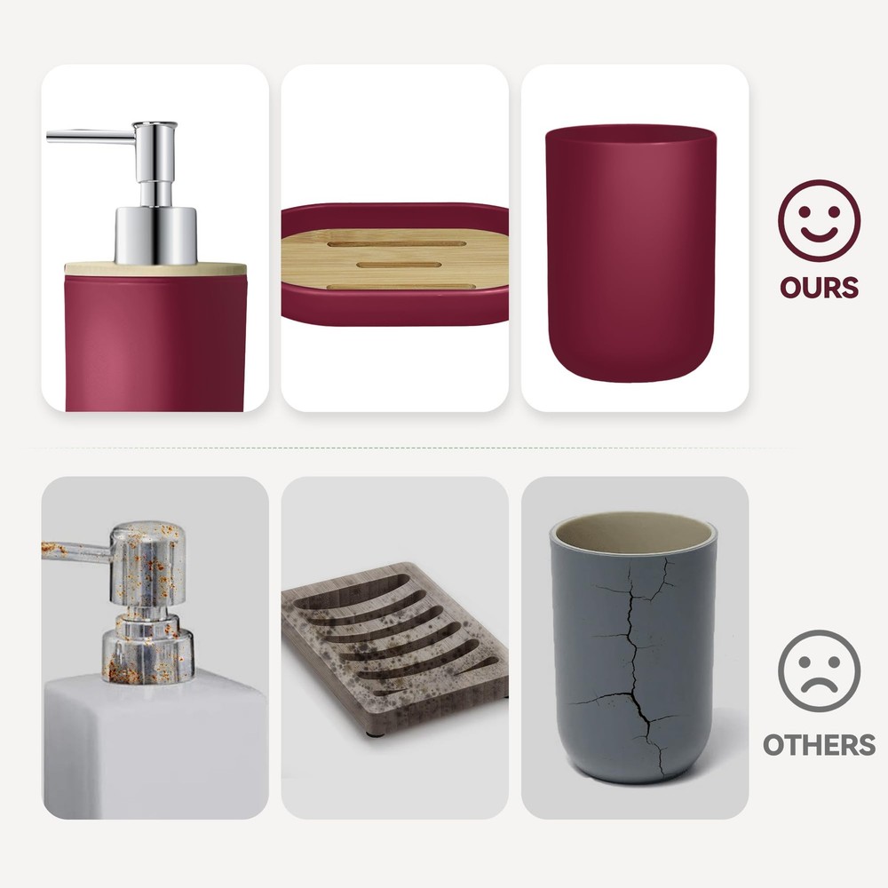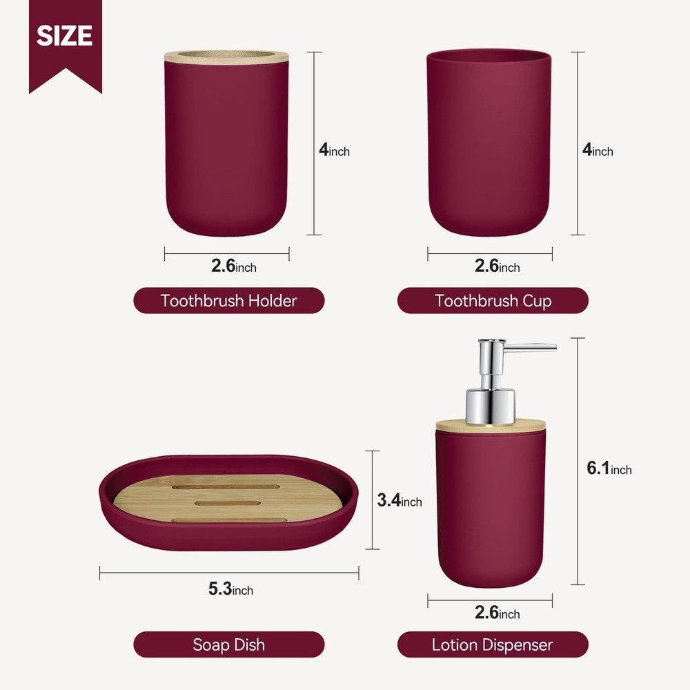 Bathroom Accessories Set Our bathroom accessories set can make your bathroom cleaner and tidier, the elegant design with fashionable colors greatly enhances your bathroom decoration and saves the bathroom storage space. Specification: Item type: Bathroom accessories set Color: Wine Red Quantity: 4 Pack Material: Safe and durable material Those products are made of thickened plastic and bamboo, don't worry that it will be as easy to break like ceramics or glass. The accessories set can accommodate all bathroom necessities. Package include: A suit contain 1 soap dispenser, 1 toothbrush holder, 1 toothbrush cup, 1 soap dish,which can meet basic bathroom supplies storage needs. Multi-purpose soap dispenser This bottle can put many things, such as liquid soap, shower gel or lotion packaging. Simple toothbrush cup and mouthwash cup Your toothbrush has a fixed place, and it will not be messy. The separation of the toothbrush and mouthwash cup will be cleaner and hygienic. Soap boxes Thick plastic soap boxes are more durable and not easy to mold. This is a perfect gift for family members, friends, relatives, colleagues, customers, neighbors. 4 PCS Bathroom Accessory Set: Includes 1 x soap dispenser, 1 x toothbrush holder, 1 x soap dish and 1 x mouthwash cup. Our modern bathroom accessories set keeps the bathroom organized and has a minimalist design that perfectly complements your bathroom decoration Bathroom Soap Dispenser And Toothbrush Holder Set: The soap dispenser pump is easy to press, will not leak, is sturdy and durable, and has a long service life. Great for liquid hand soap, dish soap, lotion, shampoo, body wash, hand sanitizer and more. Our toothbrush holders fit most sizes of electric toothbrushes, toothbrushes, toothpaste tubes and razors. The thickened plastic material ensures it's shatterproof, can withstand drops well Sturdy And Safe Material: Our bathroom set accessories are made of premium plastic, easy to clean, sturdy, and durable, making your bathroom out of the ordinary Ideal Decoration For Bathroom: Wine red and bamboo make up a very natural decorative element, giving a cozy feel. That harmonizes with most styles, adding a more rustic, boho, farmhouse, or vintage touch to your home Giftable: Functional and beautiful design makes these 4 pieces of bathroom accessories set a great gift for a housewarming, wedding, birthday, Mother's Day, Thanksgiving Day, Christmas, and also for mom, sister, colleague, and friends