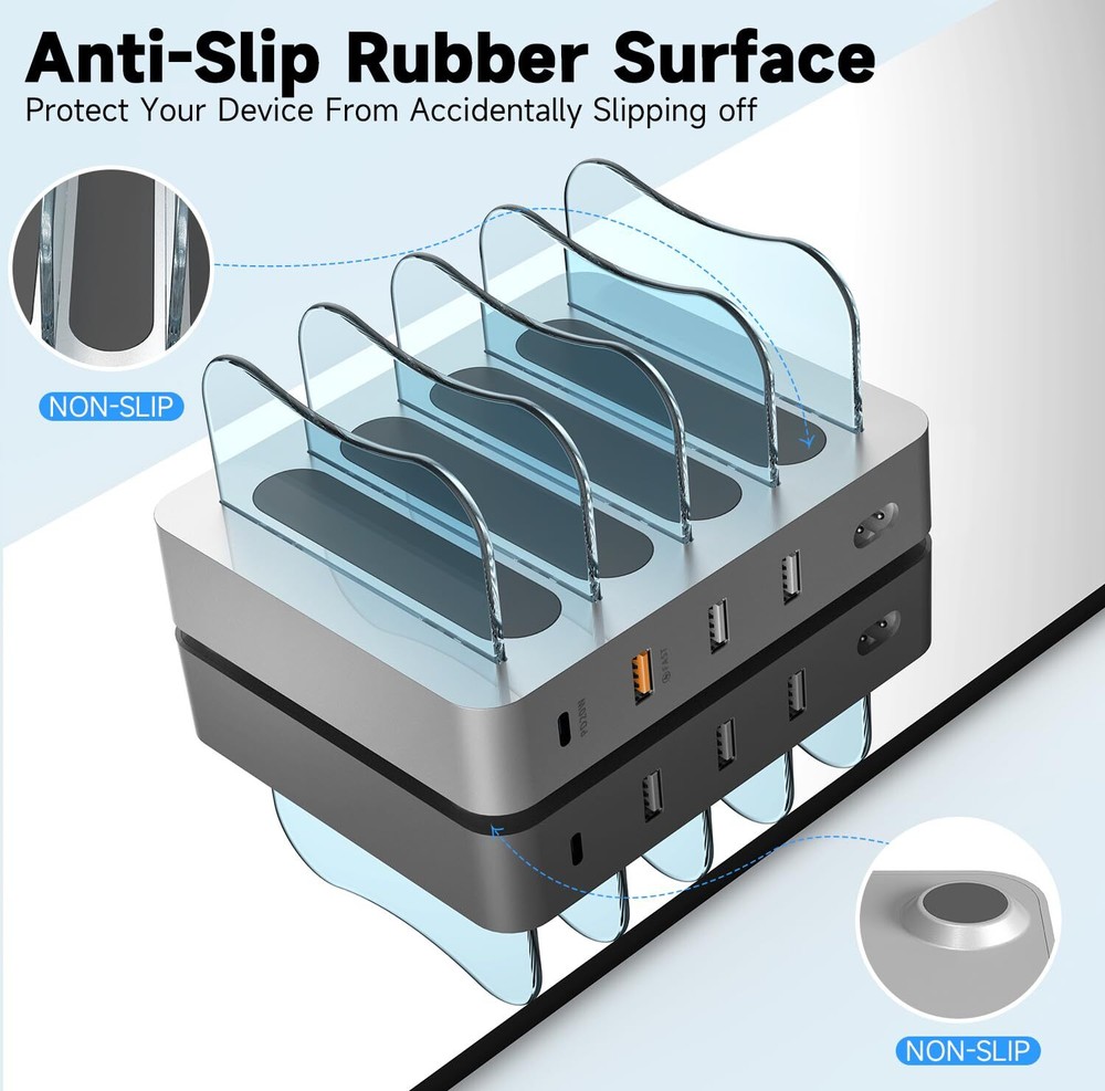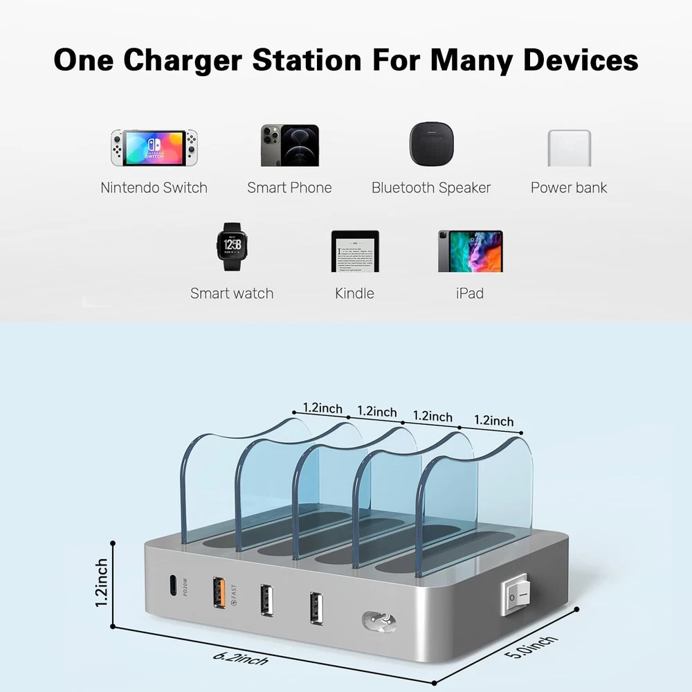 LOVE BY FAMILIES-This iPhone charging station is a great gift for your dads, moms, mother-in-law, father-in-law, sisters, brothers, coworker, girlfriend, boyfriend. Charging station can be used for your home, kitchen counter, desktop, nightstand, office Mutil Charging Station - 4 ports can charge 4 devices simultaneously also avoids cables cluttered around, which makes the devices spread all over the desk. The product do not Include 4 charging cords Charging Dock - This charging station has built-in Status LED INDICATORs. Also can be used as nightlight. Innovative removable baffle design– detachable baffles and bases can be effortlessly separated. Just choose one of the baffles to be left, then you have adequate space to fiddle with the posture of your devices, lying flat or sideways to charge Universal Compatibility - The multiple USB charging station is compatible with your Apple and Android phones, tablets, earbuds, kindles, and other consumer electronics 20W Usbc Fast Charger Stand - This iphone charging station equipped with a high-power 20W port adapter, which can work individually at a maximum of 20W. They are designed for devices such as iPhone, iPad, Samsung, and others that comply with the PD quick charging protocol Noted: The product do not Include 4 charging cords