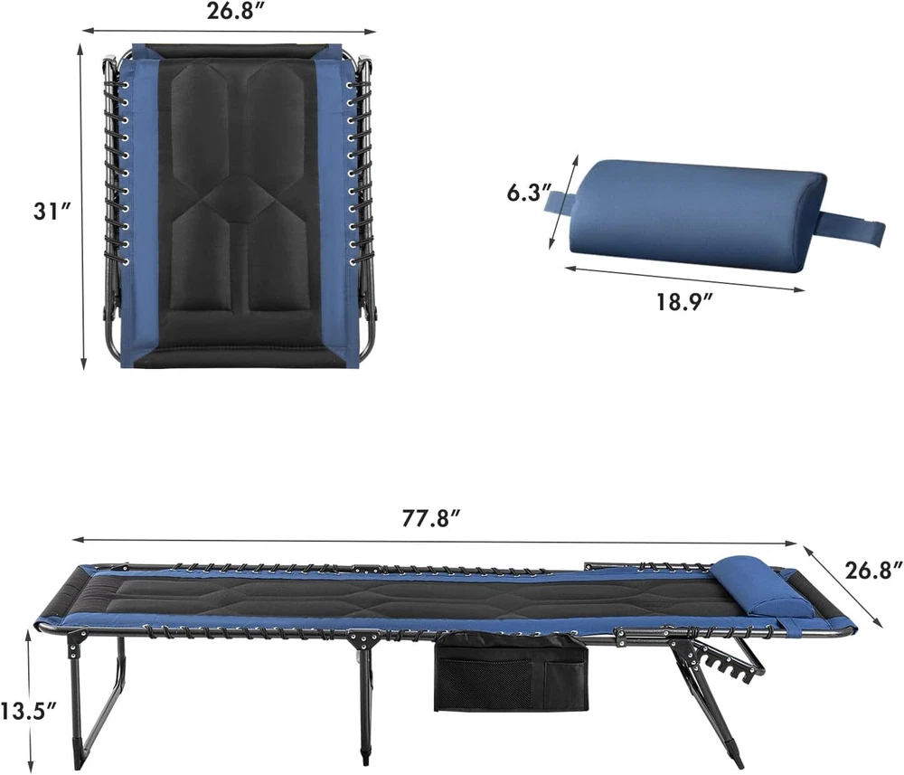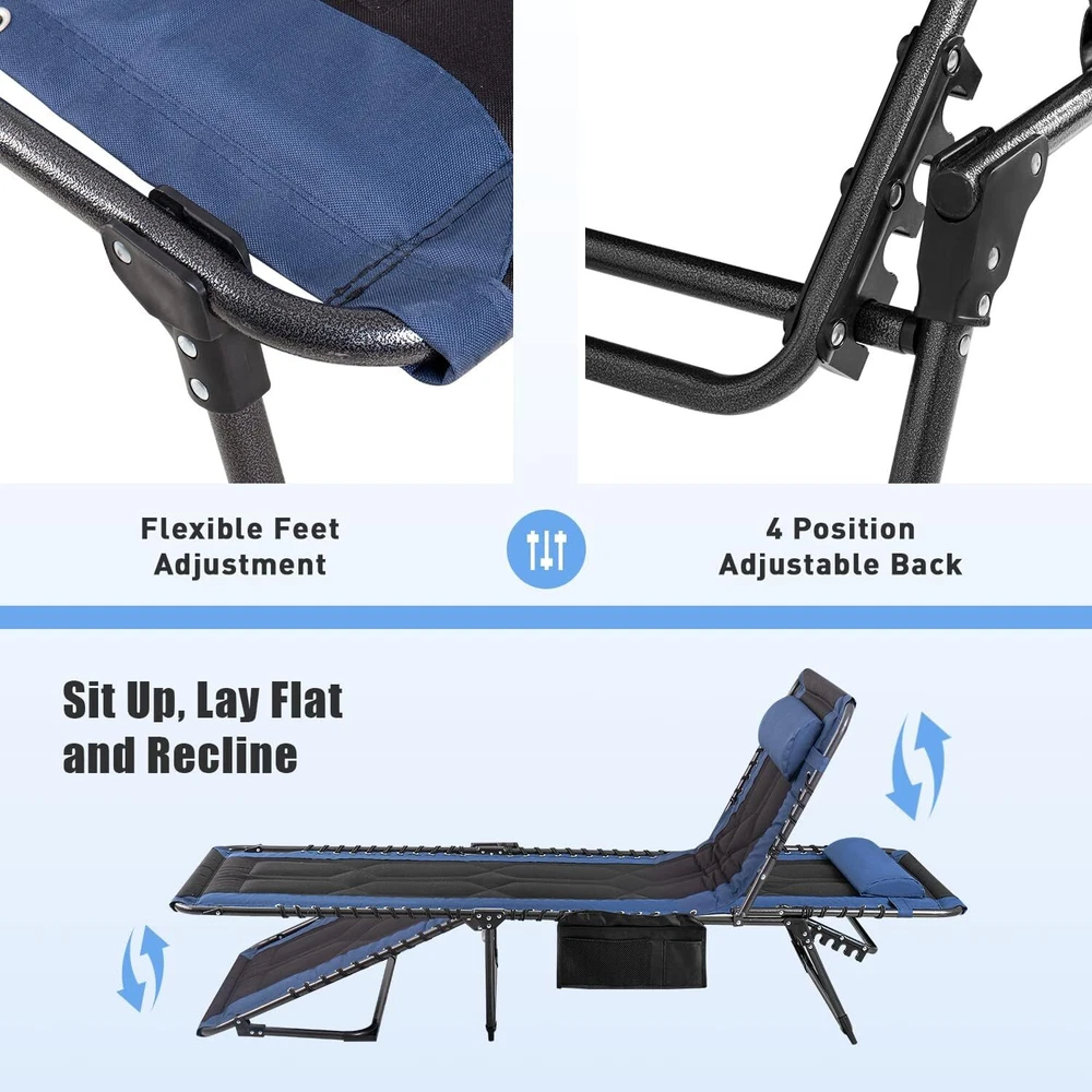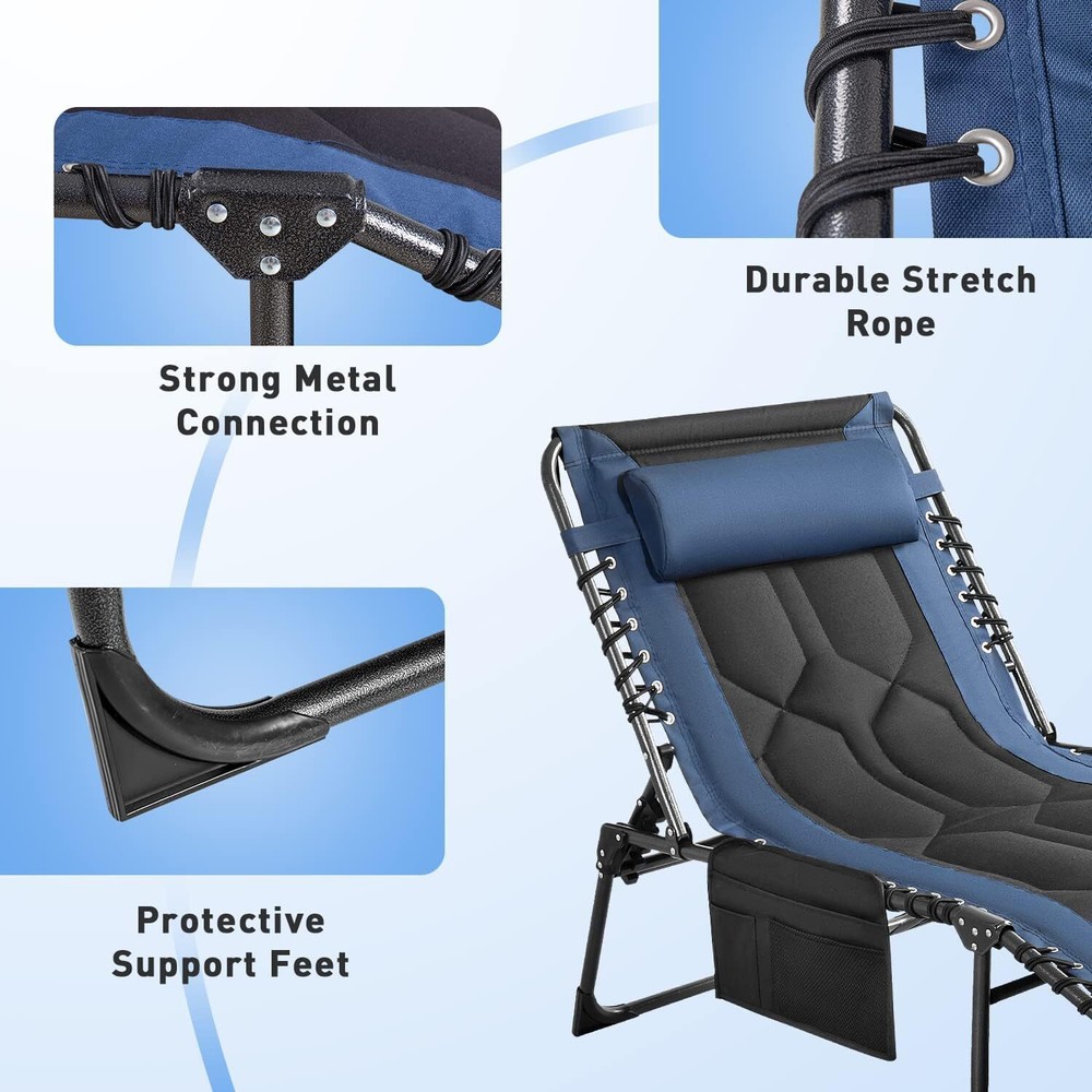 Absolutely love this lounge chair! The padded seat and adjustable recline make it super comfy for beach days or lounging in the backyard. The sturdy steel frame holds up well, and the included pillow and side bag are great bonuses. Super lightweight and folds easily—perfect for travel. The blue color looks fantastic and resists fading. Best outdoor chair I’ve owned!