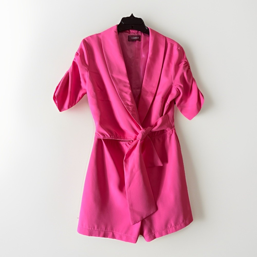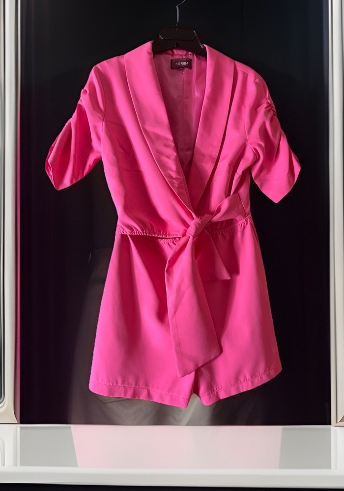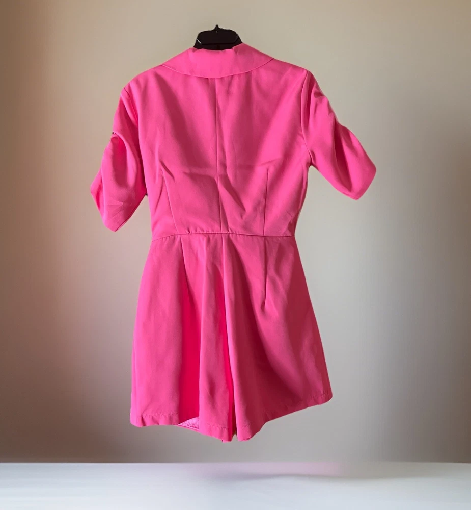 4SI3NNA Pink Romper M Blazer Top Belted Satin Lined Barbiecore Party Look 💖 Power Meets Play – 4SI3NNA Barbie Pink Romper (Size M) Step into the spotlight with this bold and beautiful Barbiecore-inspired romper by 4SI3NNA. This vibrant one-piece serves blazer-style confidence with the ease of a romper—tailored, belted, and fully lined in soft satin for a feel-good finish. Details: Brand: 4SI3NNA Size: Women’s Medium Color: Iconic Barbie Pink Shell Fabric: 100% Polyester – smooth and structured Lining: Luxuriously soft satin interior Top Half: Blazer-inspired with notched collar and shoulder pads for definition Sleeves: Gathered half-sleeves – elevated and chic Waist: Matching tie belt for a flattering silhouette Closure: Invisible back zipper Condition: Excellent pre-owned condition – no flaws, stains, or snags This piece is perfect for special events, rooftop dinners, or nights out when you want to make a statement. Just add heels and a bold lip—no accessories needed. 🎀 Style Tip: Pair with silver strappy heels and a mini clutch for a playful-glam finish.