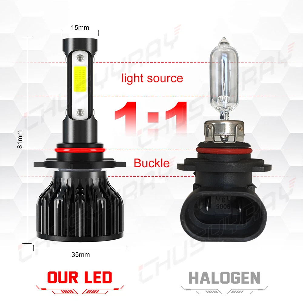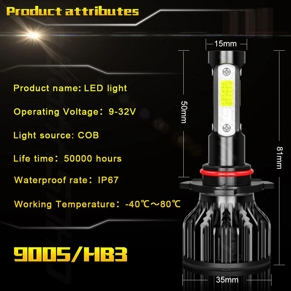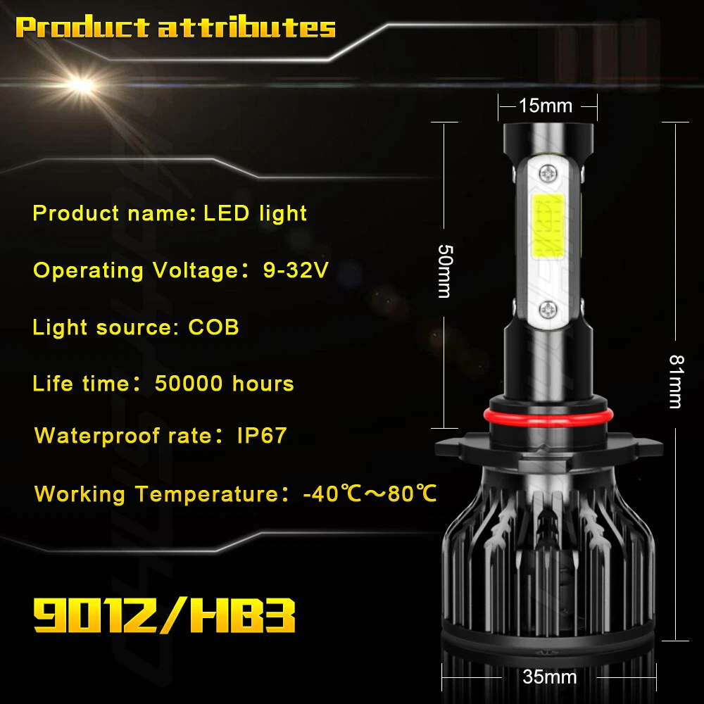 nformation: a)Compatible List can not show up all Car model. Please check the Correct item size of your vechicle. it will work and fit.Thank you! b)If you are unsure the item fit or not , please do remember send message to tell us your car make, model, year and other information which is helpful to check the item fit or not.For example: For 2004 Ford F 150, high/low beam For 2015 RAM 1500 with projector-type, high beam For 2019 Ford F 150 ,XL Crew Cab Pickup 4-Door 2.7L LED Quantity(each bulb): 4pcs*COB chips Operating Voltage: DC 9-32V(fit 12V,24V vehicles) Power:450W/Set,225W/Bulb Lumen:108000LM/Set,54000LM/Bulb Color Temperature: Pure White 6000K IP67 rated water and dust seal,over 50,000hrs lifetime Beam Angle: 270 degree@low beam,360 degree@high beam Material: Aviation 6063 aluminum profile Operating Temperature: -40-80 degree Celsius Usage: Headlight, Fog light Two-way heat dissipation channel 1.All-in-one aluminum profile as heat conduction system, 360 degree heat radiating 2.High speed mute fan (12000R/Min),high Air flow for faster cooling rate Package Included: 2x LED headlight bulbs 1x Packing Box Warranty: 5-Year warranty How to choose the correct size? To confirm the size in your original user manual or by checking the original bulb's back. To search in Google with “automotive bulb look-up “and find out the bulb size. To select your vehicle model in the filter system of our product detail page.(The filter system may not be 100% accurate, if you are not sure about the size, please make sure with us before purchasing) FREQUENTLY ASKED QUESTIONS OF LED 1.How can I find the right LED bulbs for my vehicle? Search for the vehicle year, make, model and the installation position in our store. If you are not sure about that, please contact us via ebay message with your vehicle year, make and model. Let us know which LED bulb you're interested in, so we can check the fitment and get back to you as soon as possible. 2.Will this bulb fit my vehicle? We can match almost any vehicle to one of our bulb sizes. eBay only lets us include 3,000 vehicle fitments per listing, but if your vehicle does not show up on the compatibility table at the top of our listings, welcome you to contact us for free consulation before purchasing a product. 3.I bought the wrong items/ the items were not compatible with my vehicle. Please contact us via ebay message to get quick support. 4.Neither side lighting up? Both sides flicker, flash, or work inconsistantly. Check the headlight fuses, and then check the ballast plugs to insure correct installation. If this doesn't work, there may be a voltage problem with the vehicle. You probably just need a relay or capacitor. 5.One side could not work? 1)please turn around the plug (swap the polarity) of the defective bulb and try again. 2)please exchange the bulbs from side to side and see if the problem could solve. 3)Please check your connection and fuse. 4)If still could not help, please contact our customer service, we will get back to you within 48 working hours. On Nov 13, 2024 at 06:36:56 PST, seller added the following information: