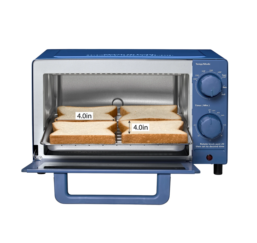 The Mainstays 4 slice Toaster Oven (MS5502550614-03) makes your life more convenient and efficient. It is perfect for preparing toast, sandwiches, pizza, and so much more. This toaster oven can accommodate up to 4 slices of bread or a 9-inch pizza, making it an ideal choice for busy households. The turn dial allows for easy adjustments to temperature mode and time settings, ensuring mealtime is swift and smooth. The compact size of this toaster oven uses less energy and counter space, making it easy to store. The sleek white finish coordinates beautifully with existing kitchen decor and color palettes, ensuring it seamlessly integrates into your home. The baking rack and baking pan are included, and the oven exterior is easy to wipe clean for quick and easy cleaning. The Mainstays Toaster Oven is sure to become a staple in your home cooking and baking ventures, bringing new experiences to your daily life. With its versatility, time-saving features, and stylish design, this toaster oven is a must-have for anyone looking to elevate their mealtime experience. Toast, Bake & Broil settings Fit 9-inch pizza or 4 slices of bread 2 Quartz heating elements Adjustable timer up to 60 minutes Power indicator light 1050 Watts of power Royal Blue, includes baking rack and baking pan