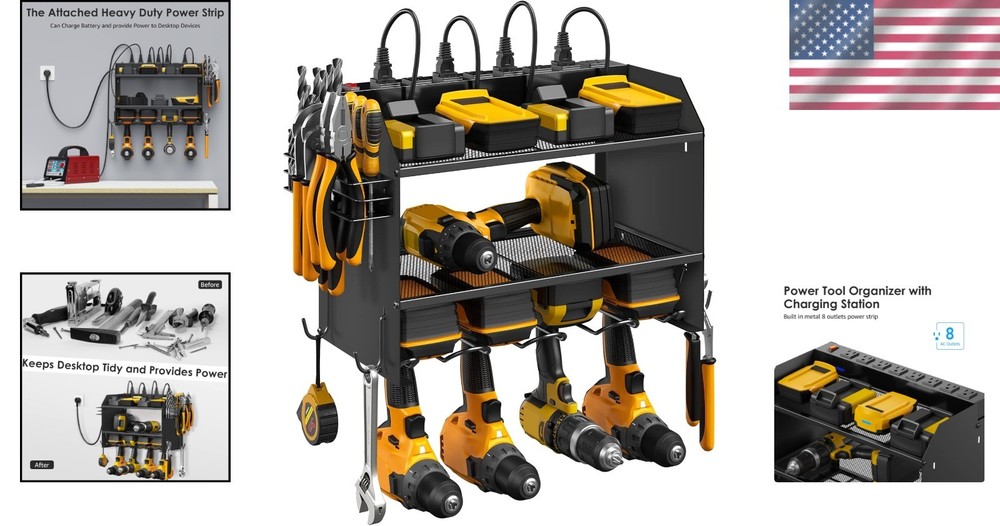 4-Slot Drill Organizer with Hooks & Surge Protection - All-in-One Power Tool Storage