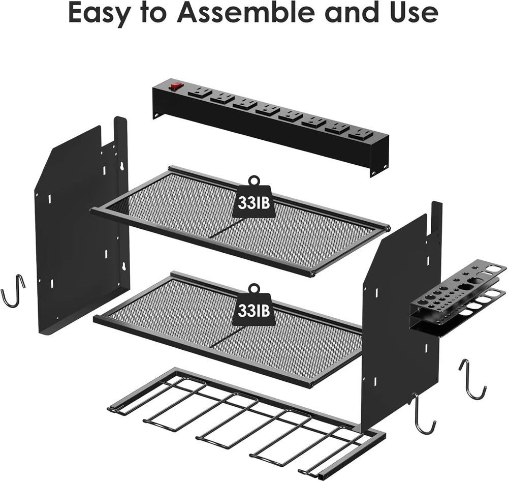 Special Feature: Built-in Power Strip With Surge Protection Finish: Metal Features: Assembly Required, Modular, Built-in Power Strip, Surge Protection, Wall Mount, Charging Station, Heavy Duty, Hooks for Tool Storage, Drill Bit Rack, Utility Rack Item Package Quantity: 1 Capacity: 33 lb Material: Metal Mounting Type: Wall Mount Recommended Uses For Product: Tools Batteries Required?: No Number of Items: 1 Item Diameter: 16.5 in Color: Black Shelf Type: Tiered Shelf Shelf Weight Capacity: 33 Pounds Product Dimensions: 3.03"d X 11.65"w X 17.63"h Size: Large Brand: Unbranded Special Features: Built-in Power Strip With Surge Protection Number Of Shelves: 2 UPC: Does not apply Type: Tool Storage Bin Style: Heavy Duty Room Type: Garage Number of Drawers: 0 gtin13: Does not apply Item Weight: 5 lb Assembly Required: Yes Finish Type: Metal