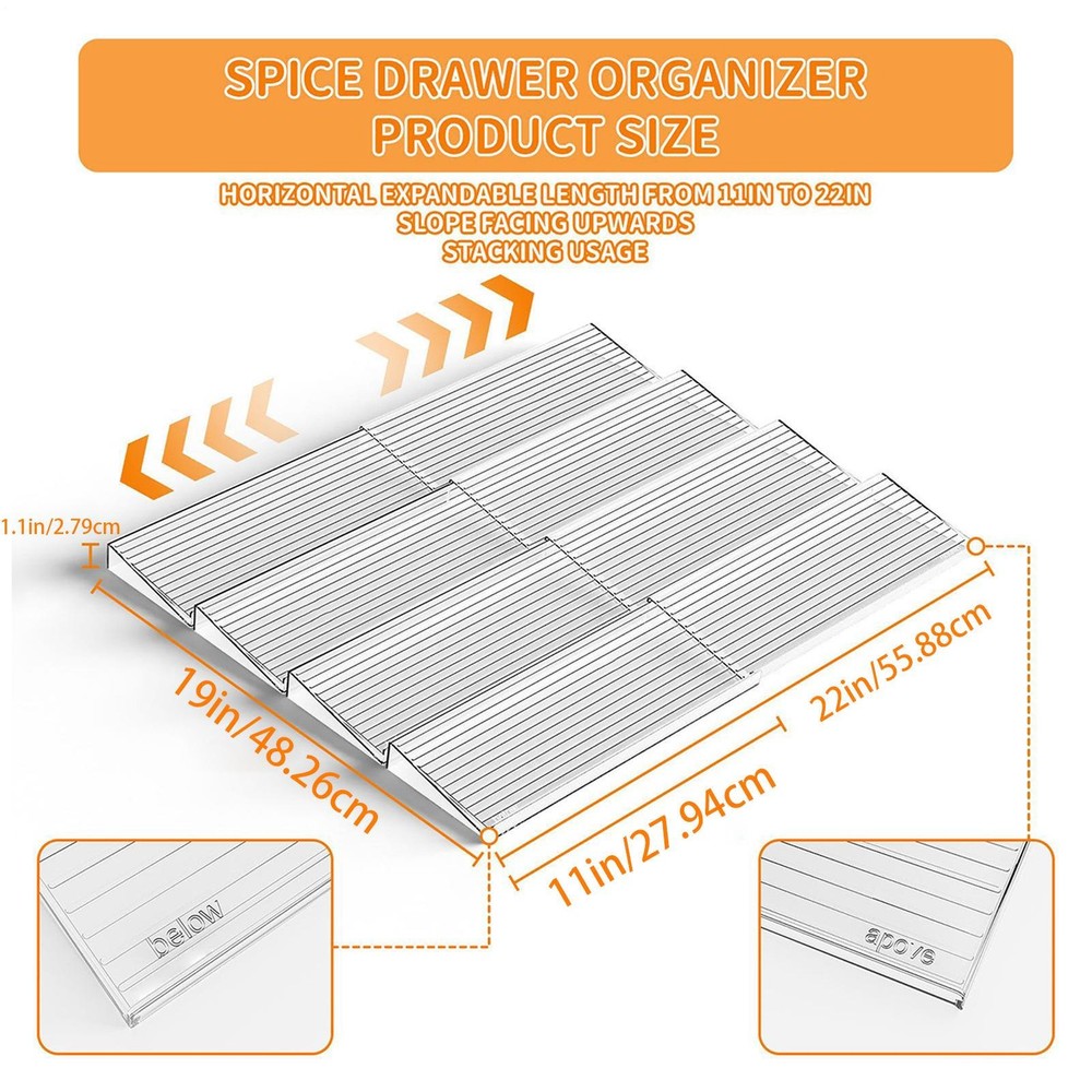 Spice Drawer Organizer, 4 Tiers Clear Acrylic Slanted in Drawer Seasoning Jars Product Description Bullet Points: Easy Bottle Arrangement: Featuring a step-like design with staggered storage, this organizer provides effortless access to seasonings and optimizes space-saving efficiency, accommodating multi-size bottles in an orderly and functional arrangement Convenient Seasoning Storage: Featuring four independent sections and an adjustable layout, this organizer provides wide drawer compatibility, with stackable components and raised anti-slip edges to keep contents securely positioned during daily use Versatile Bottle Compatibility: With the ability to store up to 24 bottles, this organizer delivers high-capacity storage and improves kitchen functionality by keeping seasonings neatly arranged and easily accessible in a compact unit Dependable and Easy to Clean: Crafted from sturdy materials, this seasoning drawer organizer resists deformation and rust while providing a smooth texture that provides easy cleaning and long-lasting use for your kitchen must-haves Effortless Seasoning Access: Featuring a ladder-style design, this organizer improves visual accessibility, enabling quick retrieval and a user-friendly layout to modernize kitchen tasks effectively This four-piece seasoning drawer organizer is expandable and stackable, providing versatile storage solutions. Designed to optimize kitchen, pantry, and cabinet spaces, it works suitablely for condiments and cooking items. Suitable for homes, RVs, apartments, rental houses, and restaurants, it keeps countertops easy with ease. Specifications: Product name: Drawer seasoning rack Product size: as shown in the pic Material: Polystyrene Packing List: 4 pieces * seasoning drawer organizer Note: Due to different lighting and screen settings, the item color may be slightly different from the picture. Due to different manual measurements, please allow a 1-2cm difference in size. Payment 1.PayPal is a preferred Payment method. 2.You can make a Credit payment via Paypal.Paypal will let you use MasterCard,Visa to pay. 3.Payment should be completed within 3 days after auction closed, or unpaid dispute will be filed for an closing auction.An unpaid case will be filled after 4 days. Delivery details 1. We ship to many countries. 2. Delivery Time: Ship from China via Speedpak to US (takes 8-12 days) Ship from China via others shipping method to other countries (takes 15-60 days) 3. If you want to choose another address, please leave us a message on ebay.Please check your shipping address carefully before checkout,it can't be changed if order completed. Seriously promise:Refund or resend will be offered if item still not arrive in 7-10 business days. Just send us an email,we will give you a satisfied solution as soon as possible. Return policy 1.All item comes with Basic 3 Months Sellers Warranty, if item defective in 3 months,We will offer replacement without extra charger (including shipping fee) After we receive the defective item. If item Defective after 3 Month, Buyers can still send it back, We will contact suppliers or Manufactory for Warranty. Buyers Might Need pay the Shipping fee For resend the replaced item. 2.If item DOA(Dead of Arrival), Buyers can return it in 30 Days, we will replace it with new item after we receive DOA item. Please Contact us Before you sent the item back. 3.All item can be returned for exchange only. The buyer has responsibility for all return shipping including DOA or defective return. About Feedback When you receive the item and satisfied with the product, please leave positive feedback and 5 scores DSR. We will leave a 5 Scores DSR feedback for you. If, for any reason you are not satisfied with your purchase, please contact via Ebay Message and we will do our best to resolve it. Please don't leave neutral or negative feedback without any communition with .