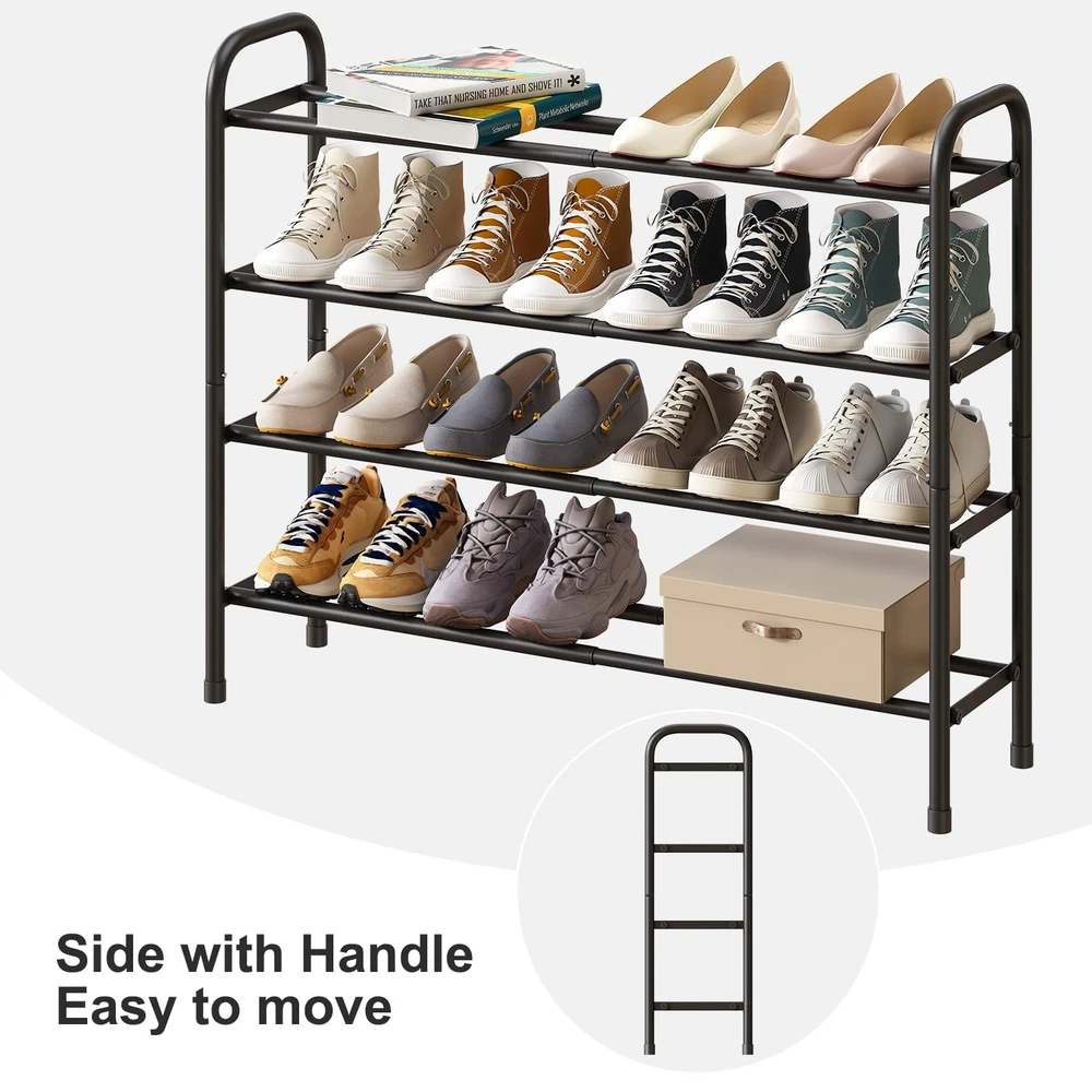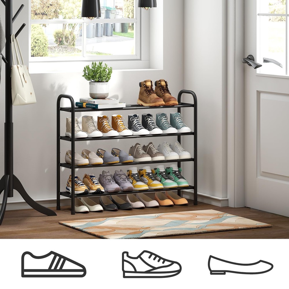 This shoe rack is a game-changer for keeping things neat! The adjustable length fits any space perfectly, and the four tiers hold tons of shoes without taking up much room. The sturdy metal frame feels solid, and the side handrails make moving it a breeze. Love how it keeps my closet organized while looking sleek—no more tripping over scattered shoes! Highly recommend for anyone needing smart storage.