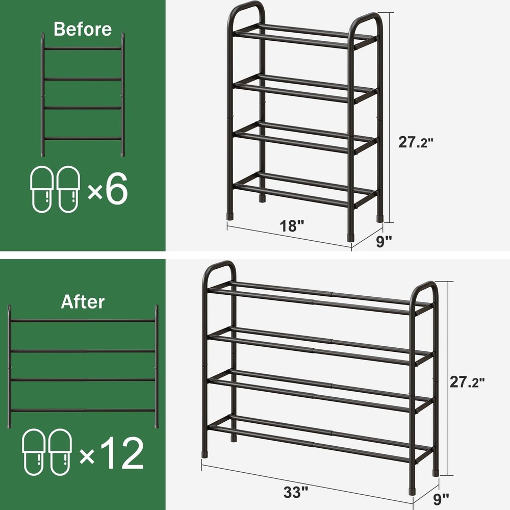 Expandable Shoe Rack 【Adjustable Length】The metal shoe rack features an adjustable length ranging from 18 to 33 inches, making it versatile for both small and large spaces. 【Four-Tier Large Capacity】With a four-tier design, 9 inches in width and 27.2inches in height, the shoe rack can accommodate 8 to 16 pairs of shoes. 【High-Quality Metal】Constructed from premium iron, this shoe rack is sturdy and capable of supporting a substantial amount of weight. Handrails are designed on both sides for easy movement. 【Edge Design】The edges of the shoe rack are smoothly finished with no sharp corners, ensuring safe use even in the dark. 【Easy Assembly】The package includes one shoe rack and a detailed installation guide.