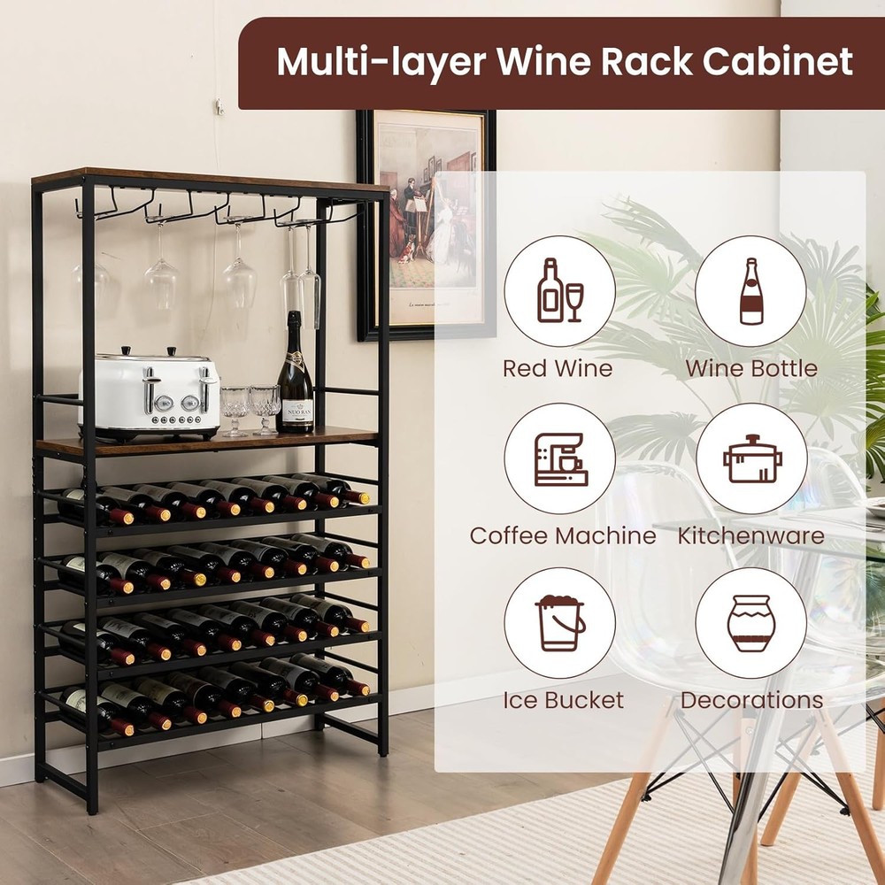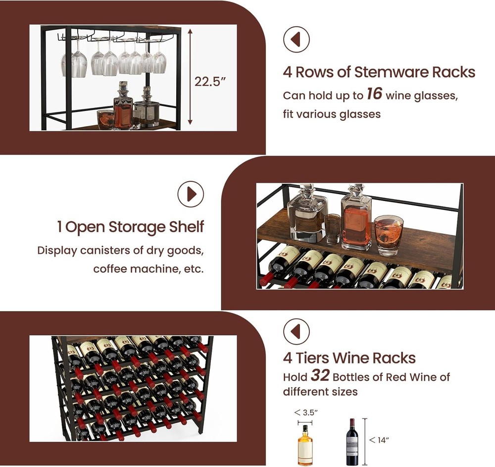 Product Description About this item Industrial & Modern Appearance: Our wine coolers are a perfect blend of industrial charm and sleek design elements. The attractive wood-grain top combines with the sleek black metal frame to blend seamlessly with a variety of room styles. Whether placed in your home bar, kitchen or dining room, this versatile wine rack will be a charming focal point in your living space. Secure & Solid Design: The reinforced metal frame ensures durability, while the adjustable legs provide a stable base. Each rack has a weight capacity of up to 110 pounds. Additionally, an anti-toppling devices securely attaches the wine rack to the wall, eliminating wobble and enhancing security. Ample Wine Storage Capacity: Boasting a generously spacious design, this wine storage shelf offers 4 rows of stemware racks and a 4-tier wine storage system. With the capability to accommodate up to 16 glasses and 32 wine bottles simultaneously, it provides an ideal storage solution for both your prized stemware and cherished wine collection. Versatile Storage Solution: with a spacious top and an open storage shelf, this industrial wine rack provides the perfect space for decorative items, wine coolers, ice buckets, utensils and even a coffee maker. This wine holder stand can also be used as a modern coffee bar, a practical kitchen shelf or a handy microwave rack for your unique and versatile daily needs. Easy to Assemble: Our floor standing wine rack is a breeze to assemble. We provide detailed instructions and all the necessary hardware so you can assemble this product quickly and effortlessly. In addition, its finished dimensions of 31.5" x 12" x 55" (L x W x H) ensure that it won't take up too much floor space in your home. Description: Are you still struggling with how to organize your wine and wine glasses? Let's have a look at this industrial 4-tier wine rack! 4 rows of stemware racks and 4 tiers of wine shelves ensure that this multi-purpose wine holder stand display can hold up to 32 bottles of wine and 16 glasses, and the countertop can also hold small kitchen utensils or a coffee maker. The sturdy metal frame makes this wine rack rust-resistant, stable, and resistant to wobbling. Adjustable feet add sturdiness and floor protection. To keep your items safe, an anti-falling bar and anti-toppling device are included to keep the wine rack stable. This freestanding wine rack is an ideal choice for you! Specification: Color: Rustic Brown + Black Material: Engineered Wood + Metal Overall Dimension: 31.5” x 12” x 55”(L x W x H) Distance Between Each Shelf: 22.5”, 6.5”, 5”, 5.5”, 5.5” Leg Height: 5.5” Bottle Capacity: 32 Glass Capacity: 16 Suitable Bottle Size: 2.2”-3.5” x 7.9”-13.8” (D x L) Weight Capacity of Each Shelf: 100 lbs Net Weight: 39.5 lbs Package includes: 1 x Floor Wine Rack 1 x Instruction