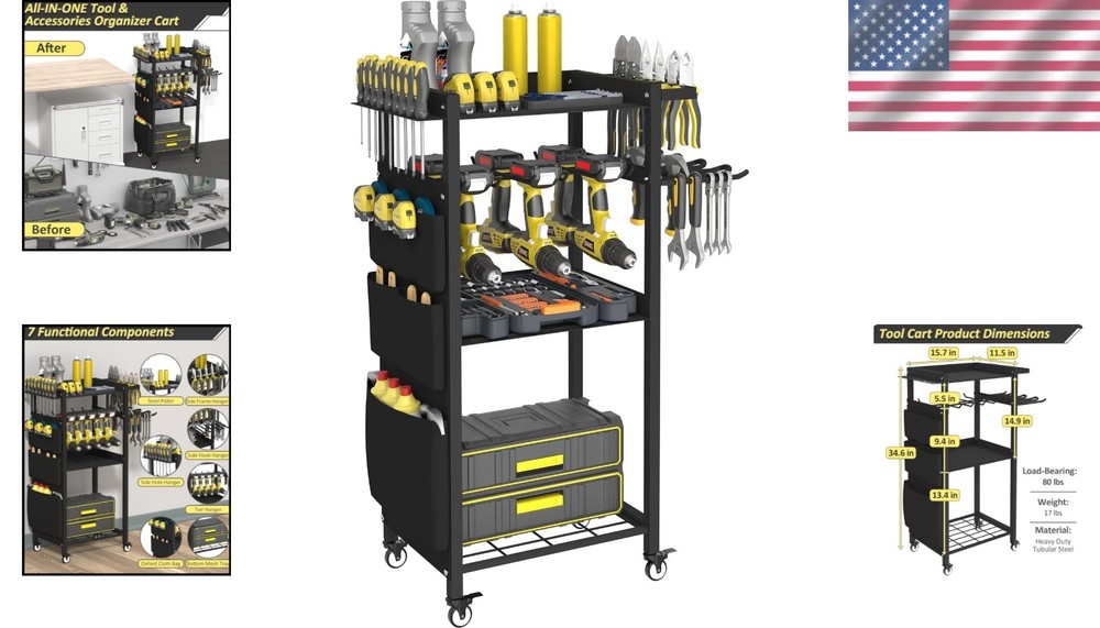 4-Tier Rolling Power Tool Organizer Cart for Efficient Garage Storage ‹ › ‹ › ‹ › ‹ › ‹ › ‹ › ‹ › ‹ › ‹ › 4-Tier Rolling Power Tool Organizer Cart Efficient Garage Storage Solution! All-In-One Utility Tool Cart: 4-tier design featuring 2 heavy-duty trays, 1 bottom mesh tray, and 1 tier hanger. Includes 3 versatile side organizer hangers and 1 side Oxford cloth bag. Organizes a wide variety of tools: drills, pliers, hammers, saws, screw boxes, and more! DIY Creative Combination: Customizable design lets you assemble it any way you like! Mix and match dual heavy-duty trays with tiered hangers to suit your unique needs. Side organizer hangers can be placed on either side, giving you ultimate flexibility. Robust & Practical Materials: Equipped with 360-degree brake casters for smooth mobility. Constructed from heavy-duty steel tubing with a durable black powder-coated finish. Exceptional load capacity of 500 lbs ensures it can handle your heaviest tools. Waterproof Oxford cloth bag includes multiple pocket openings for all tool sizes. Multiple Application Scenarios: Perfect for garage, workshop, studio, workbench, and DIY experiences. A thoughtful gift for woodworking enthusiasts or DIY hobbyists! Satisfaction Guarantee: Choose our Power Tool Organizer Cart for an organized and efficient workspace! We are committed to high-quality products and exceptional service. Enjoy a 1- guarantee, a 90-day refund policy, and 24-hour friendly customer support. Don't miss the opportunity to elevate your garage organization—order your 4-Tier Rolling Power Tool Organizer Cart today! Shipping Free & Fast Shipping - We offer free shipping to most of the USA with a normal delivery time of 3-7 days. However, due to the current situation, additional delivery time (up to 3 weeks) may be required for some items. Alternative Carriers - We may use alternative carriers (e.g. USPS, FedEx, UPS, etc.) to ensure your package arrives safely and on time. Due to the use of multiple carriers, we are unable to provide a tracking number automatically. Handling Time - Orders are processed and shipped within 1-2 business days of receiving cleared payment. Shipping Restrictions - Shipping to Alaska, Hawaii, Puerto Rico, Guam, and other US territories may incur shipping charges or delivery restrictions. Please contact us before ordering, or your order can be refunded/cancelled. State Restrictions - There may be restrictions based on your state of purchase. For example, certain items may not be shipped to California due to state regulations. Contact for Tracking Updates - If you require tracking updates or have any concerns about the delivery of your order, please feel free to contact us, and we will be happy to assist you. Return 30-Day Hassle-Free Returns - We want you to be completely satisfied with your purchase. If you are not, you can return the item within 30 days of receiving it for a full refund or exchange. Easy Return Process - To start a return, simply contact us and we will provide you with a prepaid return shipping label and detailed instructions. Restocking Fee - There are no restocking fees for returns. However, the buyer is responsible for return shipping costs if the return is not due to a seller's error. Refund Processing Time - Refunds will be processed within 5 business days of receiving the returned item in its condition. Payment We accept all major credit cards, PayPal, and Apple Pay for your convenience. Your payment information is secure and encrypted to ensure a safe and seamless transaction. Please complete your payment within 3 days of purchase to avoid any delays in shipping. Feedback Your feedback is extremely important to us. We strive to provide the best products and customer service possible. If you are satisfied with your purchase, please take a moment to leave us a positive review. If you have any concerns or issues with your order, please contact us before leaving negative feedback. We are committed to resolving any problems and ensuring your satisfaction. Contact Us If you have any questions or concerns, please feel free to out to our customer support team. You can contact us through the eBay messaging system. We are available Monday to Friday, 9:00 am to 5:00 pm EST, and we will do our best to respond to your inquiry within 24 hours. Buy it now and enjoy a pleasant shopping experience! Item Width: Rolling Tool Organizer Item Length: Rolling Tool Organizer Item Height: Rolling Tool Organizer Item Diameter: 34.6 Item Weight: 7.71 kg Unit Quantity: 1 Features: Wheels,4 tiers,2 heavy-duty trays,bottom mesh tray,tier hanger,3 side organizer hangers,side oxford cloth bag,DIY style,360-degree casters,waterproof material,thick oxford cloth,easy assembly,scratch resistant,load capacity 500 lbs Type: Tool Cart Number of Items: 1 Material: Steel Number of Drawers: 0 Size: Medium Capacity: 500 lbs Color: Black Finish: Powder-coated Unit Type: kg