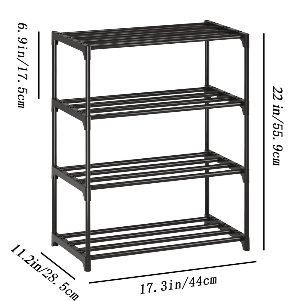 Small Shoe Rack, Metal Stackable Kids Shoe Shelf Storage Zapateras Organizer,Narrow Shoe Rack Sturdy for Closet Hallway Entryway Living Room Bedroom 【High-Quality Materials】-This metal shoe organizer is made of high-quality metal tubes and high toughness plastic connector which is waterproof, dustproof and oil-proof. 【Stackable & Expandable 】-2 sets or more can be stacked vertically to form a complete 7-layer shoe rack or even higher shoe tower. The middle layer can be removed to place long boots to meet the needs of different shoe types(dress shoes, ballet shoes, sneakers, running shoes, hiking boots, canvas shoes, sandals and more. ) 【Multifunctional】-This small shoe rack is not only for shoes,It could be a display stand for your toys, books,plants and more.It also works great for kitchen food containers storage and garden supplies storage. This storage rack is a perfect choice for renters and dormitories. 【Space Saving】-A perfect design to reduce cluster and make everything neat and organized.Dimension: 17.3" W x 11.2" D x 22" H. A good solution to keep your entryway, closet, dormitory, patio, mudroom and garage away from messes. It’ll safely accommodate your ever-expanding shoe collection while saving your valuable floor space. 【Easy And Quick Assembly】-The simple structure and light weight make the rack very convenient for you to assemble and disassemble. Installation requires only a few easy steps and no special tools are needed. Easy to clean with a dry or damp cloth and effortless to reposition and transport.