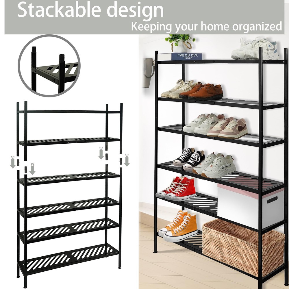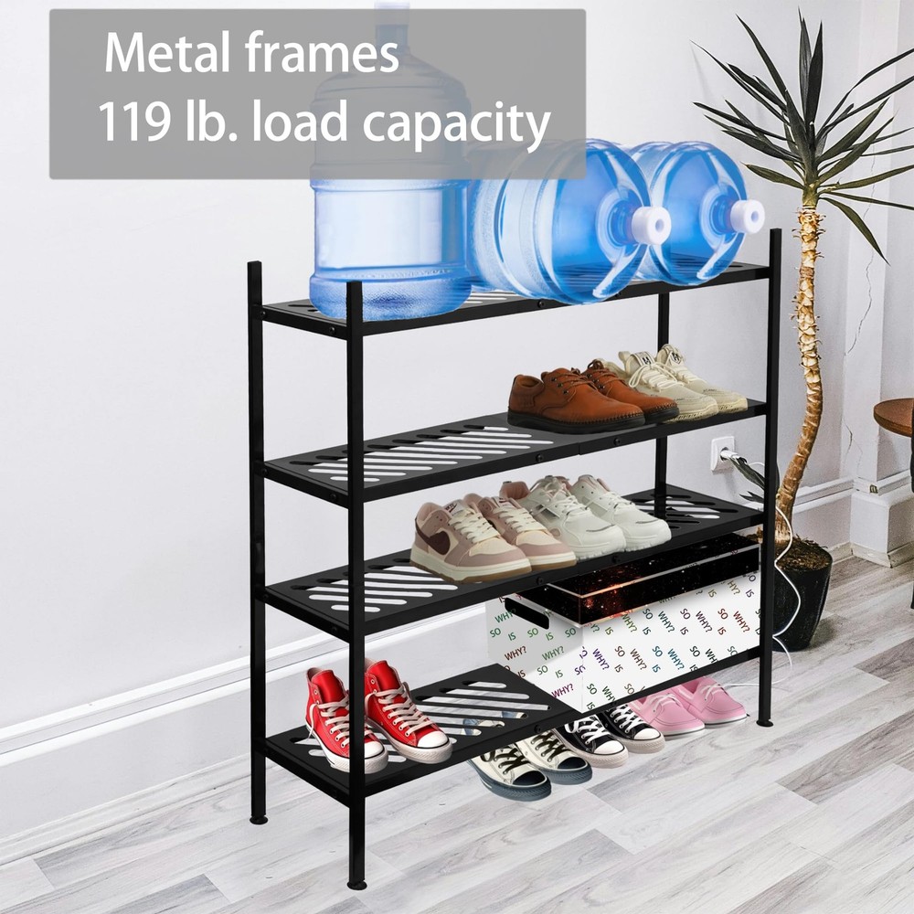 Shoe Rack, 4-tier FreeStanding Shoe Shelf Stand, Stackable Shoe Storage Organizer for Closet, Holds up to 20 - 24 Pairs of Shoes for Entryway, Garage, Front Door Entrance, Metal, Black LARGE CAPACITY: 4 tiers of heavy-duty shoe organizer can store up to 20-25 pairs of women's and children's shoes, each unit can be easily organised to store 4 pairs of adult trainers and tennis shoes, extra bottom storage for 6 pairs of slippers, flip-flops and flats,each shelf can hold up to 35lbs STACKABLE SHOE RACKS: 2 sets of shoe organizer racks can be stacked vertically to form a complete 8-tier shoe stand, stacked high shoe racks can remove one unit of shelves to provide more space for tall boots, space-saving and tidy, with adjustable feet on the bottom to adjust the balance on unbalanced floors SIZE: L 34.2 inches x W 8.8 inches x H 34.6 inches, the distance between each unit of the shoe holder is 8.6 inches EASY TO INSTALL: It only takes a few minutes to install the sturdy shoe storage rack! Comes with installation instructions and necessary screws, no tools required MULTIFUNCTIONAL: Multi-tier shoe shelves is suitable for wardrobes, front door entrances, garages, entryways and indoor-outdoor corners