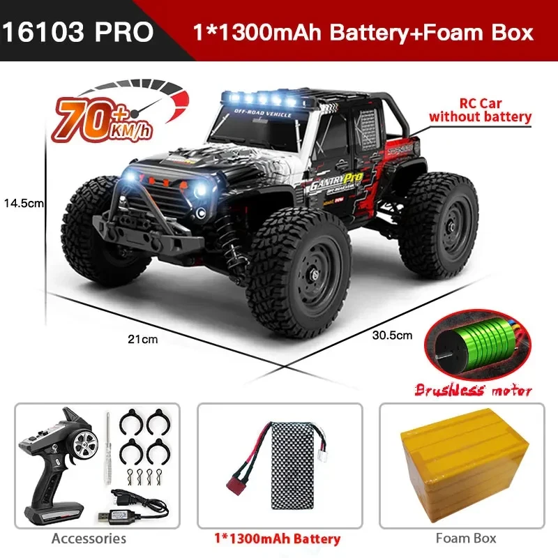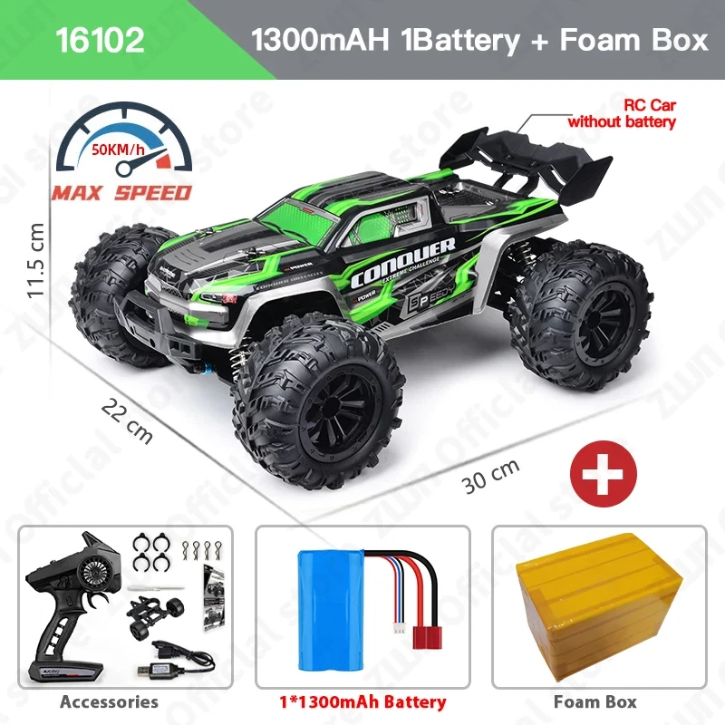 eBay Note1: Batteries come in styles 1 and 2, and are shipped randomly Note2: 1. Brushless model:16101PRO, 16102PRO, 16103PRO, 16104PRO. Brushed model:16101, 16102, 16103. 2. The ideal speed of 16101PRO, 16102PRO, 16103PRO, 16104PRO is 70KM/H, but the actual speed will be affected by other factors such as the venue. The actual speed of 16101PRO, 16102PRO, 16103PRO, 16104PRO is about 60KM/H. The ideal speed of 16101, 16102, 16103 is 50KM/H, but the actual speed will be affected by other factors such as the site. The actual speed of 16101, 16102, 16103 is about 35KM/H. 3. This is not an ordinary toy remote control car, because the remote control car is too fast, it is recommended to use remote control car in open areas to avoid bumping into obstacles. 4. The retail package is made of foam boxes, which can reduce the damage to the product during transportation. Original boxes are not included. Please note when using the battery: 1. When the battery is dead, it must be charged in time to ensure that the battery has surplus power. If the battery is completely empty, the battery will not be able to charge 2. When charging the battery, disconnect the connection from the remote control car. Be sure to take the battery out to charge it separately 3. If you do not use the remote control car, please disconnect the battery from the wire of the remote control car, absolutely do not connect, and fully charge the battery, otherwise it will damage the battery Suggest that everyone buy multi-battery package, so play more fun!! We recommend: that you watch the video and read our description carefully before you buy ZWN 1:16 70KM/H 4WD RC Car With LED Headlight Remote Control Cars High Speed Drift Monster Truck for Kids vs Wltoys 144001 Toys Note: Please note to distinguish the model before purchasing the order. The model parameters are as follows: 1. Ltem Name:16101PRO/16102PRO Size:30*23*11.5CM Maximum speed:70KM/H Battery:7.4V 1300mAh/1500mAh Driving motor:2840 brushless motor (4000 KV value) Weight:1000g Working time:16Mins 2. Ltem Name:16101/16102 Size:30*23*11.5CM Maximum speed:50KM/H Battery:7.4V 1300mAh Driving motor:RC390 high-speed carbon brush strong magnetic Weight:930g Working time:15Mins 3. Ltem Name:16103 Size:30*23*13.8CM Maximum speed:50KM/H Battery:7.4V 1300mAh Driving motor:RC390 high-speed carbon brush strong magnetic Weight:900g Working time:15Mins Features 1. The simulation structure design is adopted, which has the control feeling of a real car, and realizes full-scale continuously variable speed change, high-speed driving, rapid acceleration, deceleration, braking, reversing, left turn, right turn; 2. Applicable site: flat, sand, mud, grass. 3. Four-wheel drive: front and rear upright spring shock absorption, double wishbone independent suspension system; 4. 2.4G full-scale synchronous remote control system. Full-scale throttle/steering; 5. Metal differential, metal differential cup, powder planetary gear, powder driving gear, powder main gear; 6. Metal CVD front drive shaft, metal rear dog bone, metal wheel cup; 7. Three-wire 17G digital servo; 8. 7.4V, 18650-1300mAh/1500mAh Li-ion battery (T plug), discharge rate 15C; 9. New remote control panel function: rudder size adjustment; 10. The whole vehicle adopts 16 ball bearings; 11. Metal second floor, metal front and rear arm yards, metal middle drive shaft; 12. The car shell adopts high toughness explosion-proof PVC car shell; 13. Equipped with LED headlights; (three modes: always on, slow flash, fast flash); 14. Equipped with head-up wheel; 15. Simulation of big feet tires, strong grip; 16101PRO ● 1:16 OFF-ROAD HIGH SPEED CAR ● 50KM/H+ All-terrain adaptation ● 3 eye-catching configurations ● 3 major el ectronic configurations ● 8 body structures ● Multiple exclusive Configuration introduction ● Big ofi-road tires ● Professional deployment and craftsmanship ● Multiple exclusive Configuration introduction ● High-brightness LED lights ● Planetary gear differential ● Equipped with head-up wheel ● 6 majors Design configuration function ● High strength and toughness ● 2.4GHz remote control --About Guarantee: 1. 12 months Manufacturer`s limited Warranty for defective items (excluding items damaged and/or misused after receipt). Accessories come with a 3-month warranty. 2. Defective items MUST BE reported and returned within the warranty period (and in the original packaging, if possible). You must tell us what the defect is and give us your order number. WE DO NOT REPAIR OR REPLACE ITEMS WITH AN EXPIRED WARRANTY. You agree to all of the above-listed policies upon ordering on aliexpress! --About Feedback: We maintain high standards of excellence and strive for 100% customer satisfaction! Feedback is very important We request that you contact us immediately BEFORE you give us neutral or negative feedback, so that we can satisfactorily address your concerns. It is impossible to address issues if we do not know about them!