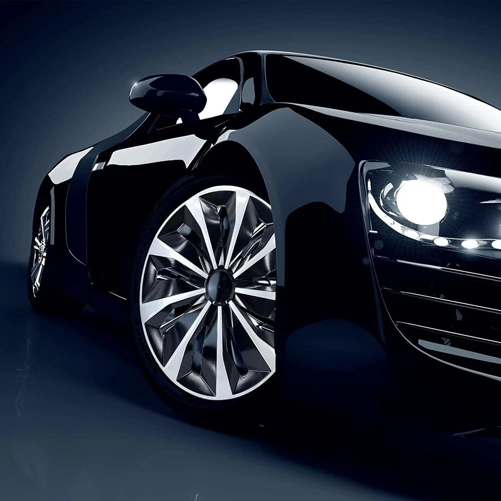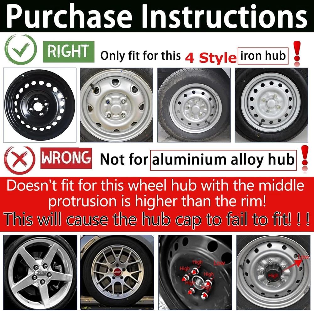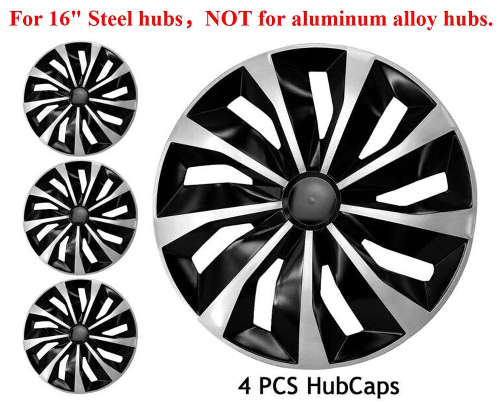 Fitme nt : For most ca rs with steel wheels, design for 16" Steel hubs,NOT for aluminum alloy hubs. Item Features: Make sure you have 16" steel wheels. Measure this by checking the number after the "R" on your tires. It must say R16! Brand new condition, includes four hubcaps, one pair of gloves, four tire valve covers, one screwdriver, four tie-downs and installation instructions Fits perfectly with a factory-quality glossy black finish that adds a stylish look to your vehicle Features premium durable ABS plastic construction Easily and securely mounts to your existing steel wheels Item Specifications: Size: 16 inch Color: Silver+Black Installation Type: Snap-On Model: Universal Hubcap for Iron Wheels Net Weight: 7.2 Pound DESCRIPTION PLEASE MAKE SURE YOU HAVE 16" STEEL WHEELS. Measure by checking the number after the "R" on your tires. IT MUST SAY R16! This pack contains four hubcaps, a pair of gloves, a screwdriver, four suitable tyre valve cores ,Four tie-downs and installation instructions. This product is easy to install, simple and stylish Packing List: 4 X Hub Caps NOTE: (1)It would be highly appreciated if you might contact us first once you have any problems concerning the items. And you can expect all the issues would be resolved ASAP! (2)Please let us know before you send us the neutral/negative feedback that wont help to finish the issues. And I will definitely try my best to provide the best solutions which would meet our satisfactory!