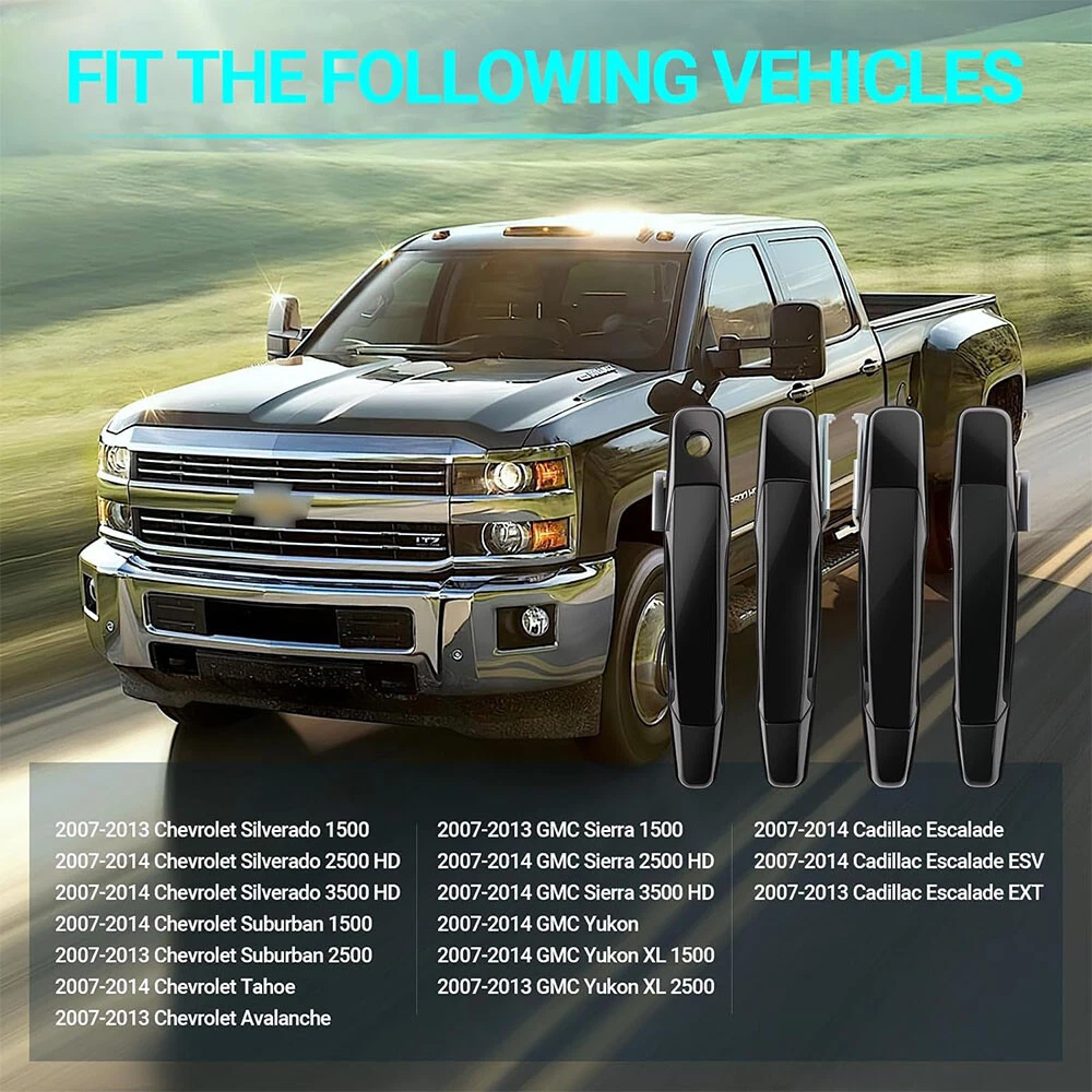 The exterior door handle fits the following vehicles: Cadillac Models: 2007-2013 Cadillac Escalade 2007-2013 Cadillac Escalade ESV 2007-2013 Cadillac Escalade EXT Chevrolet Models: 2007-2013 Chevrolet Avalanche 2007-2013 Chevrolet Silverado 1500 2007-2013 Chevrolet Silverado 2500 HD 2007-2013 Chevrolet Silverado 3500 HD 2007-2013 Chevrolet Suburban 1500 2007-2013 Chevrolet Suburban 2500 2007-2013 Chevrolet Tahoe GMC Models: 2007-2013 GMC Sierra 1500 2007-2013 GMC Sierra 2500 HD 2007-2013 GMC Sierra 3500 HD 2007-2013 GMC Yukon 2007-2013 GMC Yukon XL 1500 2007-2013 GMC Yukon XL 2500 4X Black Exterior Door Handle For 07-13 Chevy Silverado Tahoe GMC Yukon Sierra The exterior door handle fits the following vehicles: Cadillac Models: 2007-2013 Cadillac Escalade 2007-2013 Cadillac Escalade ESV 2007-2013 Cadillac Escalade EXT Chevrolet Models: 2007-2013 Chevrolet Avalanche 2007-2013 Chevrolet Silverado 1500 2007-2013 Chevrolet Silverado 2500 HD 2007-2013 Chevrolet Silverado 3500 HD 2007-2013 Chevrolet Suburban 1500 2007-2013 Chevrolet Suburban 2500 2007-2013 Chevrolet Tahoe GMC Models: 2007-2013 GMC Sierra 1500 2007-2013 GMC Sierra 2500 HD 2007-2013 GMC Sierra 3500 HD 2007-2013 GMC Yukon 2007-2013 GMC Yukon XL 1500 2007-2013 GMC Yukon XL 2500 OEM Part Number 84053434 22738721 20828258 22738721 25960525 GM1310163, 84053436 22738722 15915150 25960526 GM1311163, 84053448 22738725 15915659 25960521 GM1520130, 84053450 22738726 15029900 15150760 GM1521130 Package: 4 x Door Handles Payment Delivery details Terms of sales About us Contact us Payment 1.We only accept PayPal. PayPal is the only online payment method we accept. Please make sure you have a valid/confirmed PayPal account prior bidding. 2.All Paypal Payments must be Confirmed. Payment must be made within 48hrs of the auction end time. Non-Paying bidders will be reported. 3.When you get your package,maybe you will pay some charges, it's taxes for local customs,not pay to us, and the fees are depends on the customs, all buyer are same. Delivery details 1.Items will be shipped within 2 business days after payment is received. 2.We ship to your eBay address. Please make sure your eBay address is correct. Buyer takes responsibility if eBay address is wrong. 3.Import duties, taxes and charges are not included in the item price or shipping charges. Please check with your country customs office for these additional charges. 4.We shipping using UPS or USPS from our nearest warehouse to you. Tracking numbers will be emailed upon shipment. Terms of sales 1.Please feel free to email us if you have any question. 2.We appreciate you contact us via eBay message when you are not satisfied rather than open case or leave negative feedback directly. We'll try our best to solve the issue. 3.Refund will be issued once we receive your returned items. Buyer is responsible for all return shipping charges. 4.Please contact us for return process before you return the item. 5.All items for exchange or refund must be returned in "as new" condition. About us We are the responsible seller ,always provide high-quality products and best service .If you have any questions, please contact us, and will try our best to help you. Please contact us by eBay Message, and we will reply you within 24 hours. Thank you very much! Contact us We are the professional auto parts manufacturer , and provide line lock, AN hose end fittings , fuel line , fuel filter , fuel regulator , exhaust cutout , exhaust tips , exhaust muffler and so on .The quality of the product to be secured. If you have any questions or any needs , please contact us , and will try our best to help you.