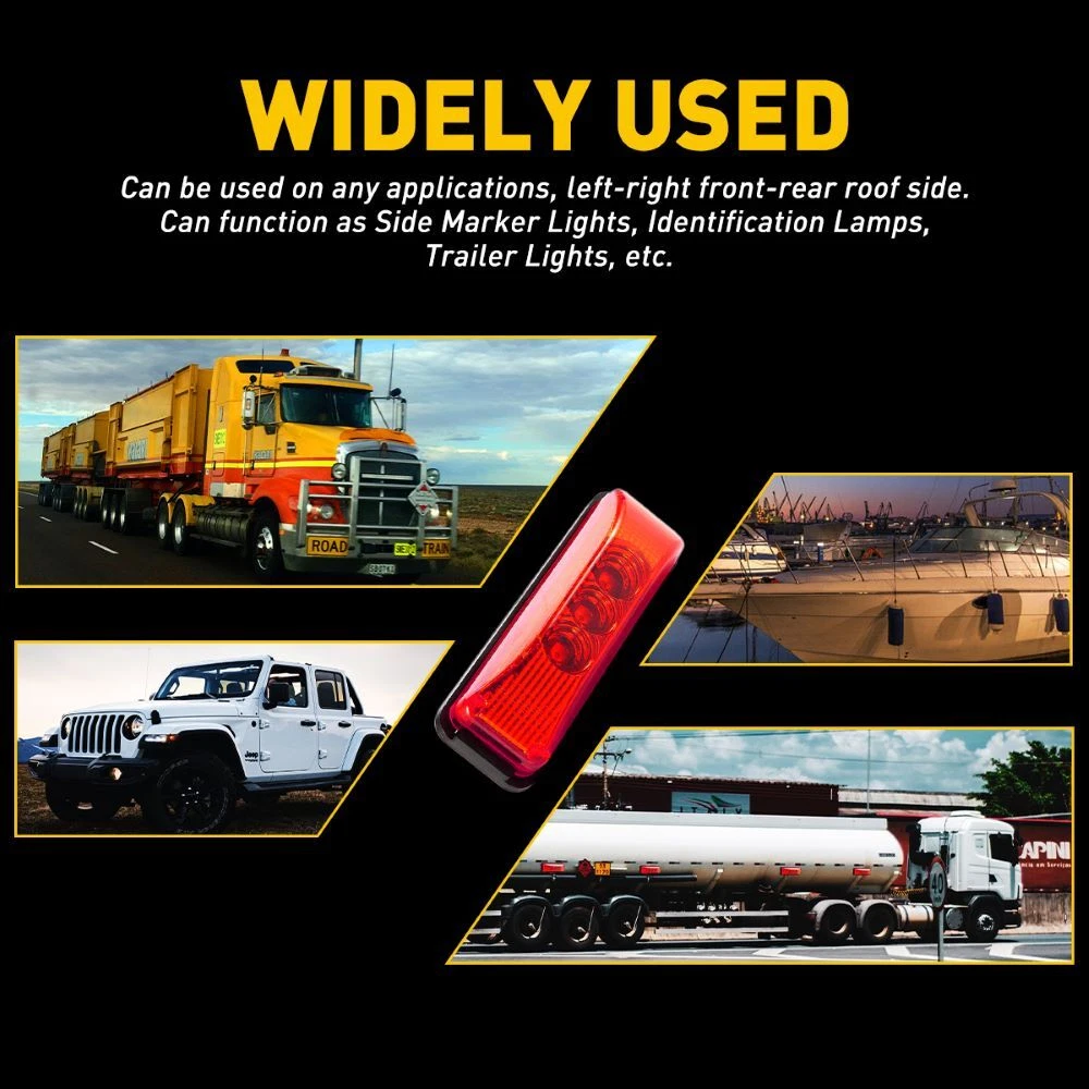 Fitment Type: Direct Replacement Universal Fitment: Yes Bulb Life Hours: Up to 50000 Hours Voltage: 12V Manufacturer Part Number: CBD-197-R-4PCS Material: ABS, PC lampshade Function: Clearance light with built-in reflector optics Waterproof: IP67 Number of Bulbs: 4 Type: Clearance Side Marker Light Brand: AUXITO UPC: Does not apply Suitable For: Truck, RV, Boat, Trailer, Truck, Camper, Bus, Lorry, Van Lighting Technology: LED To Fit: Accessory Light, Daytime Running Light, Side Marker Light gtin13: Does not apply Features: Low power, low consumption, long service life,Waterproof Manufacturer Warranty: 2 Years Lens Color: Red Housing Color: Red Placement on Vehicle: Front, Rear, Left, Right, Upper, Lower