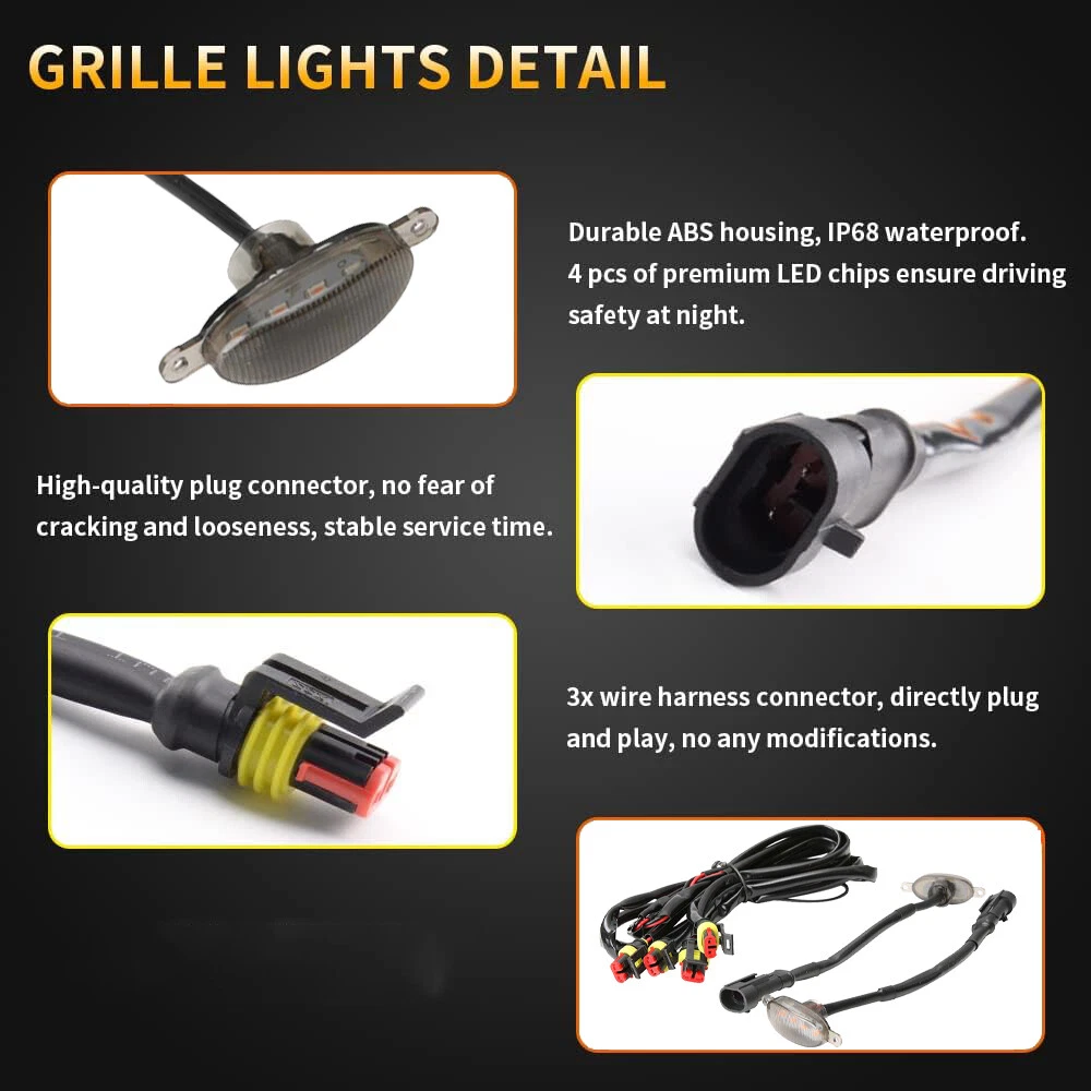 4X Smoked LED Front Grille Grill Running Amber Lights For Ford F150 Raptor Style Fitment This Grille Lights Compatible with Ford F150 F250 F350 Raptor Front Grille. Fit Ford F150 F250 F350 The Compatibility Is Just For Reference. Please Compare With Your Car Before Purchasing! Specification Len Color: Smoked lens LED Color: Amber Type of Lights: LED Front Grill Lights Material: Smoked ABS Lens & Durable Black ABS Housing Light color: 2500K Amber Installation position: Front Grill/Grille Mesh Work Temperature:-40 - 60 centigrade degree Voltage: DC 12-24V Feature 【Amber LED Grille Lights】 High brightness amber lights. Package include: 4Pcs Grille LED Lights Kit & Harness Cable Kit (Grille is not included) 【Waterproof & Premium ABS】 IP68 waterproof. Made of durable ABS material, high strength, weather resistance, good heat & corrosion resistance, Non-fading, Non-discoloring. The lights won’t flicker or even go off when you hit a bump or too much wind on them. 【Function】 With 4pcs good-quality front grille lights, enough bright, excellent lighting. Clear view and more eye-catching no matter how the weather is. Hold up through rainy, foggy, snowy days, even at night. Keep your safety when driving down the road. 【15 Minutes Easy Installation】 Just plug and play, No drilling required, without any modification. Simply insert the lights into the grille, then connect the wire with the car. Tips: Video on YouTube can help you install it quickly as well. Package Included 4Pcs Grille LED Lights Kit Harness Cable Kit •We accepted PayPal payment ONLY •We will ship your order within 24 hours after receiving your verified payment (Excluding Weekends and Public Holidays) •The estimated delivery time is within 3-7 working days(not including the weekend). •United States:3-5 working days(not including the weekend) •If you fail to receive over 7 days, please contact us and we will try our best to help •Return items must not be used or have any sign of abuse or intentional damage. •Buyer is responsible for all return shipping charges. •We reserve the right not to refund S&H when the item has been posted. We are a company run business with more than 10 years experience in whole sale of quality Motorcycle And Car Parts & Accessories Fitment This Grille Lights Compatible with Ford F150 F250 F350 Raptor Front Grille. Fit Ford F150 F250 F350 The Compatibility Is Just For Reference. Please Compare With Your Car Before Purchasing! Specification Len Color: Smoked lens LED Color: Amber Type of Lights: LED Front Grill Lights Material: Smoked ABS Lens & Durable Black ABS Housing Light color: 2500K Amber Installation position: Front Grill/Grille Mesh Work Temperature:-40 - 60 centigrade degree Voltage: DC 12-24V Feature 【Amber LED Grille Lights】 High brightness amber lights. Package include: 4Pcs Grille LED Lights Kit & Harness Cable Kit (Grille is not included) 【Waterproof & Premium ABS】 IP68 waterproof. Made of durable ABS material, high strength, weather resistance, good heat & corrosion resistance, Non-fading, Non-discoloring. The lights won’t flicker or even go off when you hit a bump or too much wind on them. 【Function】 With 4pcs good-quality front grille lights, enough bright, excellent lighting. Clear view and more eye-catching no matter how the weather is. Hold up through rainy, foggy, snowy days, even at night. Keep your safety when driving down the road. 【15 Minutes Easy Installation】 Just plug and play, No drilling required, without any modification. Simply insert the lights into the grille, then connect the wire with the car. Tips: Video on YouTube can help you install it quickly as well. Package Included 4Pcs Grille LED Lights Kit Harness Cable Kit PAYMENT •We accepted PayPal payment ONLY SHIPPING •We will ship your order within 24 hours after receiving your verified payment (Excluding Weekends and Public Holidays) •The estimated delivery time is within 3-7 working days(not including the weekend). •United States:3-5 working days(not including the weekend) •If you fail to receive over 7 days, please contact us and we will try our best to help Terms of Sale •Return items must not be used or have any sign of abuse or intentional damage. •Buyer is responsible for all return shipping charges. •We reserve the right not to refund S&H when the item has been posted. ABOUT US We are a company run business with more than 10 years experience in whole sale of quality Motorcycle And Car Parts & Accessories On Dec 17, 2024 at 13:25:48 PST, seller added the following information: