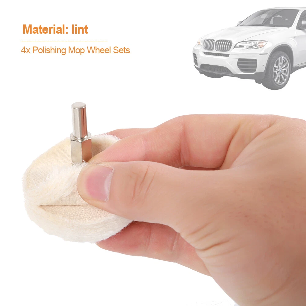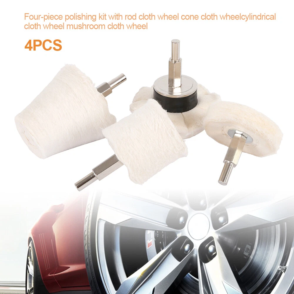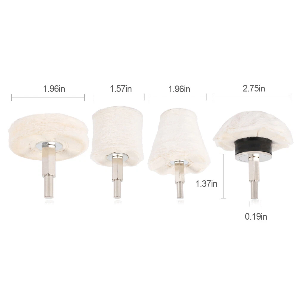 Description Feature: 1.Specially designed for polishing recessed aread such as mag wheels, motorcycle wheels manifolds 2.Use with any drill (drill in photo is not included) 3.Shine your faded wheels, manifolds etc. with this Great PROFESSIONAL GRADE KIT! 4.Shanks are 1/4" round and continue with hex shape so it does not slip on your drill. Specifications Diameter: Conical :50mm, Cylindrical:40 mm, Mushroom: 70mm, Wheel: 50mm Handle diameter: 5mm Handle length: 35mm Material: lint Package include: 4x Polishing Mop Wheel Sets