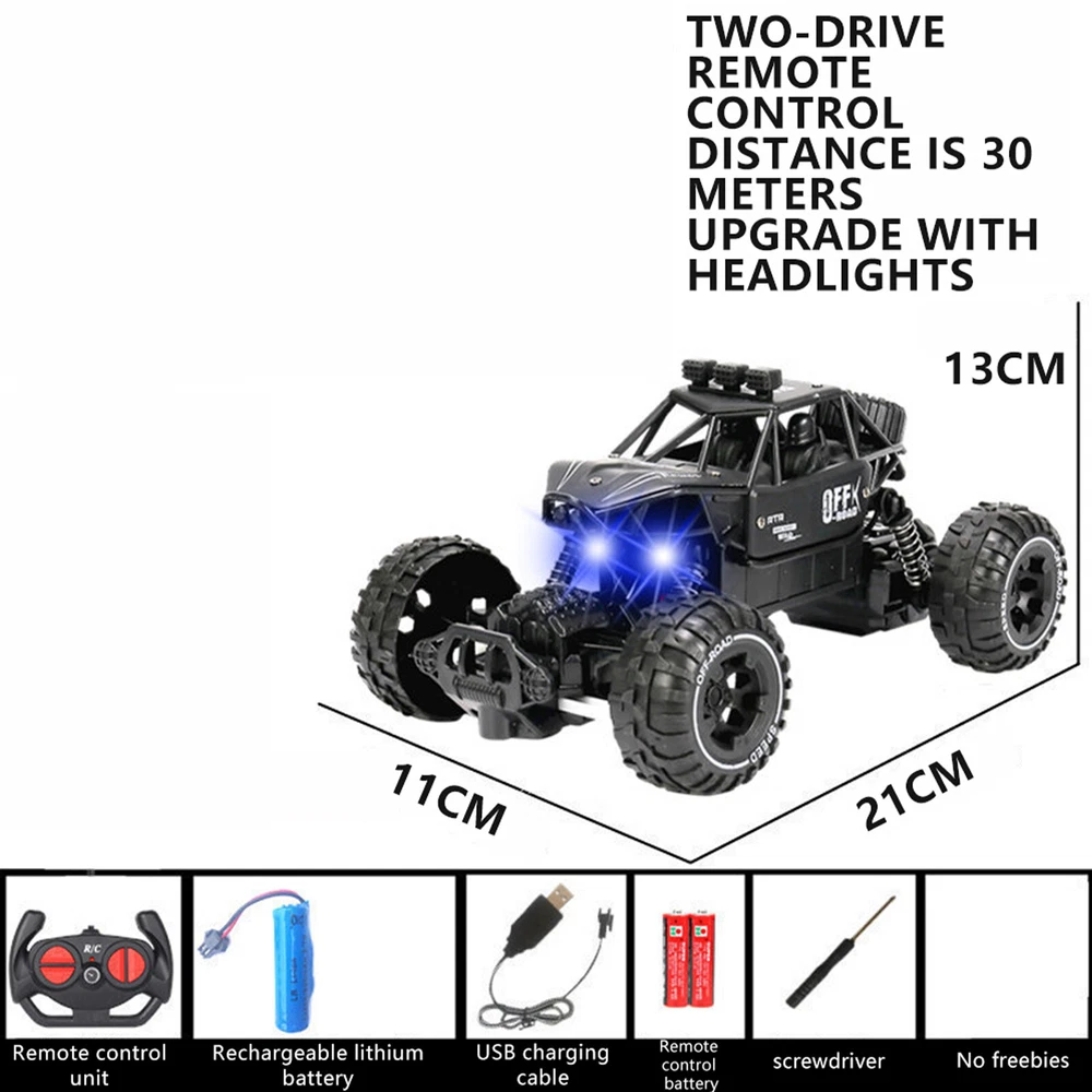 Exciting Remote Control Car Versions for Every Adventurer The 7.87-inch version is a compact option without LED warning flash features, Car Size and Specifications: the 7.87-inch version, measured at a 1:20 scale, operates on a 2WD system, but its remote control range is limited to 10 meters. Please be mindful of these differences when choosing your car. Car size: 21*11*13cm Features for Maximum Fun: These cutting-edge remote control cars are the newest additions to the market, offering various exciting features. With a suspension shockproof system designed to protect the car during rough play, sturdy rubber wheels for an anti-skid experience, and the flexibility to traverse ground, grass, or sand, these cars are perfect for outdoor adventures. Whether you're a child or an adult, these RC cars are guaranteed to provide endless enjoyment and excitement for all ages. Charging time: 2.5h Battery life: 30 minutes Remote control distance: 20 meters Speed: 15km/h Remote control battery: 2 AA batteries not included 100% brand new, high quality. Packing List: 1 x Rc car 1* Transmitter 1* Battery 1* USB cable