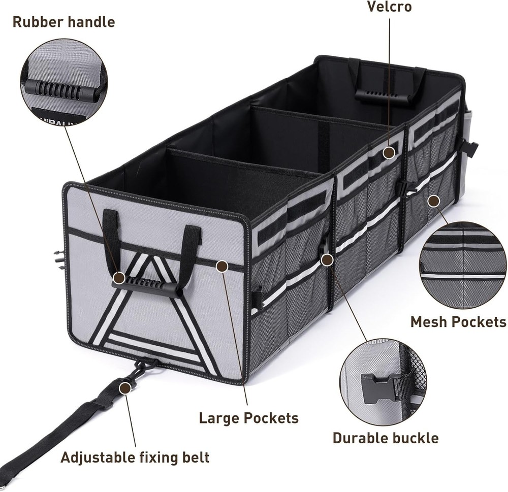 Superior Durability:car trunk organizer is made of premium 1680D Oxford cloth and is well waterproof. Its partition and bottom plate are made of heavy-duty reinforcing plates for better durability and can bear heavy loads 4-in-1 Trunk Organizer with Cooler Bag: Three separate compartments and a thermal insulation bag. It also has 12 side mesh pockets and 2 flip pockets for more storage needs. The independent insulation bag can keep warm or refrigerated Detachable and Foldable: It consists of three compartments in total. You can adjust the storage bag size by adjusting the strong side buckle and removing the divider. It can be folded the same size as a laptop bag, which won't occupy your car space Fixing Belts and Reflective Stripes: Two fixing belts are provided to prevent the organizer from shifting and shaking during long-distance travel. When used at night, the reflective strips can make it easier for us to find the location of the storage bag Wide Range of Uses: Easy to assemble and fold. soft and strong rubber handle for easy carrying. You can take this organizer with you for shopping, traveling, or having a picnic