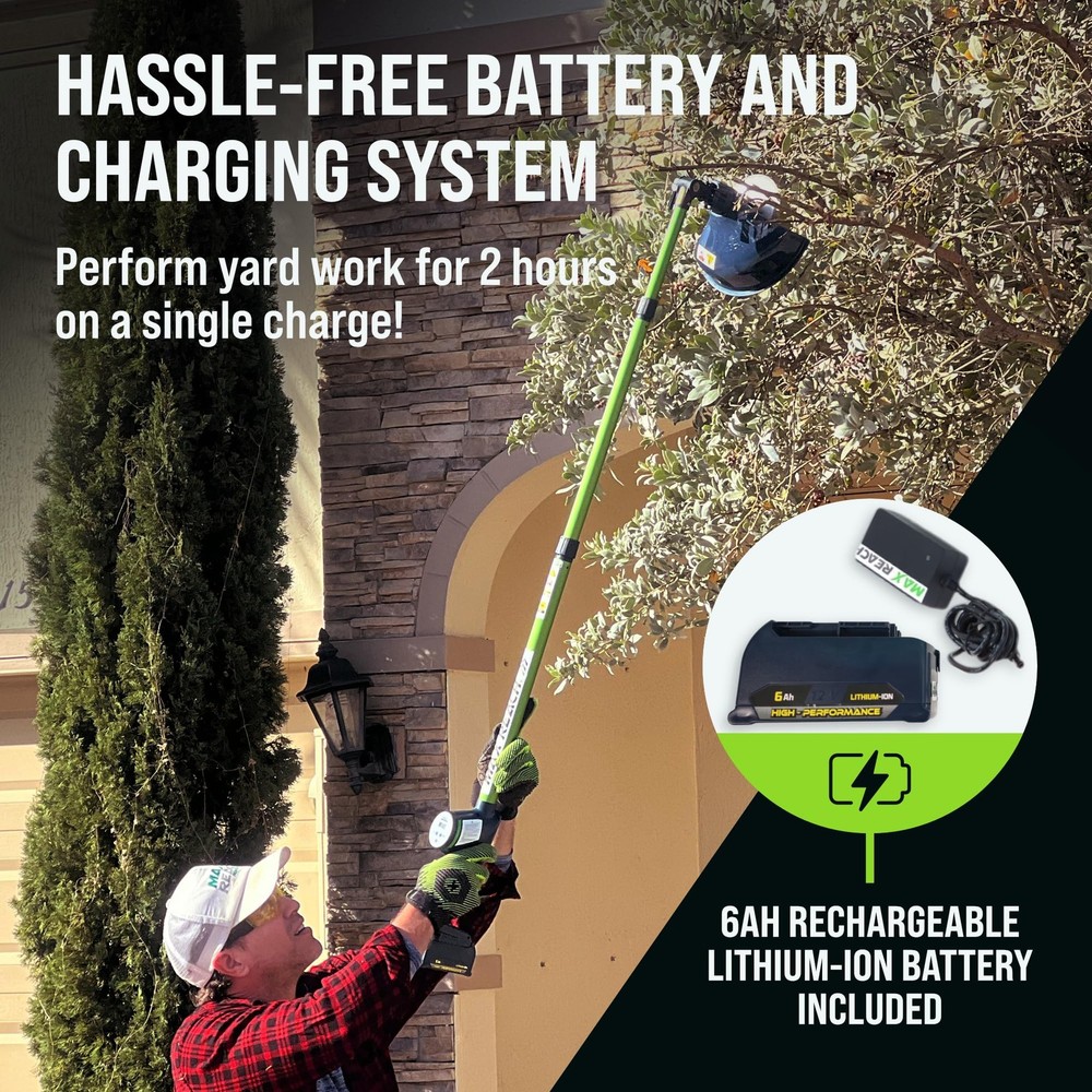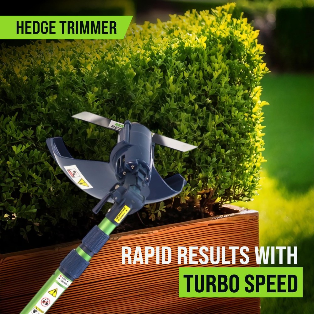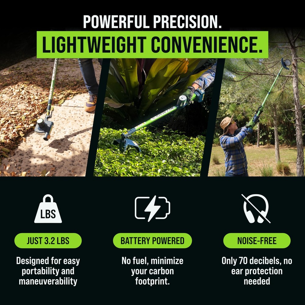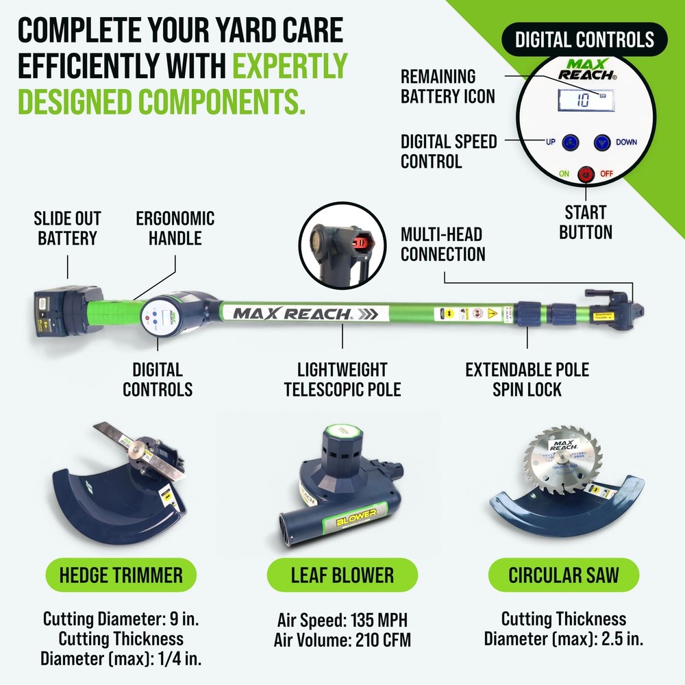 What if your yard work didn’t feel like work at all? Meet the 4-in-1 Cordless Yard Tool, your all-in-one system designed not only to maintain your yard, but to restore your time, your peace, and your joy. Whether you're trimming hedges, cutting small tree branches, blowing leaves off the deck, or edging around flower beds, handles it all with effortless power and surprising ease. Four Functions in One Lightweight Tool: This innovative system includes a hedge trimmer, tree saw, leaf blower, and string trimmer — all attachable to a single ergonomic telescopic pole. Designed for routine yard upkeep, is perfect for homeowners who want to get it done fast, and get on with their day. Lightweight & Telescoping Design: At just 3.2 lbs, is incredibly easy to handle. The extendable pole reaches up to 11 feet, so you can trim trees or tall hedges without ever touching a ladder. Every foot of reach is one less risk. Every ounce saved is more freedom to enjoy. Long-Lasting Battery with No Hassle: Unlike most cordless tools that die after 30 minutes, delivers up to 2 hours of continuous use per charge thanks to its 6Ah lithium-ion battery. No cords. No fuel. No stress. Just uninterrupted productivity and peace. Smart, Safe, and Built to Last We’ve engineered a reverse-thread safety lock that tightens the blade as it spins, not loosens. Plus, our updated nut + washer system ensures secure operation during high-speed tasks. Because performance shouldn’t come at the cost of safety. Quiet & Clean Yard Care With just 70 decibels of noise output, is quiet enough to use anytime, anywhere, even early in the morning or late in the evening. No gas. No fumes. No angry neighbors. Just you and your garden, working together. You deserve tools that work for you, not against you. Tools gives you back your time, your safety, and your joy. 4 Tools in 1 for Total Yard Control , Switch effortlessly between hedge trimmer, pole saw, leaf blower, and string trimmer. One tool, endless possibilities, perfect for routine maintenance and light-duty landscaping. The days of dragging 4 heavy machines are over. Now, you stay grounded, and does the reaching. Hedge Trimmer — Revolutionary One-Blade Patented Elliptical Cut for a smooth, whisper-quiet cut with zero vibration. 11 ft Extendable Reach — Trim tall hedges without ladders or strain. Lightweight at just 1.45 kg (3.2 lbs), perfect for one-handed use. Soft Grip & Wrap-Around Handle — Full comfort and control for vertical and horizontal trimming. Powered by 6.0 Amp battery with up to 2 hours of runtime — ideal for mid-size yards. Because taking care of your home shouldn’t put your back at risk. Turbo-Speed Performance Air Broom — Clear leaves and dust effortlessly from your patio, front yard, and driveway at up to 135 MPH. Built to be silent, smart, and surprisingly strong, all while keeping your peace intact. Cordless Freedom with Long Battery Life, Includes a 6Ah rechargeable battery (upgradeable to 10Ah) for up to 2 hours of continuous work. No cords, no gas, no interruptions, just uninterrupted freedom to finish fast and enjoy your day. Whisper-Quiet & Low Maintenance. Built for modern users, this noise-free, eco-friendly tool eliminates the bulk, fuel, and upkeep of traditional gas yard tools. Quiet enough to hear the birds, and enjoy your garden while working in it.