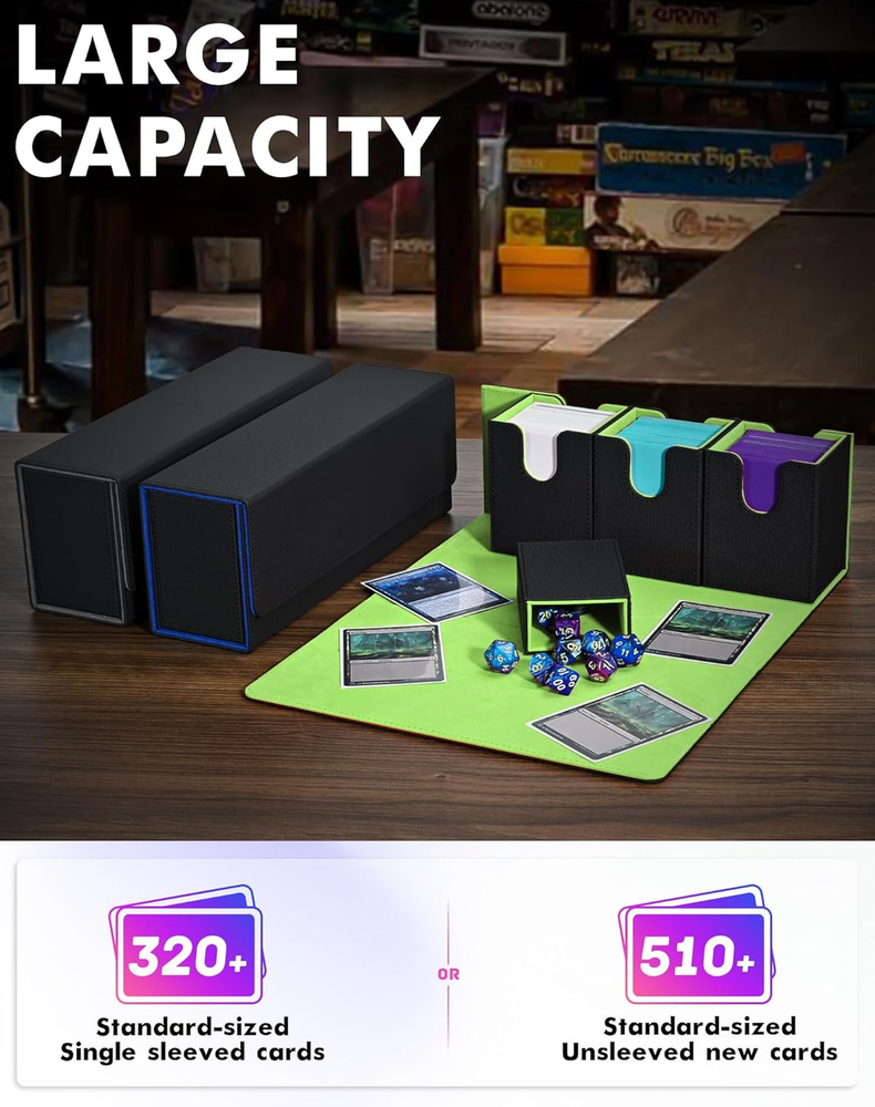 This storage box is a game-changer for MTG and TCG players! The compact yet spacious design holds multiple decks and dice neatly, while the microfiber lining keeps cards safe. The built-in dice tray is super convenient, and the sturdy construction makes it perfect for travel. Love how everything fits together seamlesslyโno more scattered cards or lost tokens. Highly recommend for anyone who wants organized, portable storage without sacrificing quality. A must-have for serious collectors and casual players alike!
