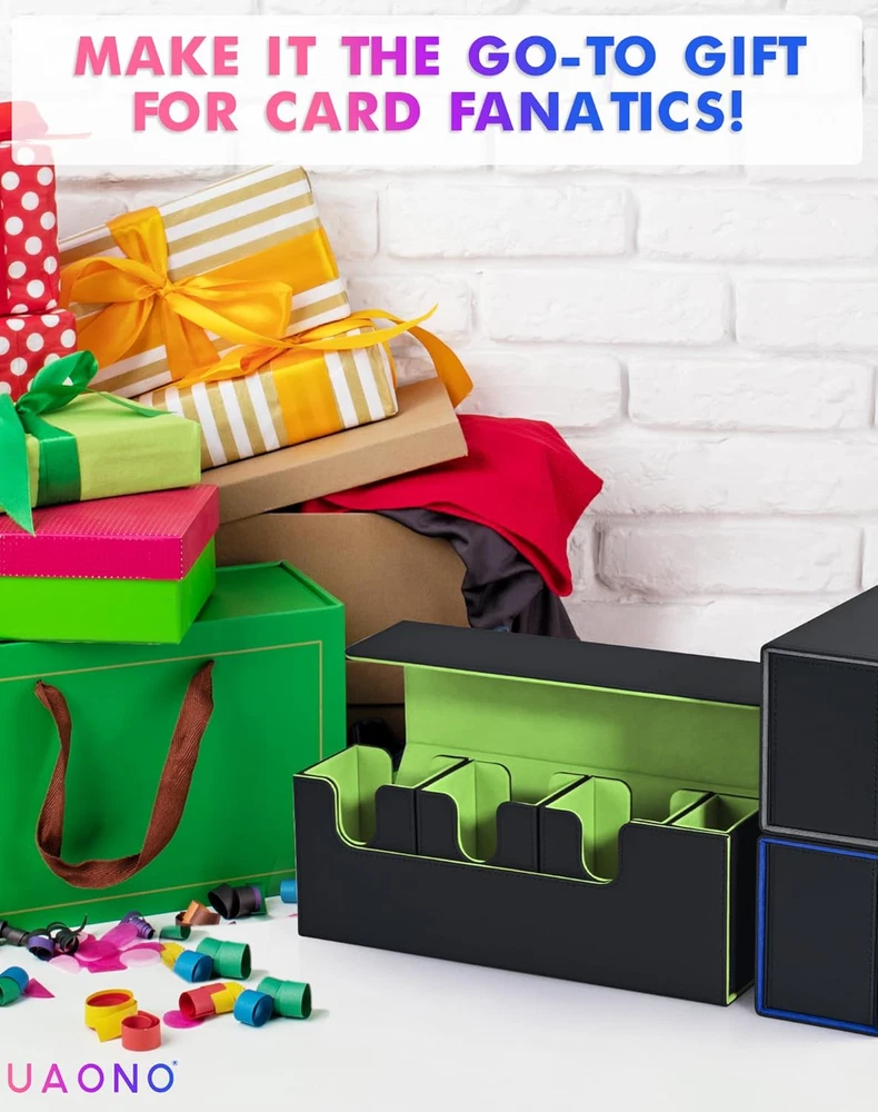 4 ๐ข๐ง ๐ ๐๐๐ซ๐ ๐๐ญ๐จ๐ซ๐๐ ๐ ๐๐จ๐ฑ๏ผUAONO card deck box is a system of 3 deck boxes, a dice/token box, and a cover/mat that all combine into a single item for storage/travel. Each little card storage box measures approx. 3.1 x 2.7 x 3.9 inches and the size of the dice box is 2.7*1.5*3.9. Excellent organizational accessory for most card games and many card-heavy board games. If you are into collecting cards or playing card games and need storage this is a great box. ๐๐ฎ๐ซ๐๐๐ฅ๐ ๐๐ง๐ ๐๐ข๐ ๐ก-๐๐ฎ๐๐ฅ๐ข๐ญ๐ฒ ๐๐๐ญ๐๐ซ๐ข๐๐ฅ๏ผThe inner microfiber lining is soft and great for preventing scuffs and scratches and the outer "rubbery" surface protects the cards well and also provides anti-slip of the mat when placed down to play with, and it even can be doubled as a playmat if you forgot yours at home. Durable materials and superb craftsmanship make it have a very long service life. ๐๐จ๐ฅ๐๐ฌ ๐๐๐+ ๐๐ฅ๐๐๐ฏ๐๐ ๐๐๐ซ๐๐ฌ๏ผThis card storage box set is large enough to fit three sleeved commander decks plus either some dice or some side cards to swap out. Each individual deck box can fit 80 card double-sleeved decks easily. This is a great way to carry multiple decks along with dice and tokens to any Card Game Night. Please note that, works with double-sleeve and single-sleeve cards, but not top loader sleeves. ๐๐๐ ๐ง๐๐ญ๐ข๐ ๐๐ฅ๐จ๐ฌ๐ฎ๐ซ๐ ๐๐๐ฌ๐ข๐ ๐ง - The magnets hold the card boxes in place and are strong enough to prevent them from shuffling around but not too strong that it makes it difficult to detach, the small card box can be easily removed or assembled. You can roll out the lid and remove the deck boxes to have a mini play mat to play on. One thing to note is that the dice holder will need to remain in place, as the magnets in that area are a bit different and will not hold other boxes. ๐๐ฑ๐ญ๐๐ง๐ฌ๐ข๐ฏ๐ ๐๐จ๐ฆ๐ฉ๐๐ญ๐ข๐๐ข๐ฅ๐ข๐ญ๐ฒ - Our deck card boxes are well-built and versatile, and offer ample storage space for all of your gaming needs. You can able to bring three separate decks, even for different games, wherever you go. You were able to bring a Magic, YuGiOh!, and Digimon deck with you to a buddy's house for an evening of gaming. The fourth bin holds various tokens and dice. If you looking for an inexpensive, good-looking large box you can't go wrong with this. Product Description