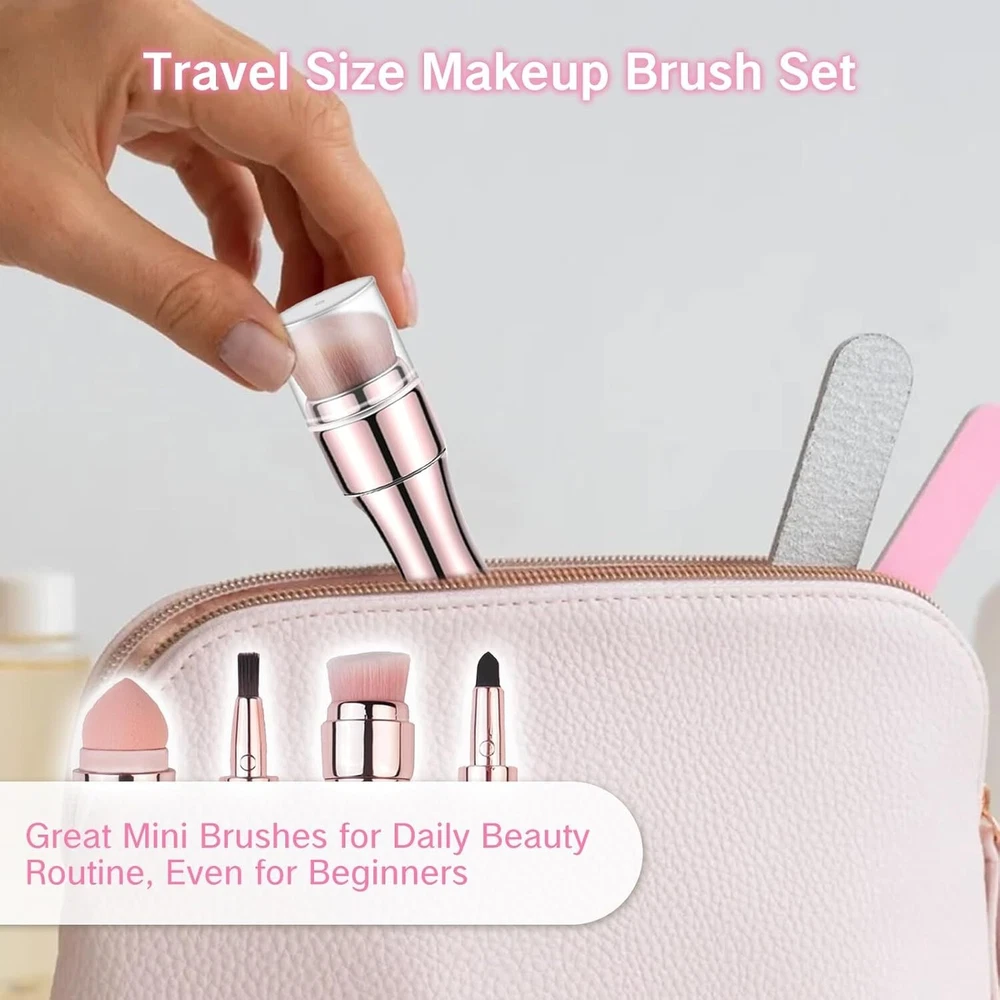 4-in-1 Makeup Brush Set: This premium double-ended retractable brush offers four essential beauty tools in overall. It includes a lip brush, eye brush, eyebrow brush, and face brush, making it ideal for applying cream, liquid, or powder cosmetics for a flawless finish Convenient Travel Size: Designed for easy portability, this mini makeup brush set is a practical tool for daily beauty routines, even for beginners. The set includes four compact brushes, making it ideal for touch-ups on the go Retractable Design for Protection: The retractable handle allows you to extend or retract the brush for easy storage and protection of the bristles, ensuring they remain undamaged. It’s great for frequent travelers and anyone looking to maintain their brushes on the go Great Present: This rose gold mini makeup brush set makes an elegant and functional present. Ideal for applying liquids, powders, or creams, the set is a thoughtful present for your girlfriend, wife, mom, or friend, making any occasion extra special Compact and Functional: These sturdy yet stylish mini travel makeup brushes are designed for easy storage in bags or purses, making them the ultimate beauty essential. Ideal for those looking to create natural makeup looks while on the move