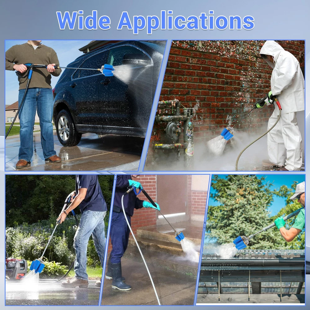 【Innovative Upgrade】Quadruple pressure washer turbo nozzle adds a row of dual turbo nozzle on the basis of the dual nozzle, and the spray range is four times that of the single rotating pressure washer nozzle, greatly increasing the spray range and water flow. With a powerful flow of water, 4-in-1 power washer turbo nozzle can quickly and effectively remove stubborn stains on a variety of surfaces, making it the ideal and reliable choice for your cleaning job. 【Wide Application】4-in-1 pressure washer turbo tip is very versatile, it is suitable for a variety of cleaning scenarios, can well meet your needs for fast and efficient cleaning. Pressure washing turbo nozzle can help you easily clean stubborn dirt on various surfaces, and you can use it to clean heavily polluted places such as cars, floors, driveways, walls, decks, etc. turbo nozzle pressure washer 4000 psi will be the best choice for home and commercial cleaning. 【Excellent Quality】Pressure washer rotating nozzle is made of 304 stainless steel, heavy duty solid brass and high quality plastic, which is not easy to rust, non-leakage, corrosion and drop resistance, and has a long service life. Each nozzle orifice size is 2.0, max working pressure is 4000 PSI, max working temperature is 140 ℉/60 ℃ and the gallons per minute is 8.0-12.0. You can rest assured to choose this turbine nozzle, Quadruple rotating turbo nozzle will be a good helper for your cleaning work. 【Easy Connection】Quadruple turbo tip for pressure washer uses a 1/4" quick connection, which can be easily and quickly connected to or disconnected from your pressure washer gun and wand. Turbo pressure washer nozzle is suitable for most pressure washer guns and wands, and provides a strong and steady flow of water to help you clean quickly and effectively. 【Product Quality】is a professional supplier of pressure washer products. We offer a diverse selection of reliable pressure washers designed to meet various needs. Our products are crafted with attention to performance and durability, ensuring they effectively handle your cleaning tasks.